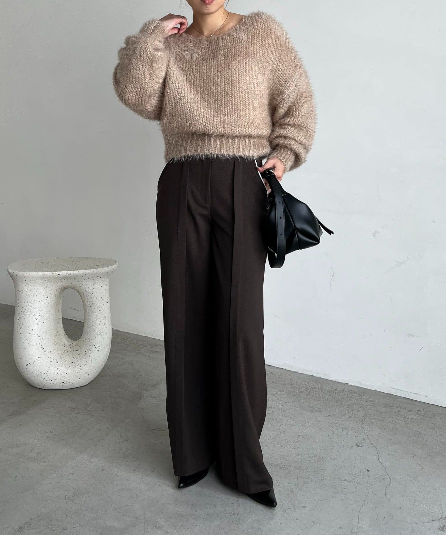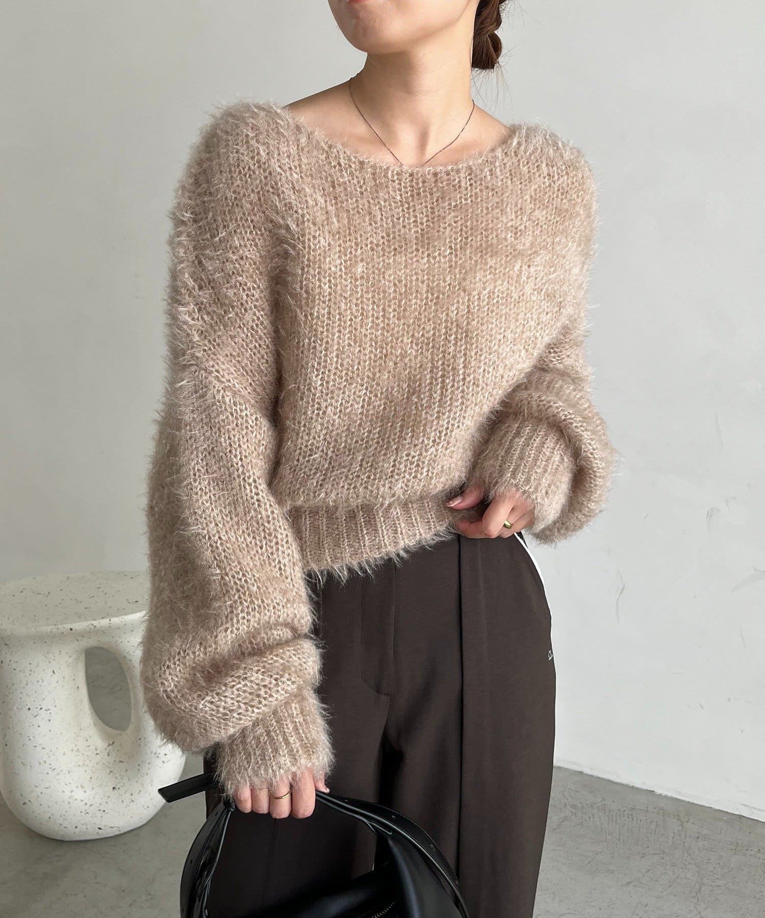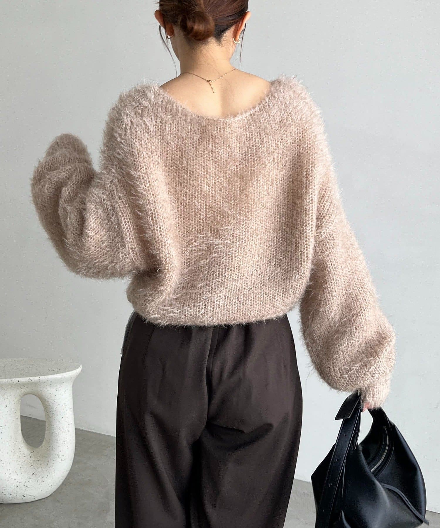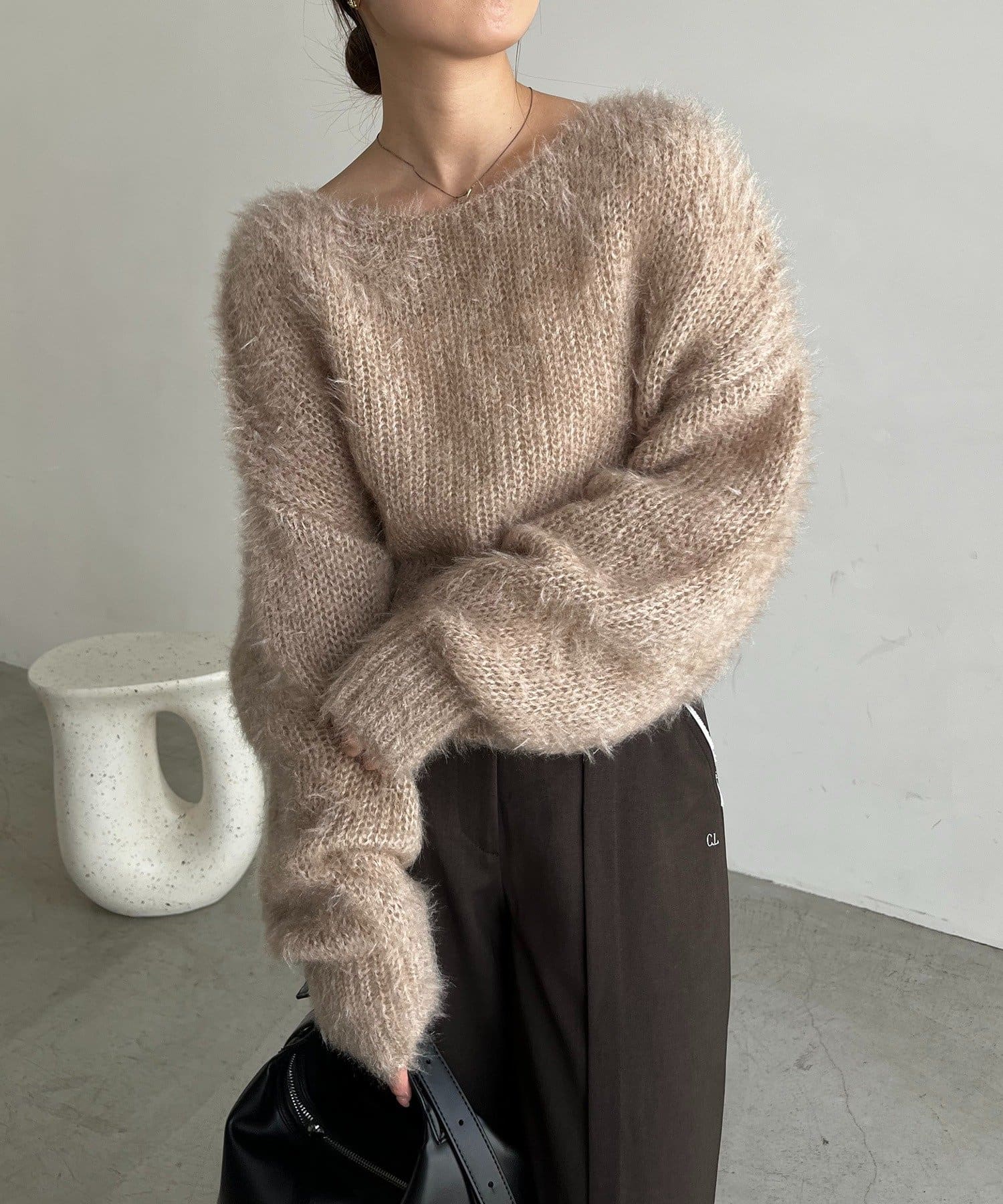 毛足の長いフェザーとゆるいシルエットが女性らしさをプラス