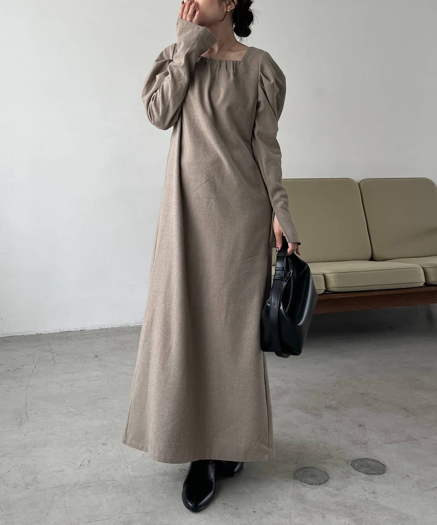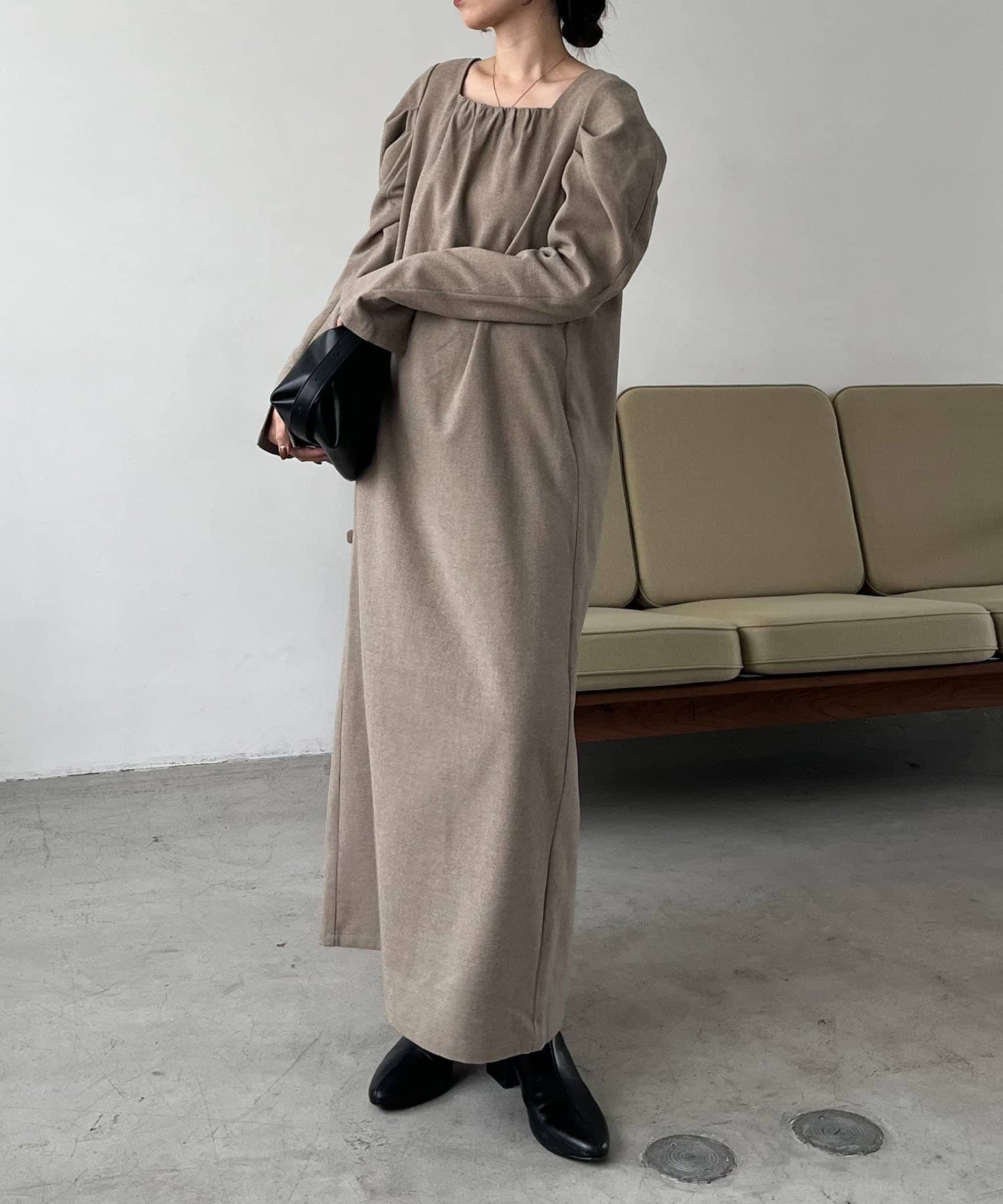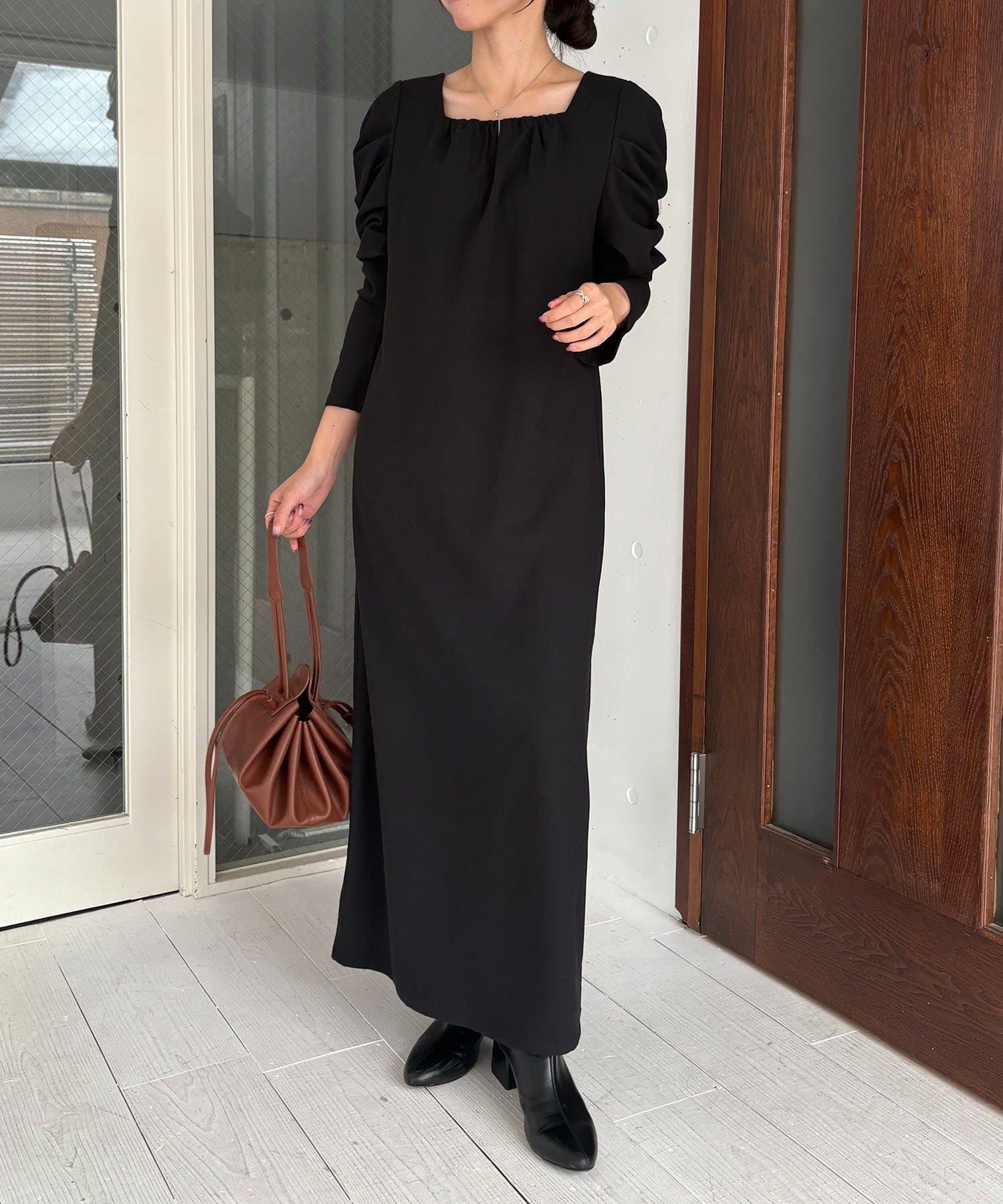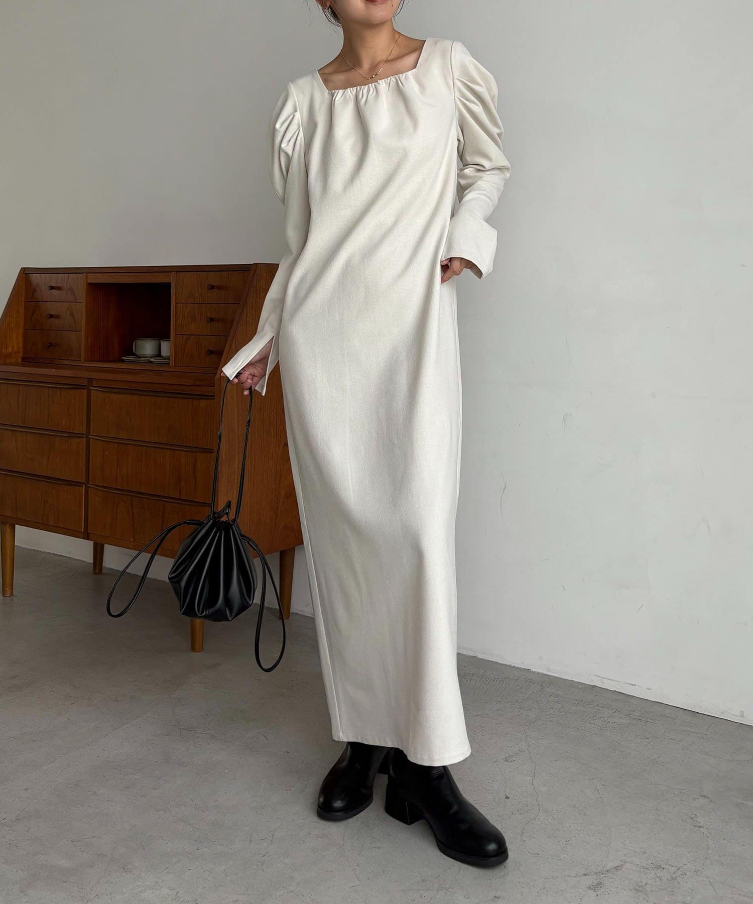 女性らしく抜け感のあるスクエアネックのワンピース