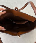 生地は柔らかくありながら、しっかりしています。持ち手の部分が長めなのでこれからの季節分厚いニットなどにもかけやすそうでした。濃い茶色とパイピングのデザインがとても可愛くて気に入りました。