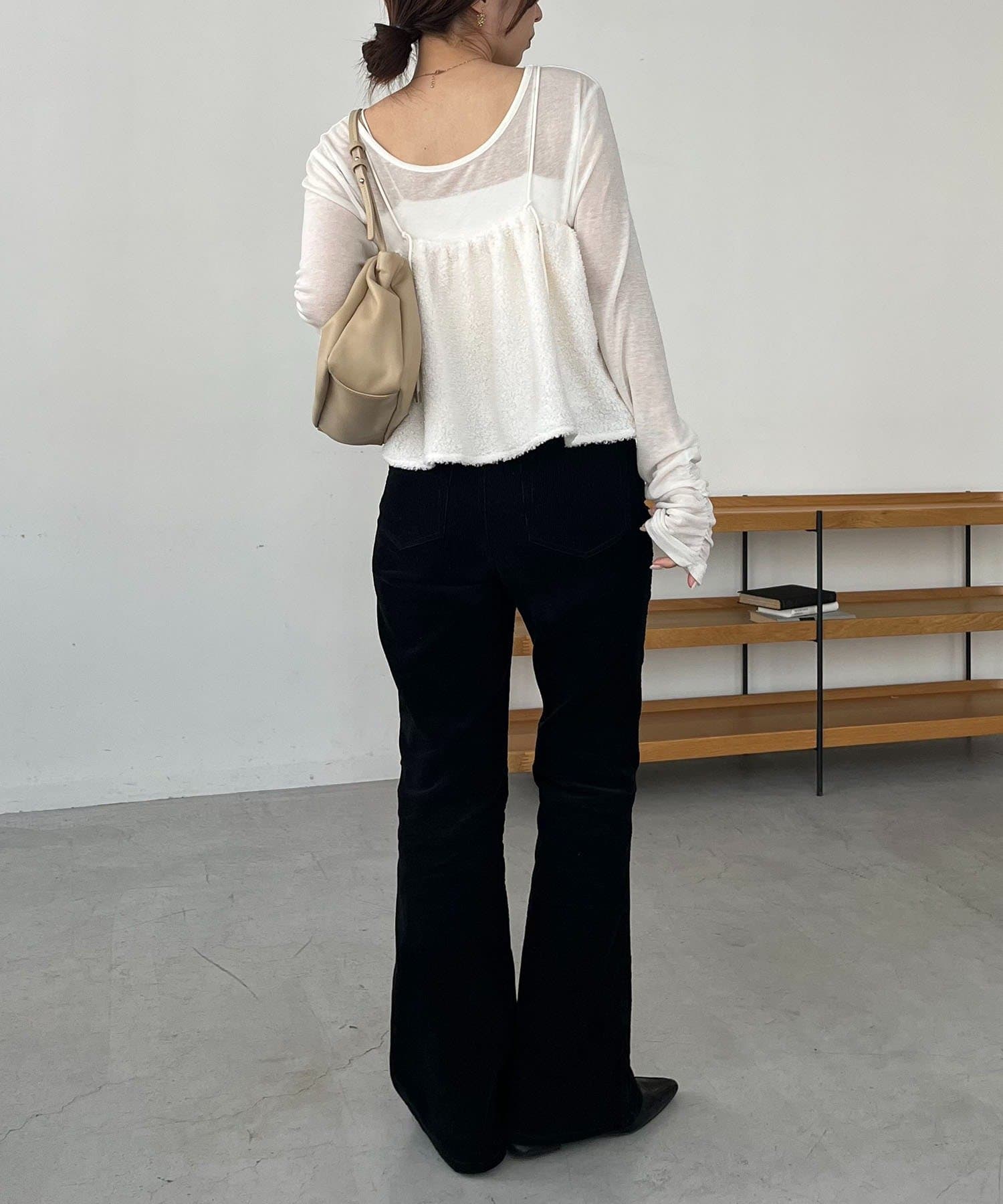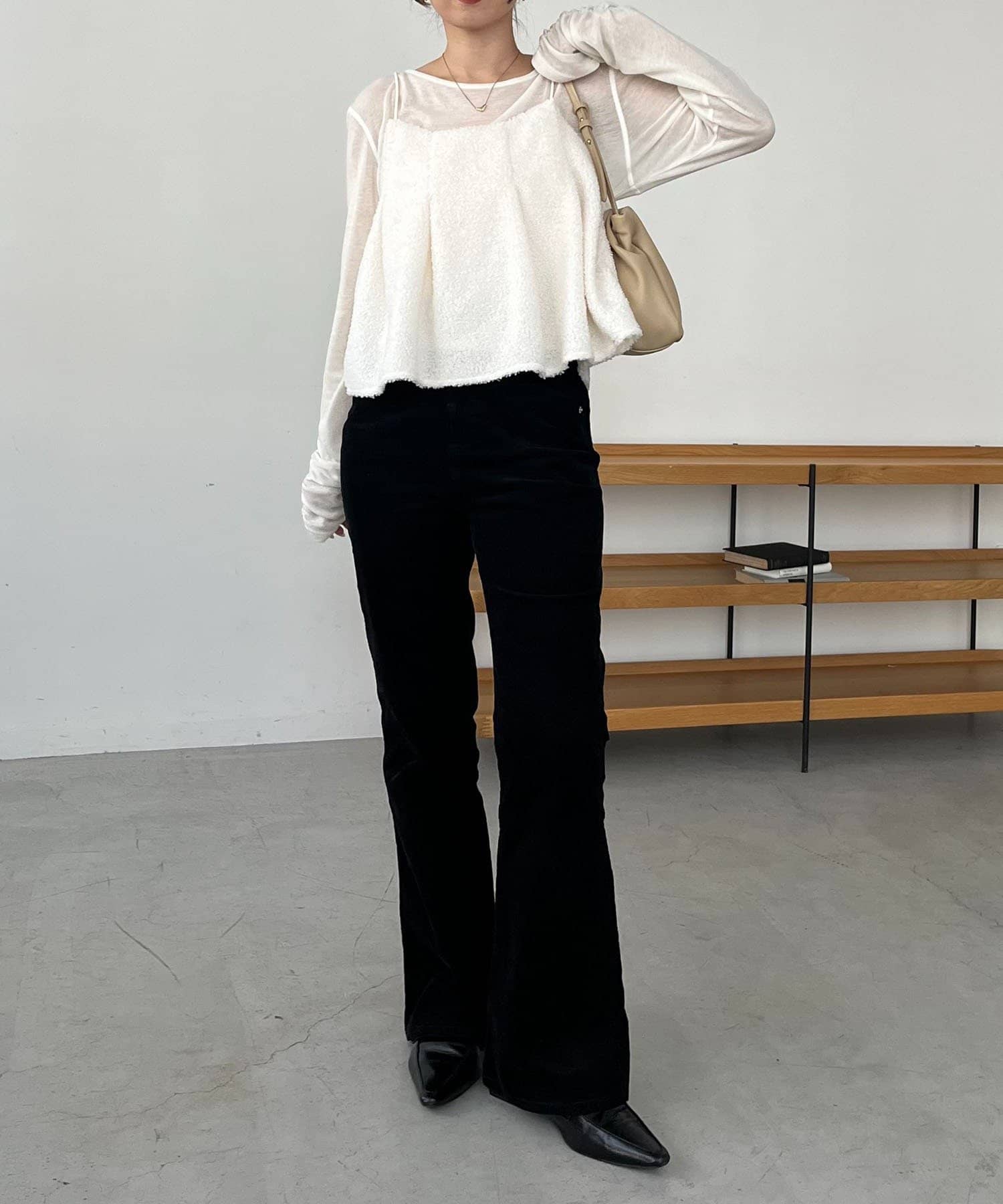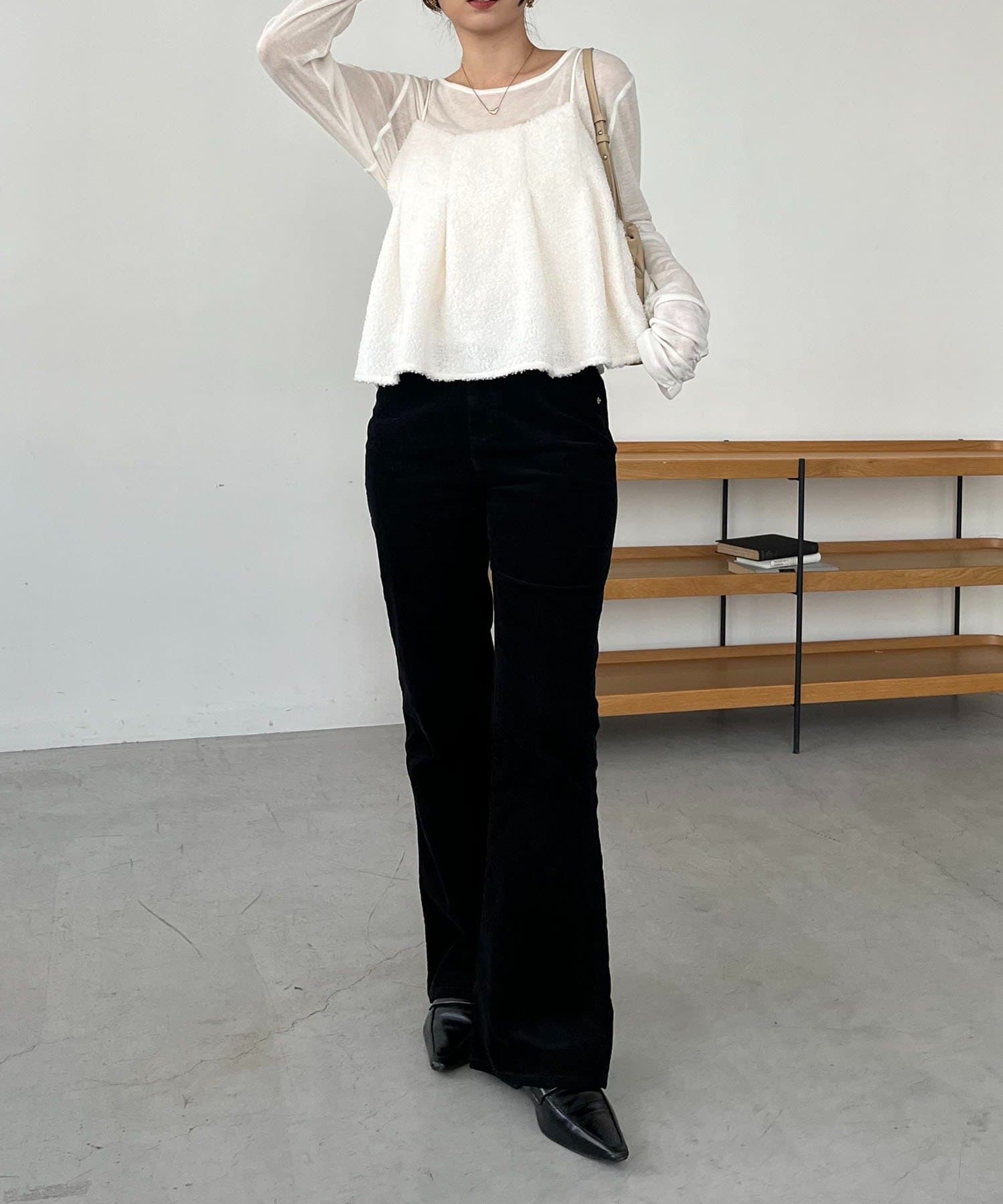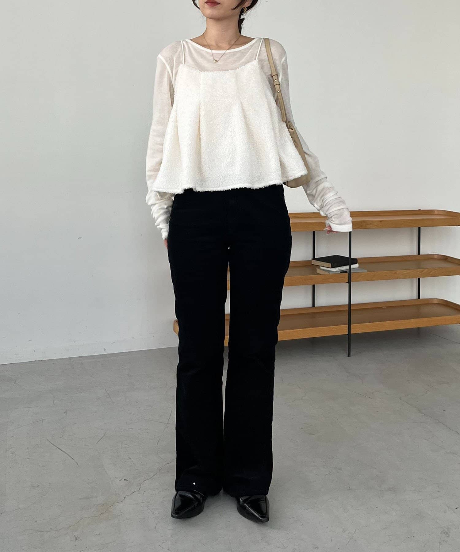 【ホワイト着用アイテム】inner:テンセルウール袖ギャザーロンT、pants:コーデュロイフレアパンツ