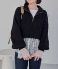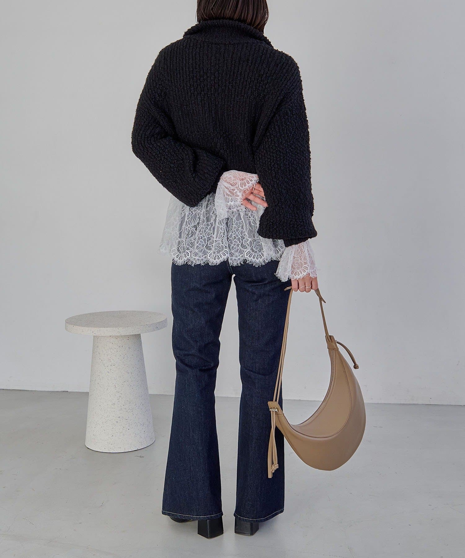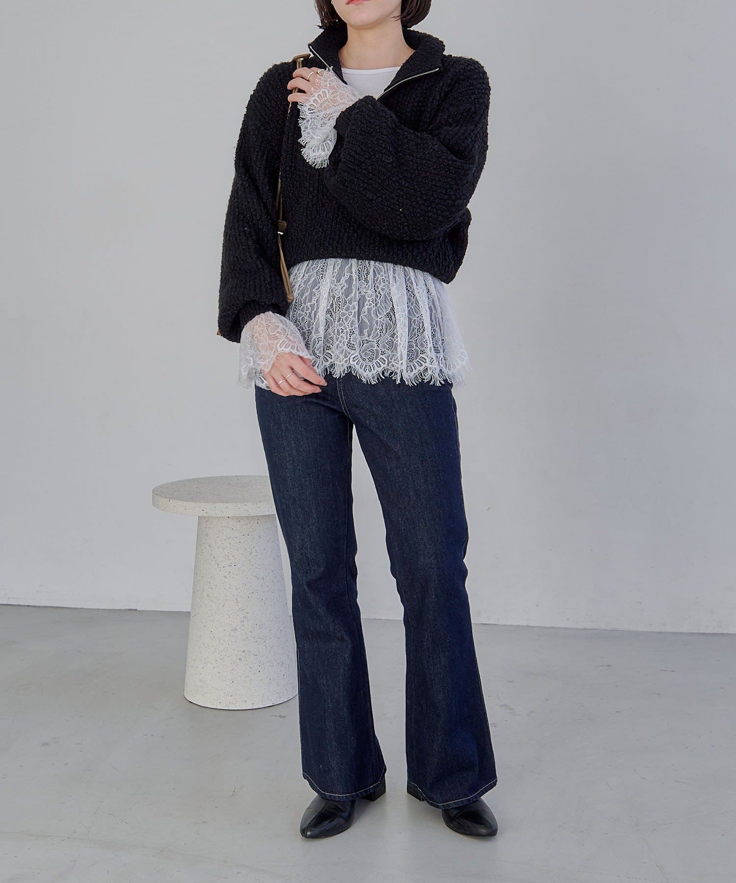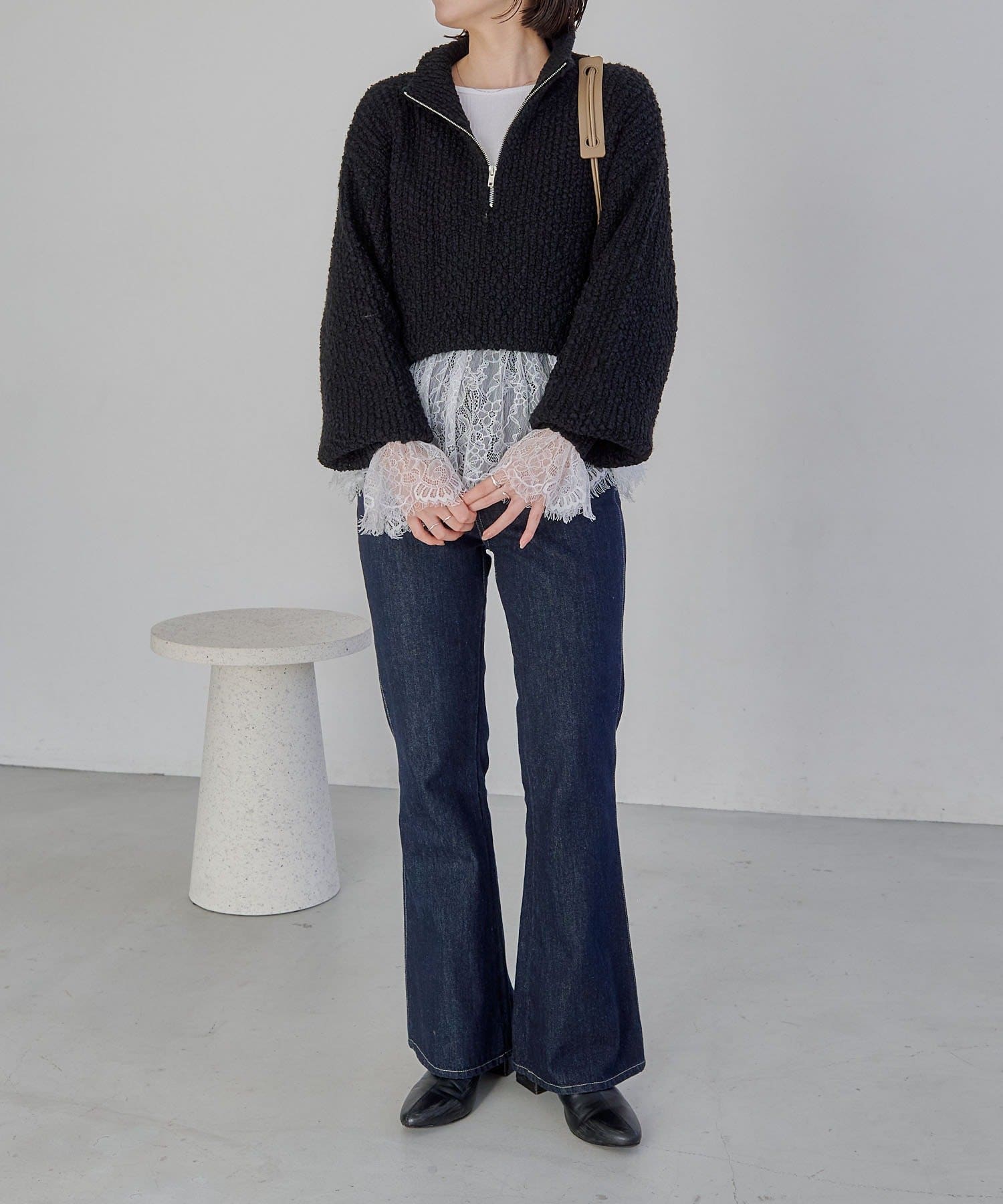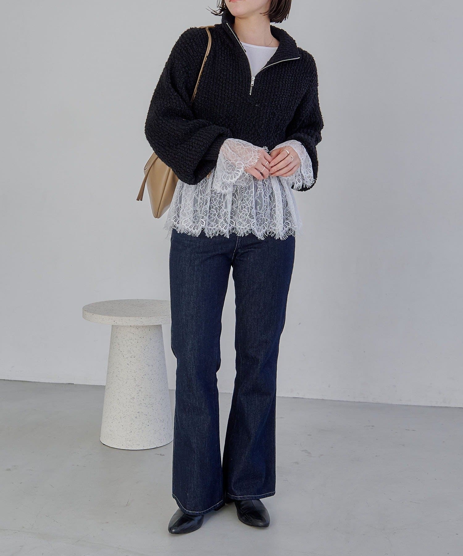 【ホワイト着用アイテム②】tops:ハーフジップニット denim:フレアデニム