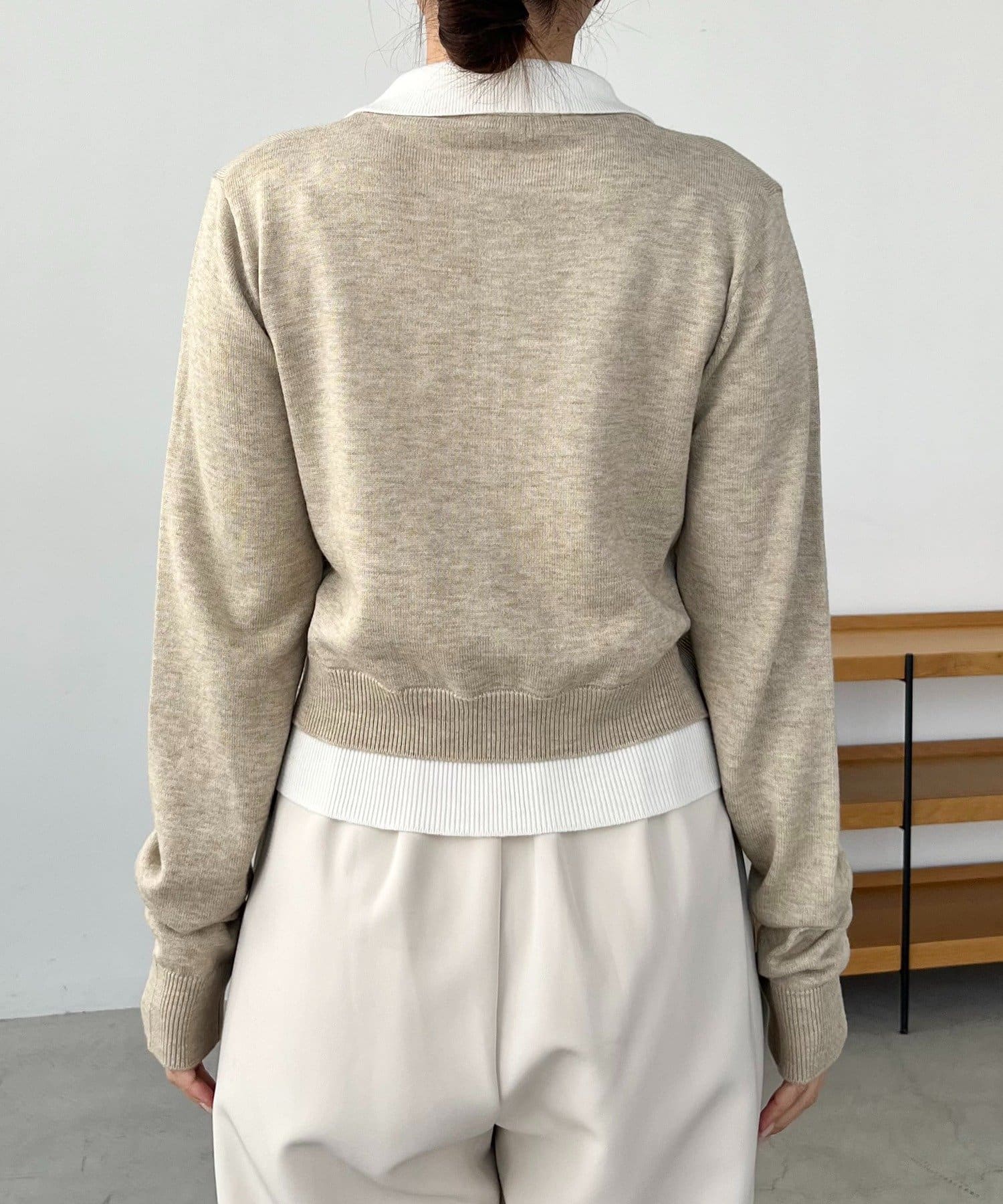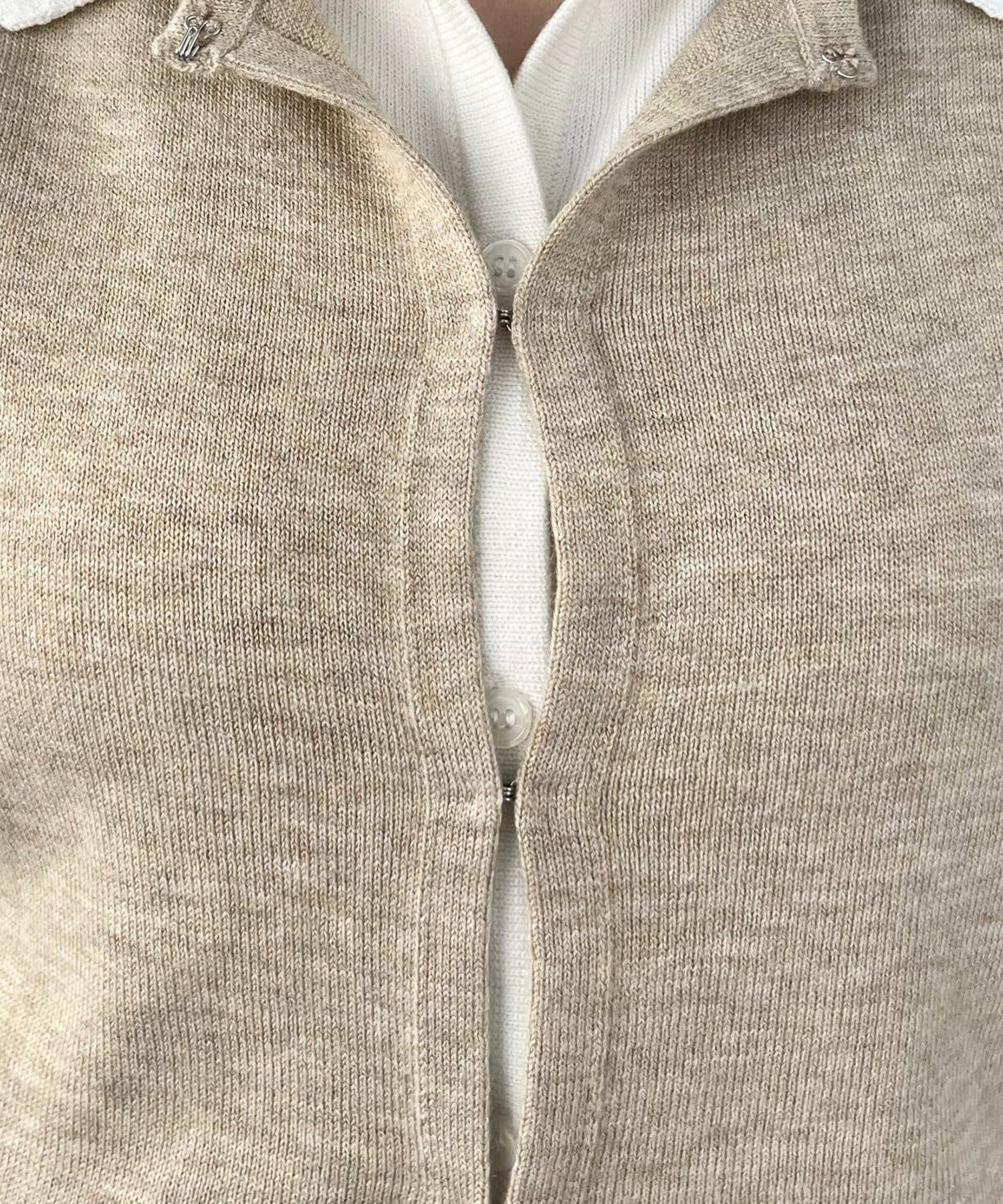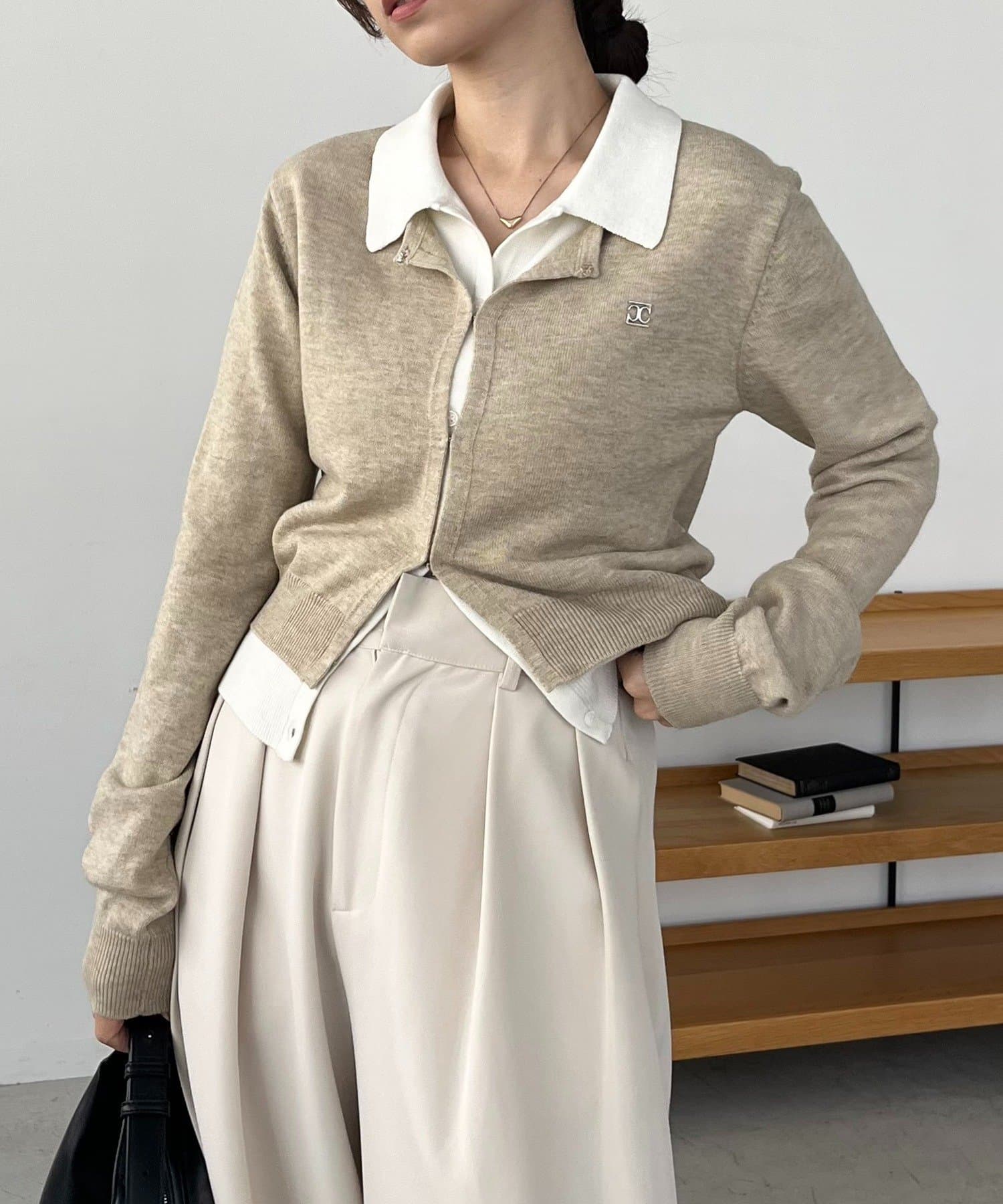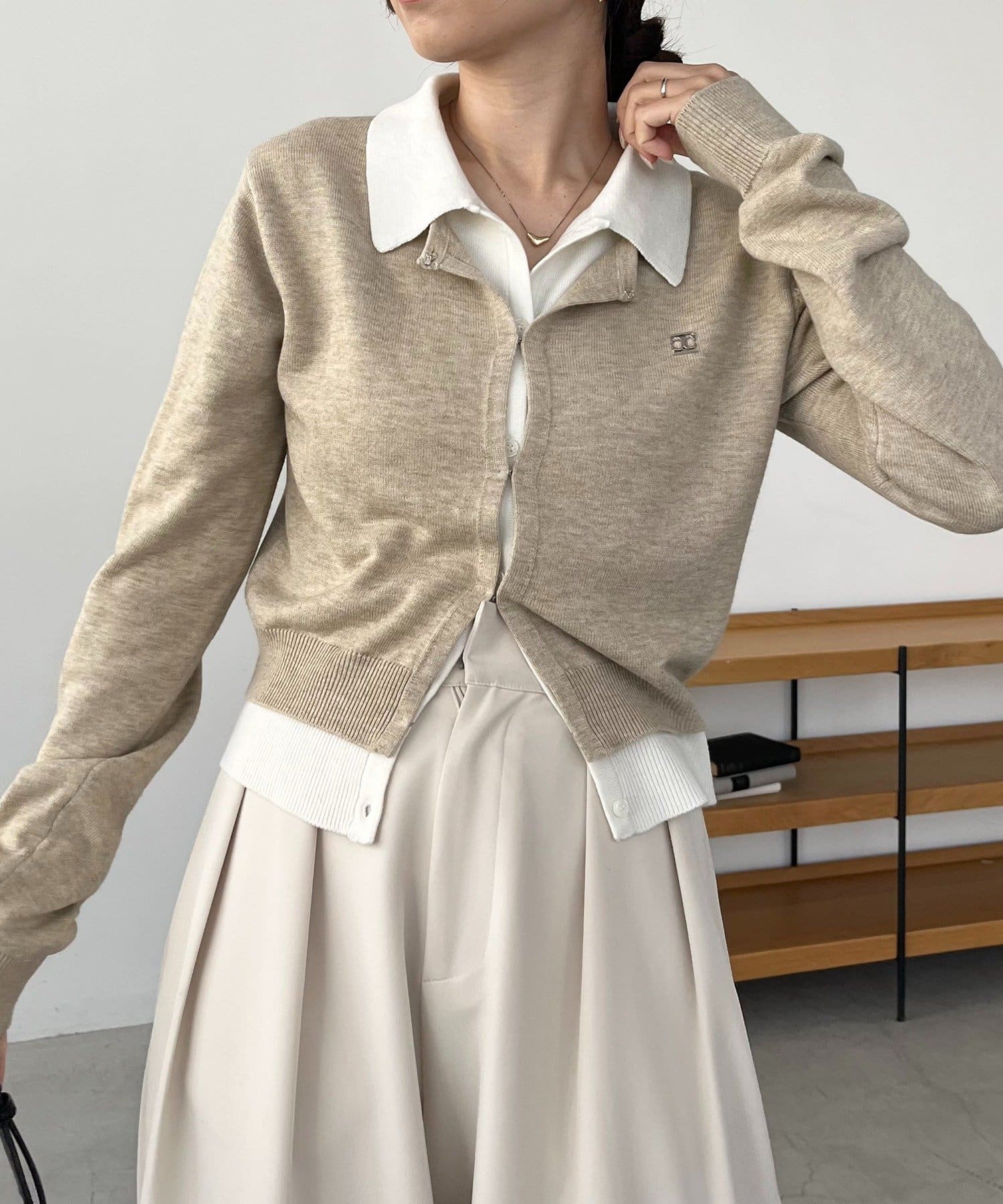 ・襟付きニットにホックカーディガンをレイヤードした着映えする1枚