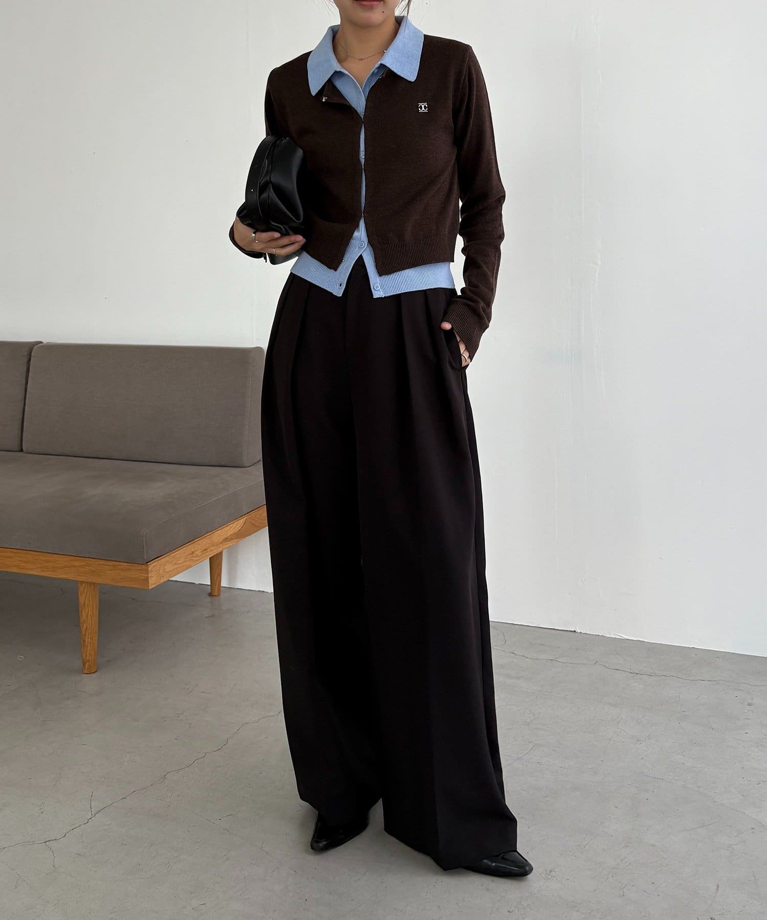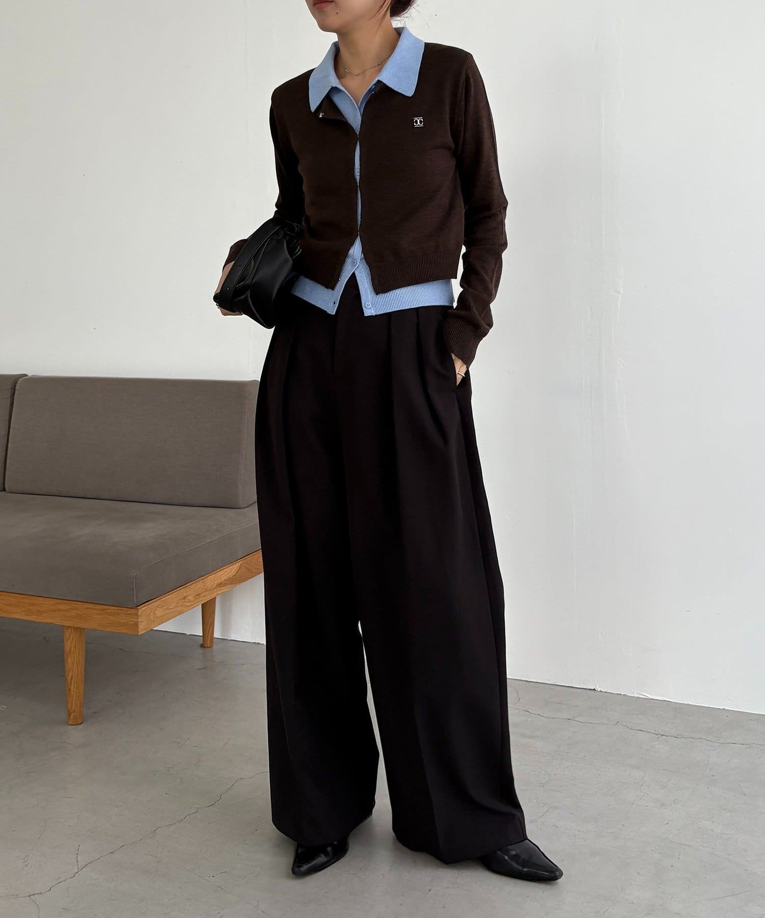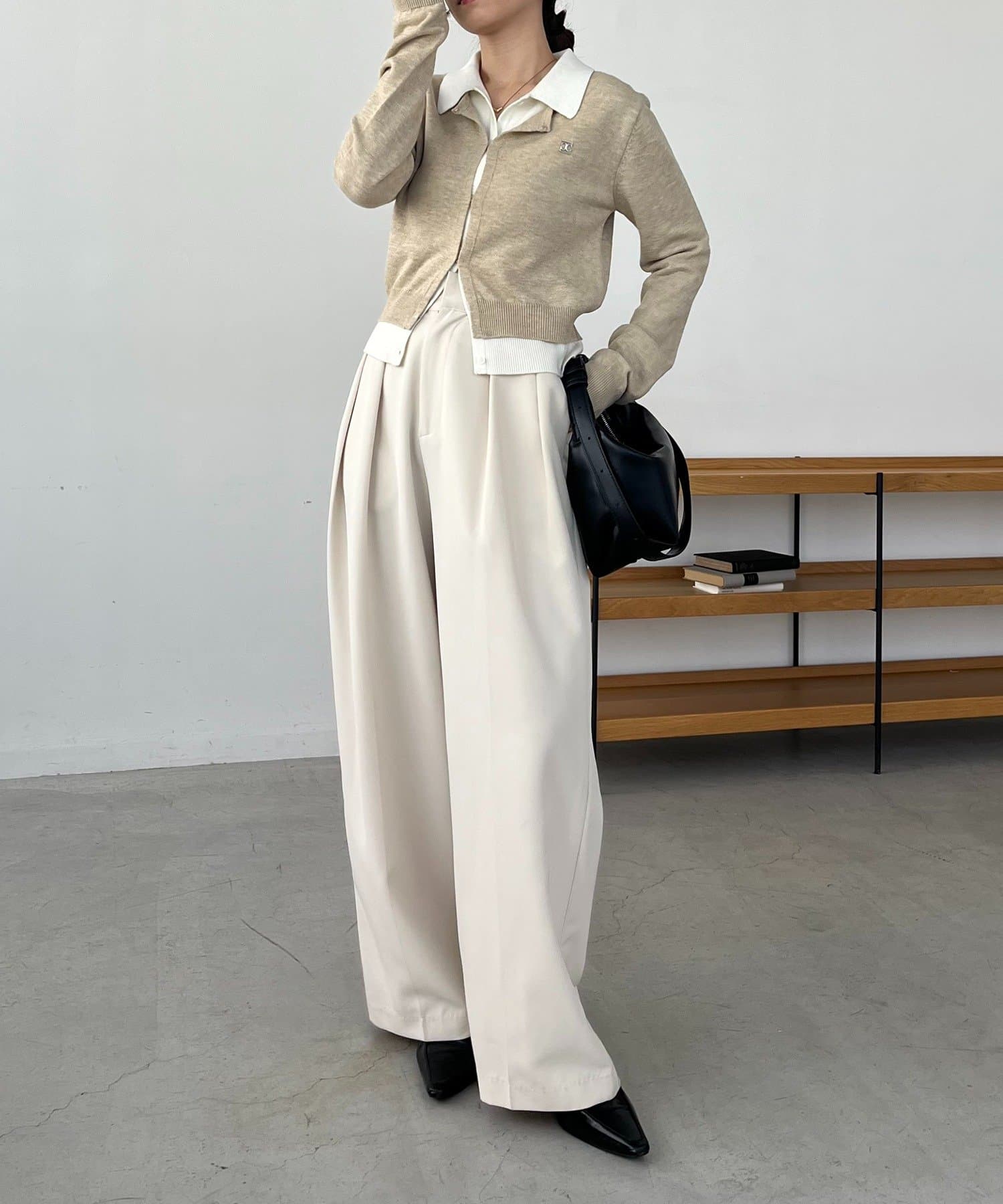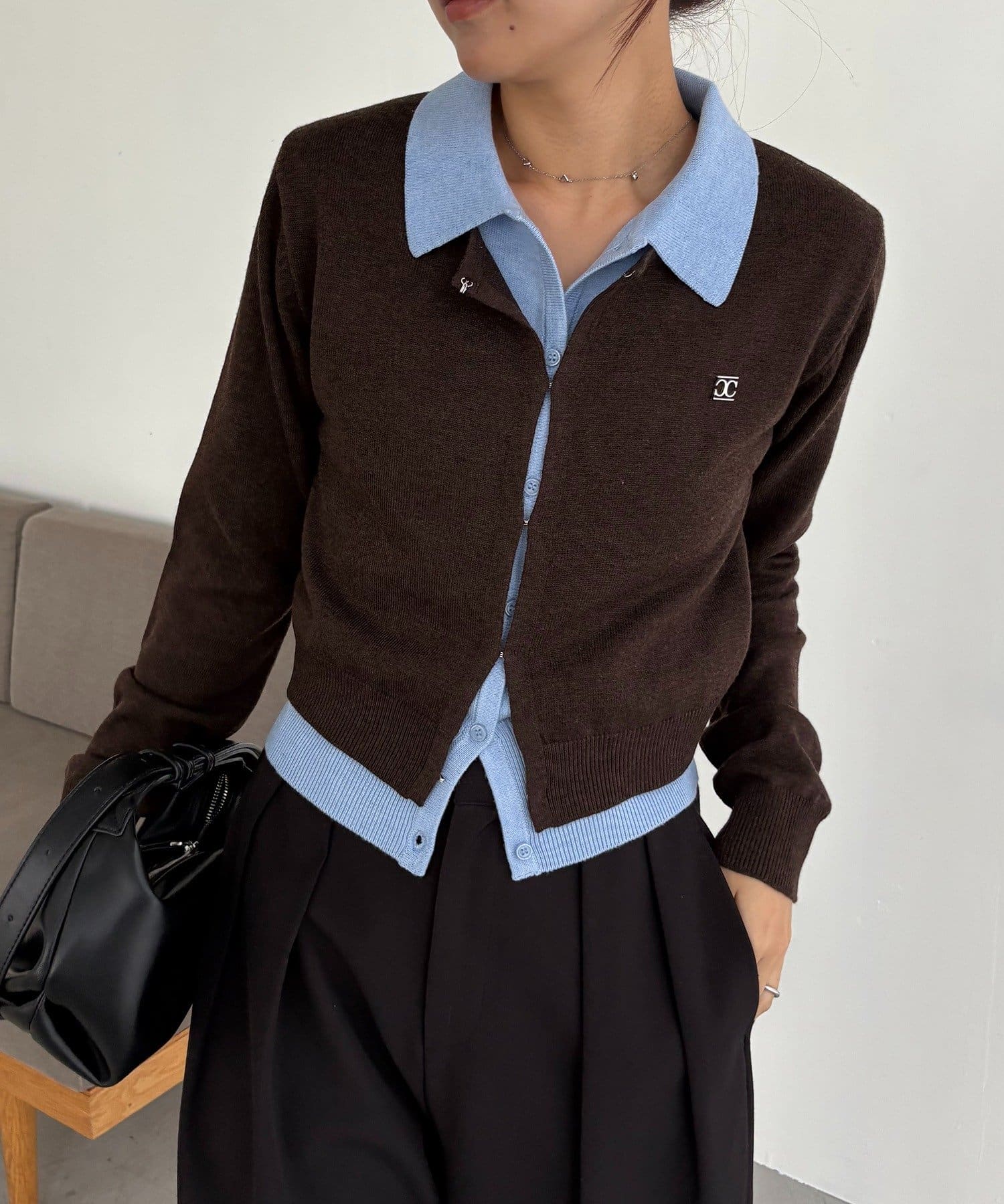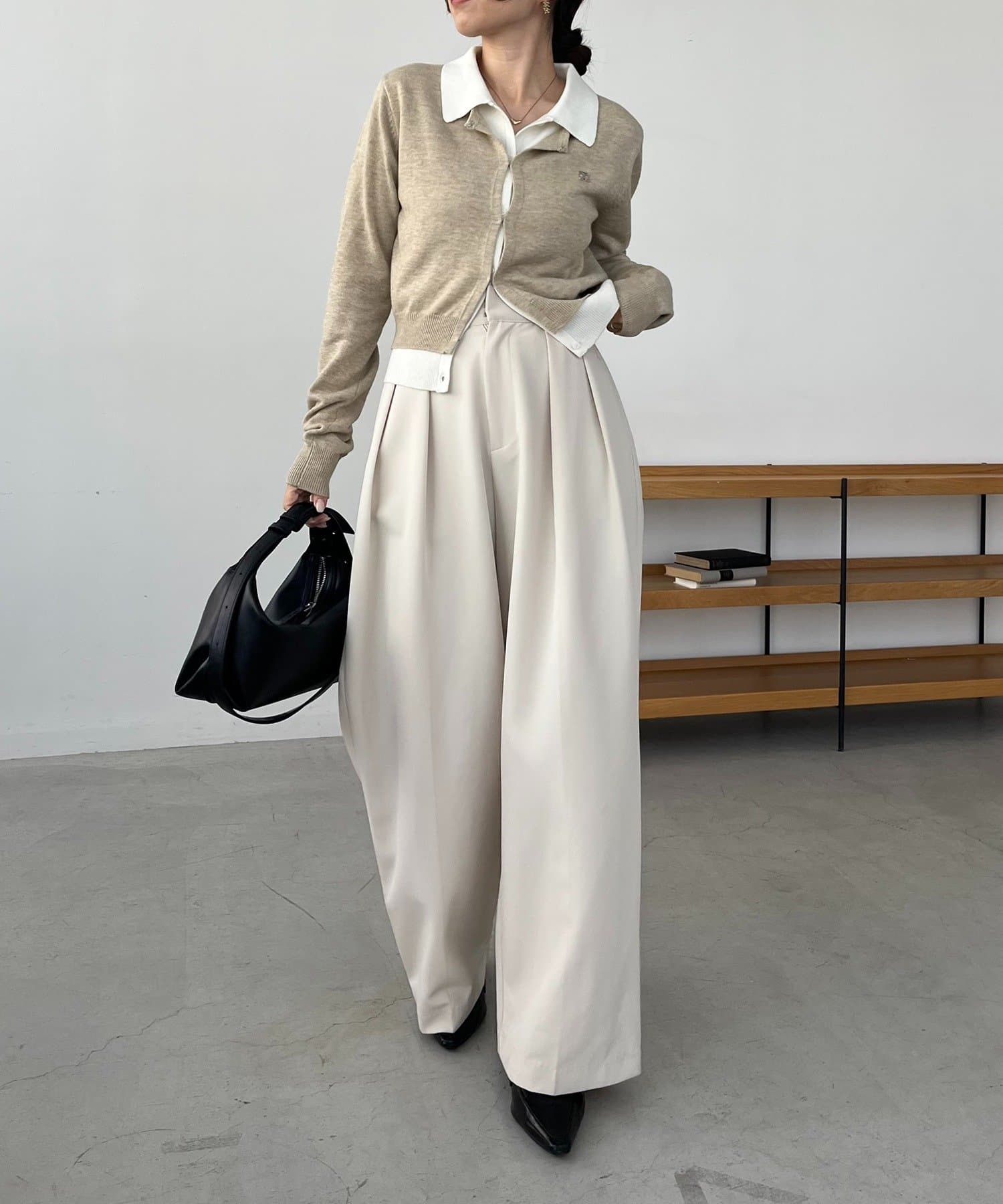 ・襟付きニットにホックカーディガンをレイヤードした着映えする1枚