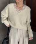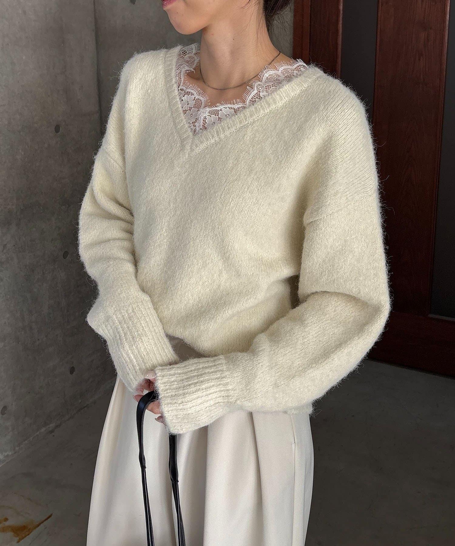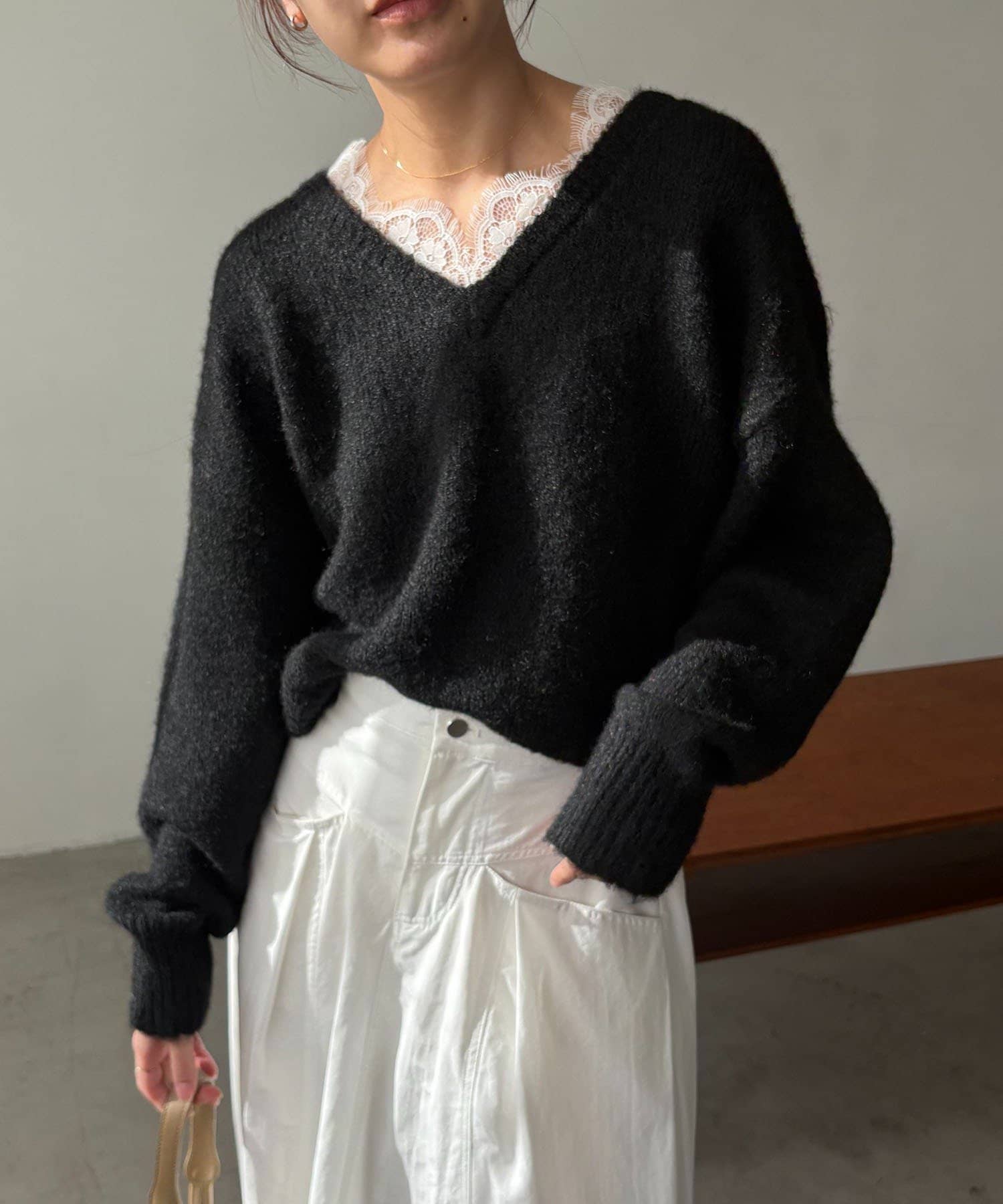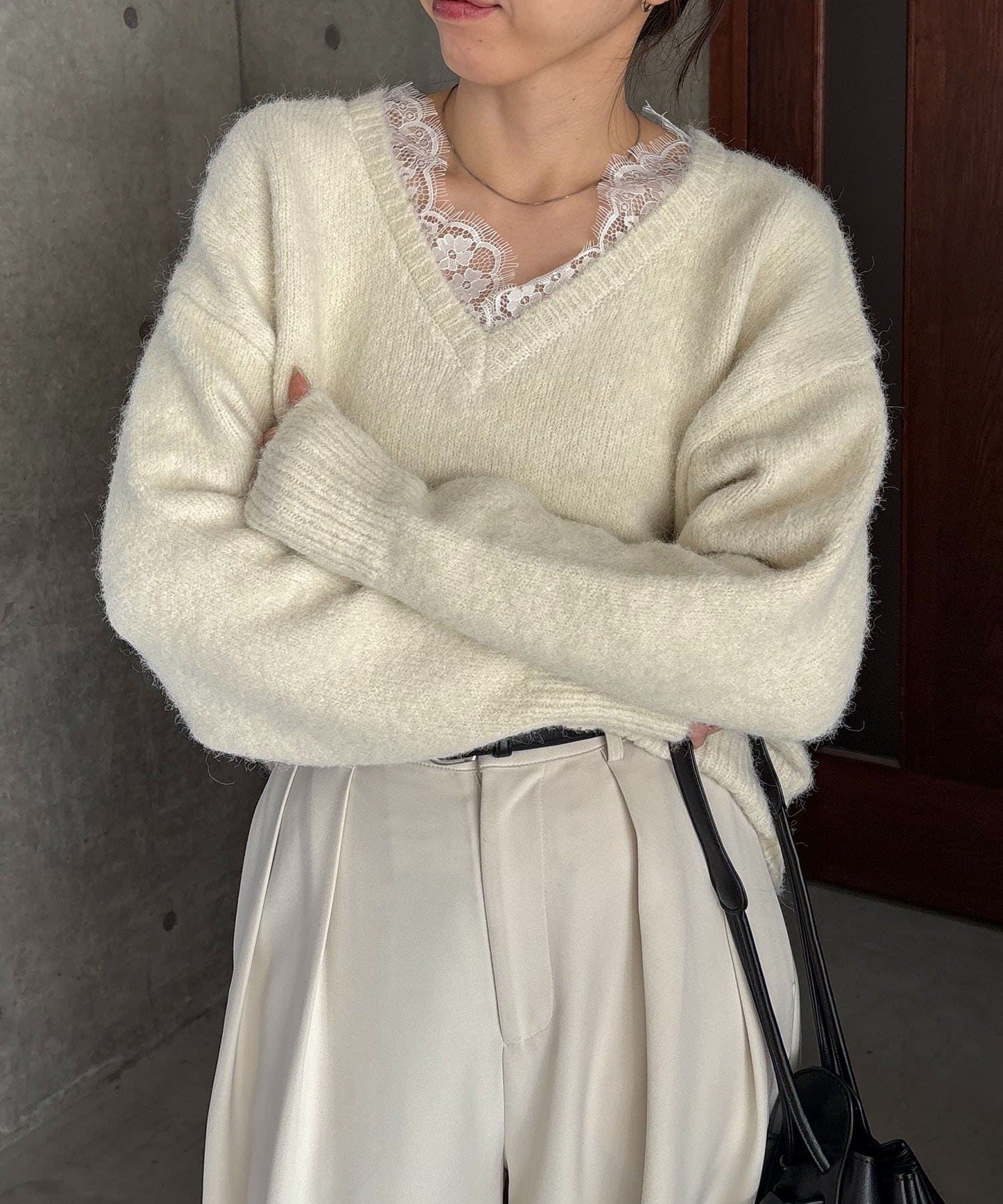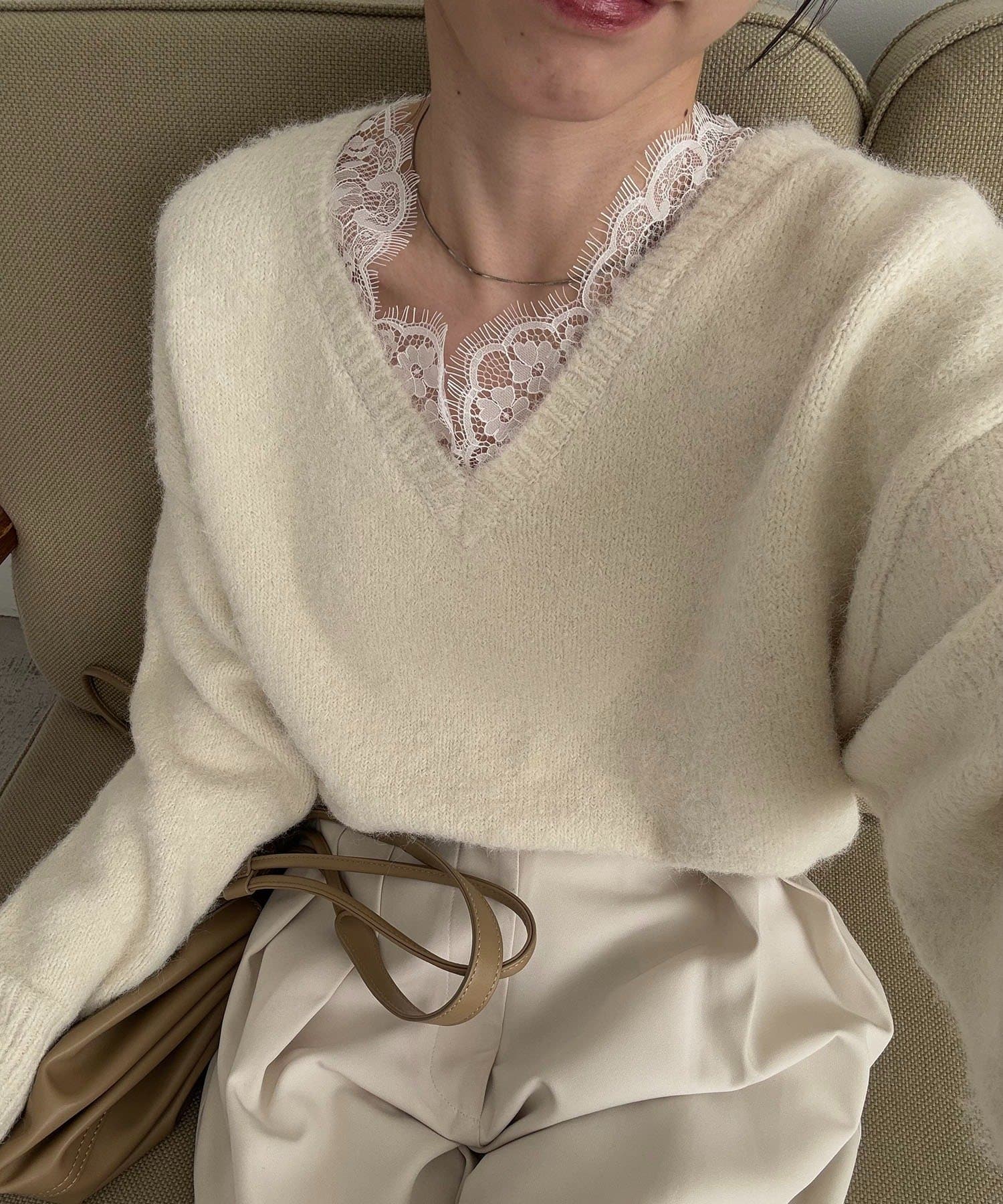 トレンドの繊細なレースを施したVネックニット
