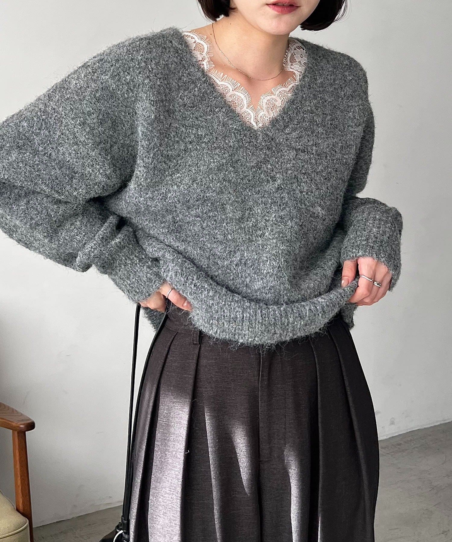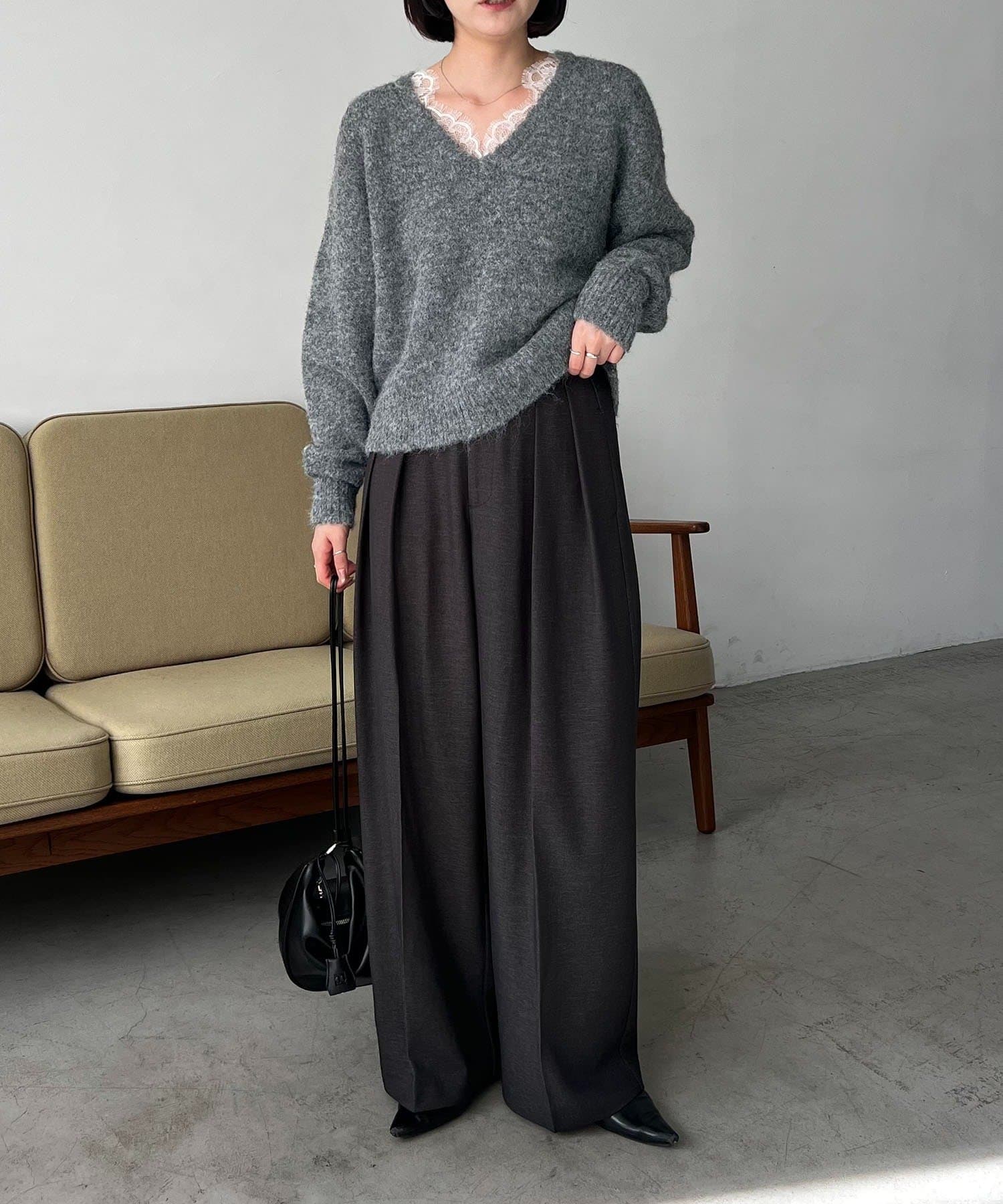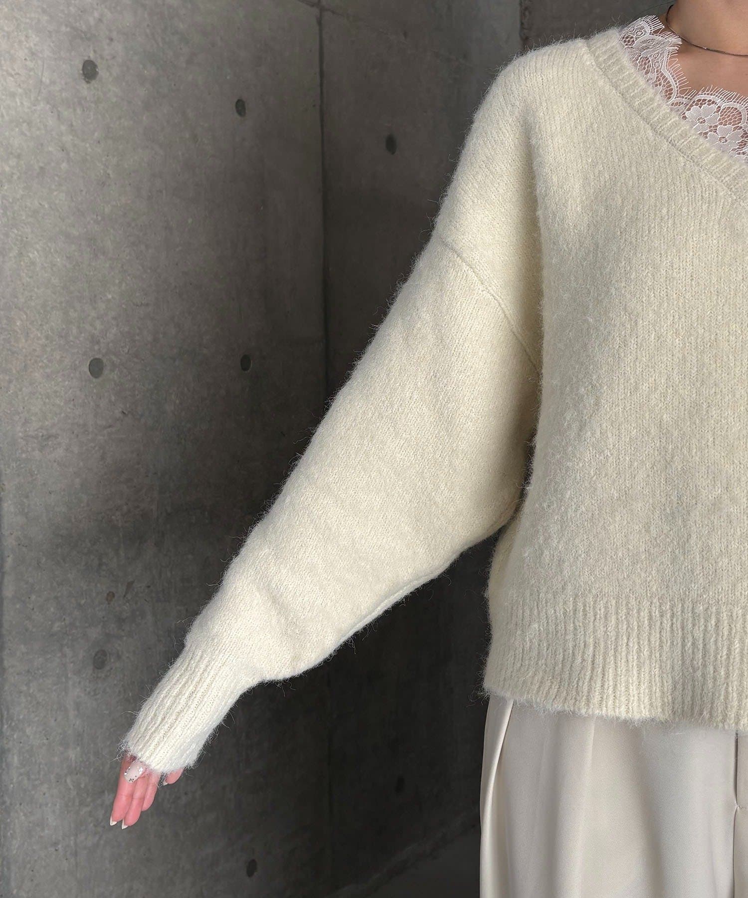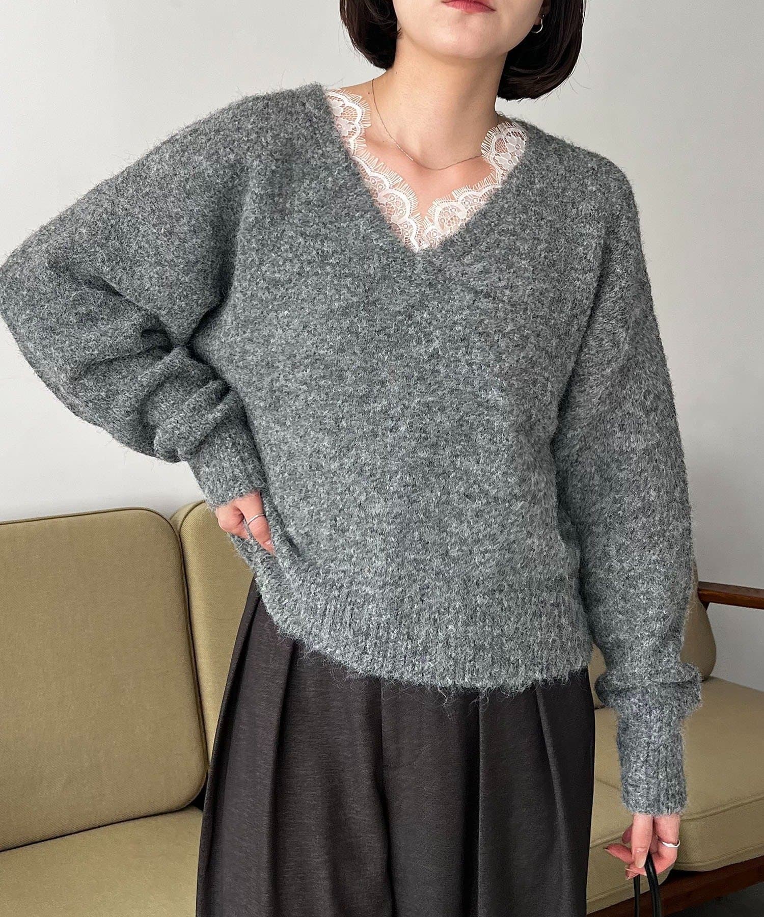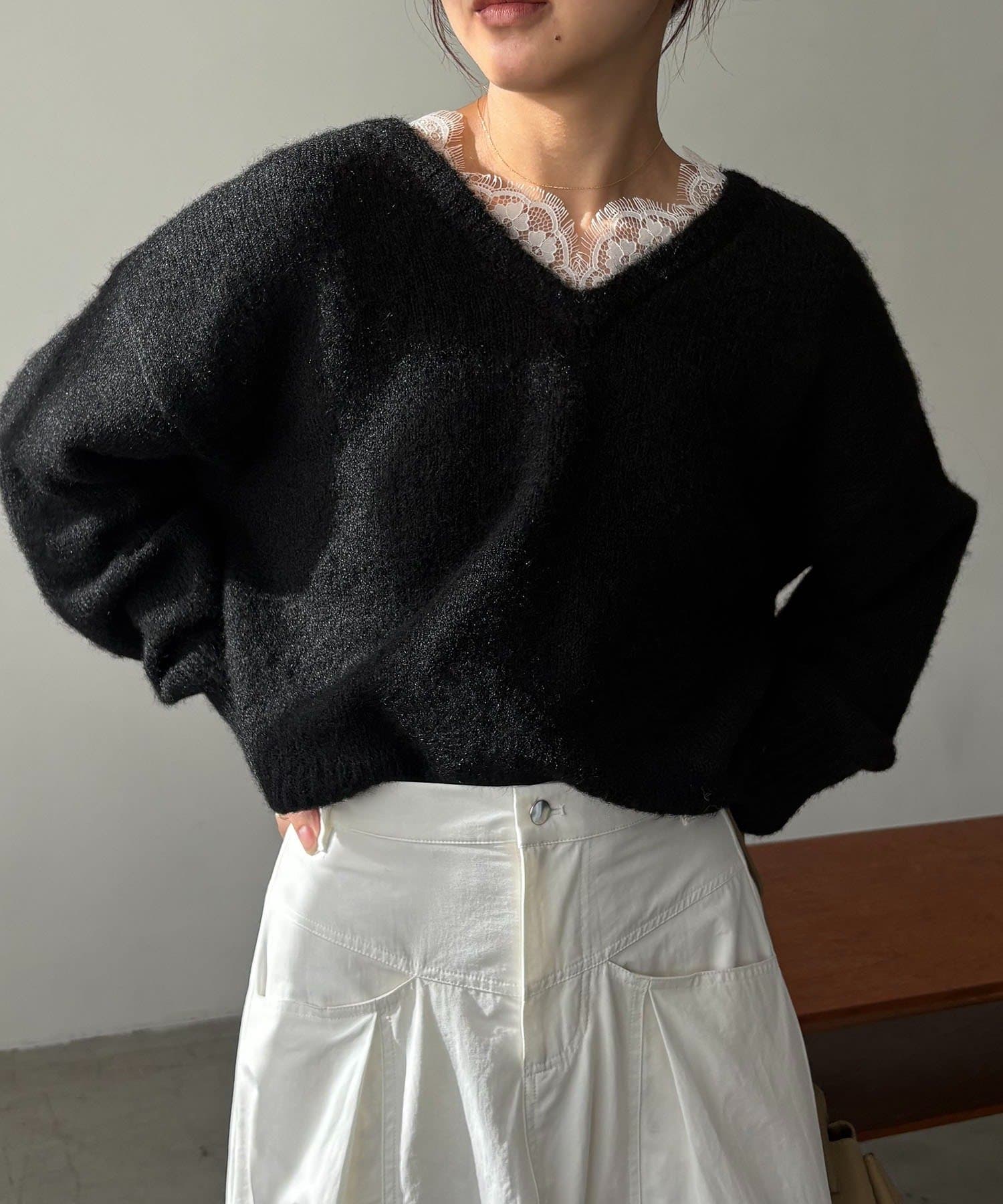 トレンドの繊細なレースを施したVネックニット
