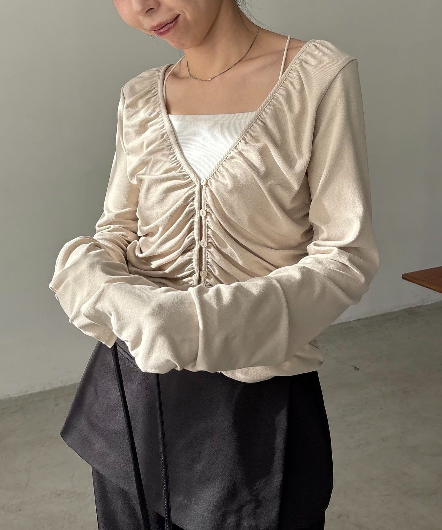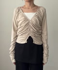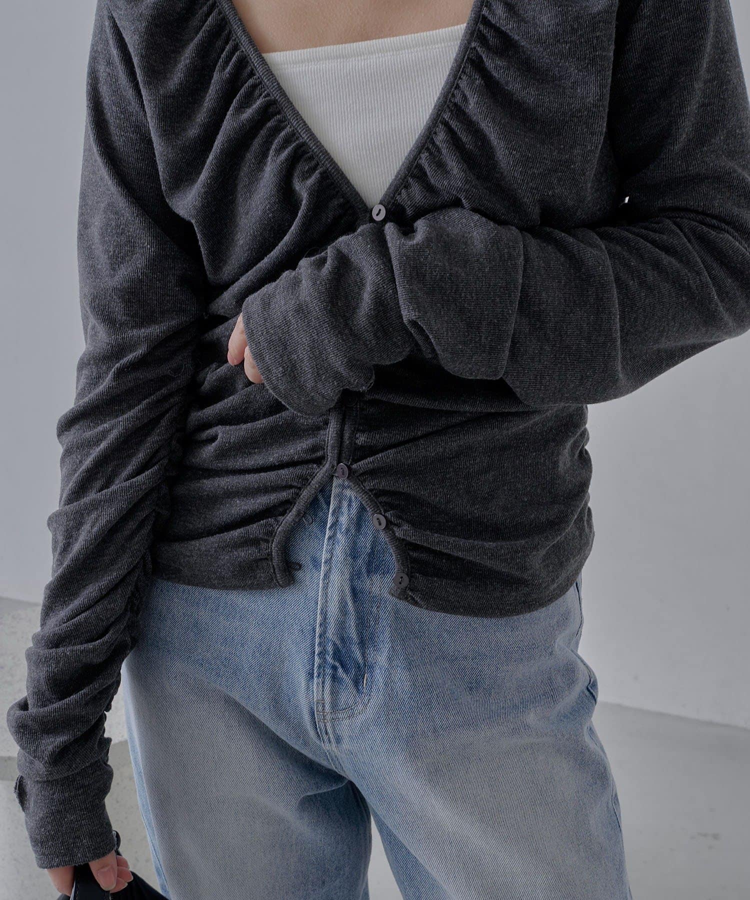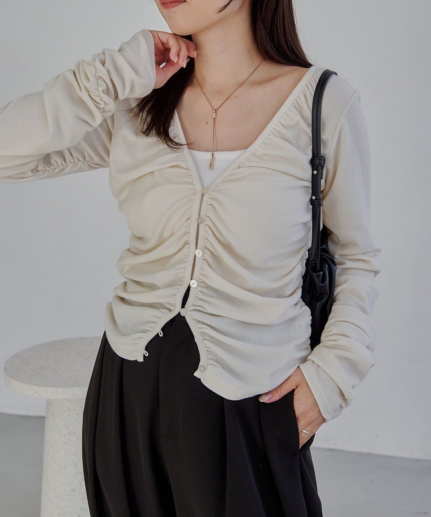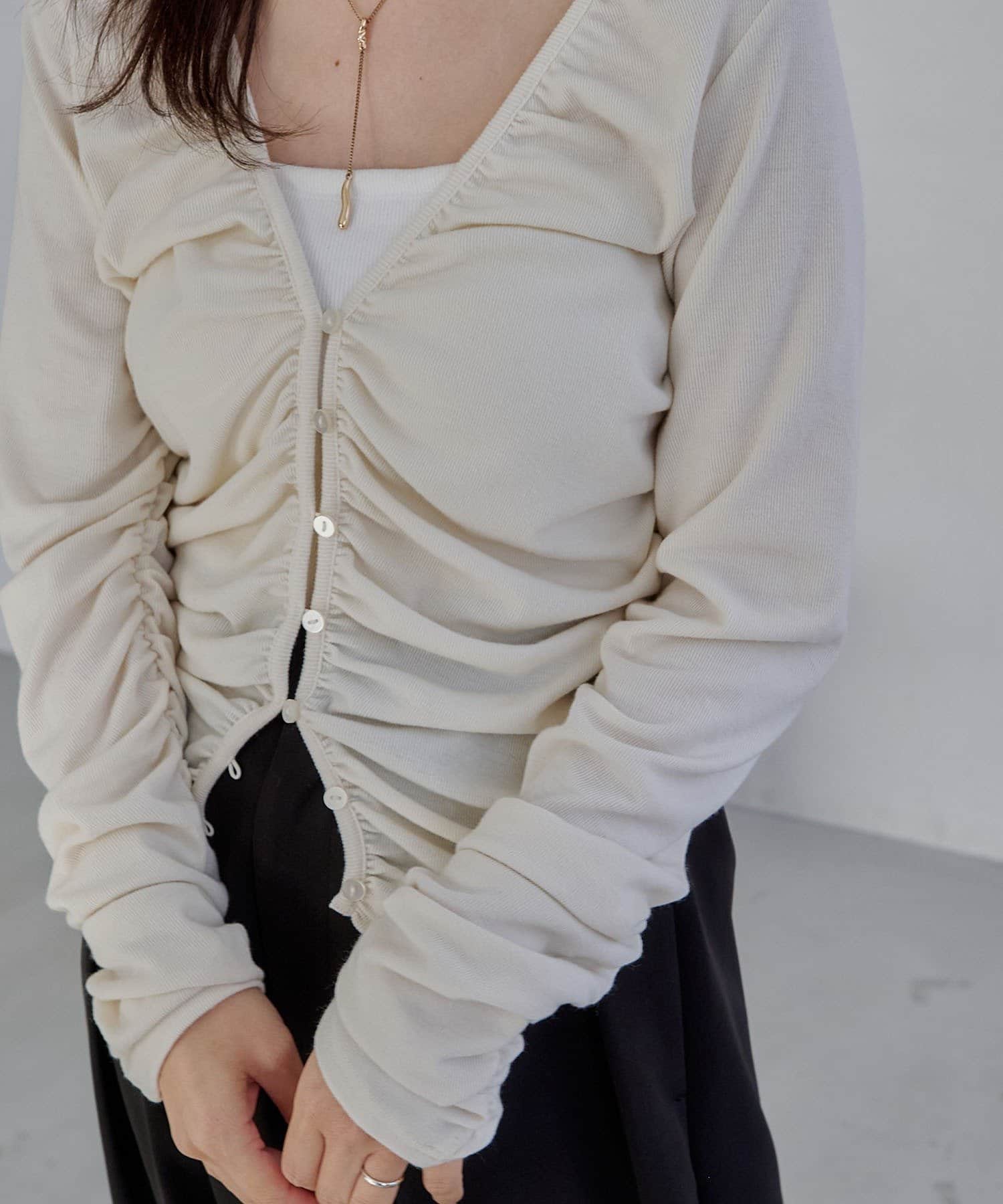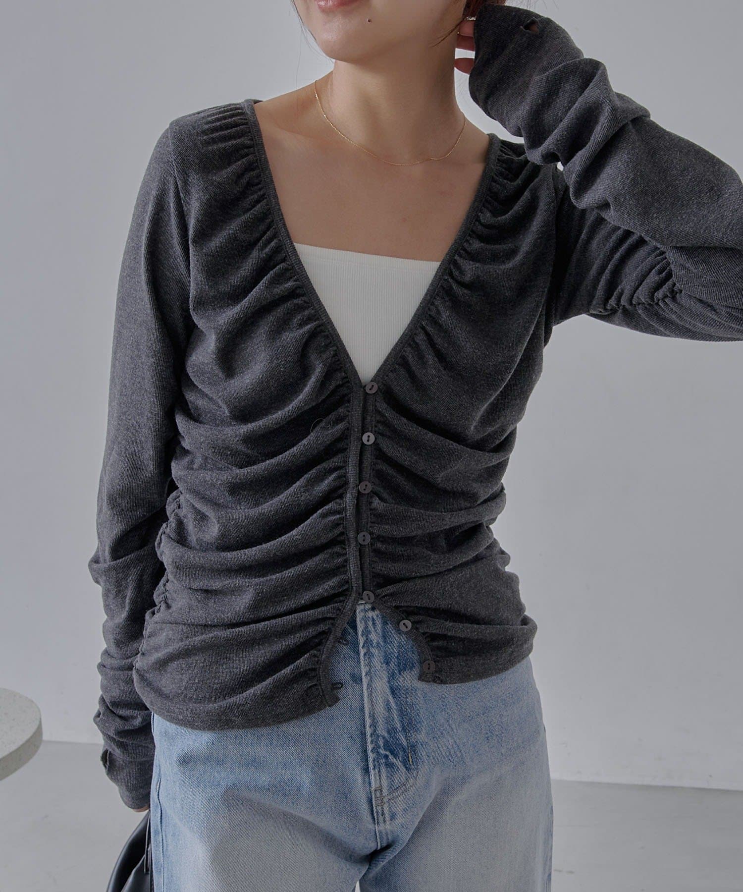 前立てから脇にかけてたっぷりとギャザーを入れた着映えするカーディガン