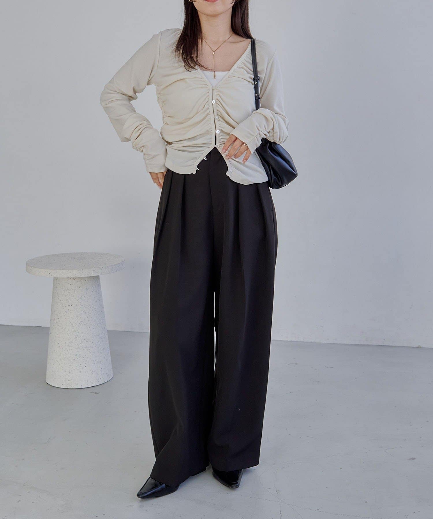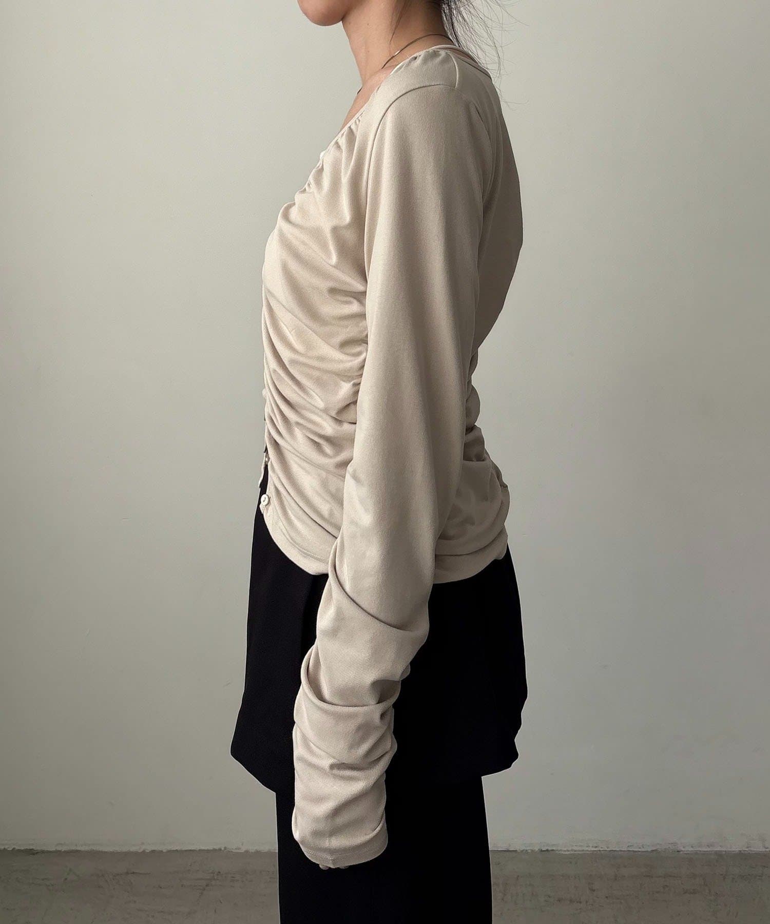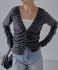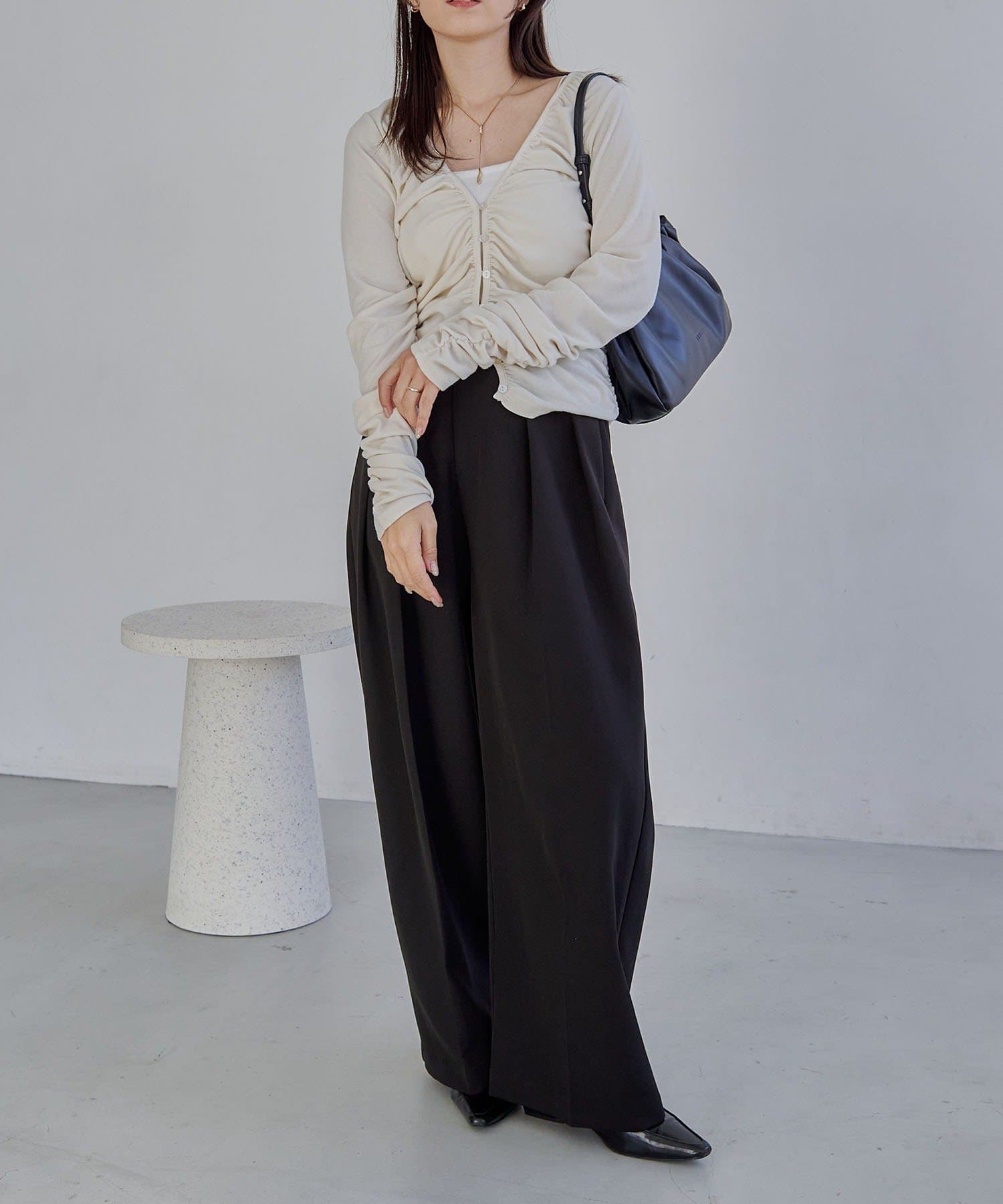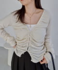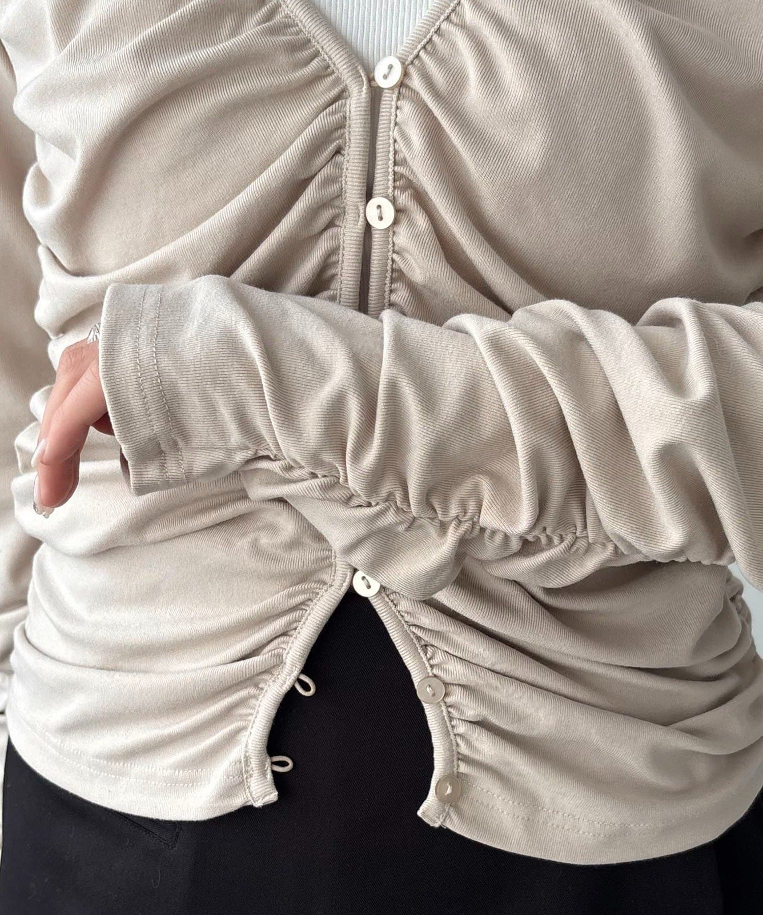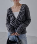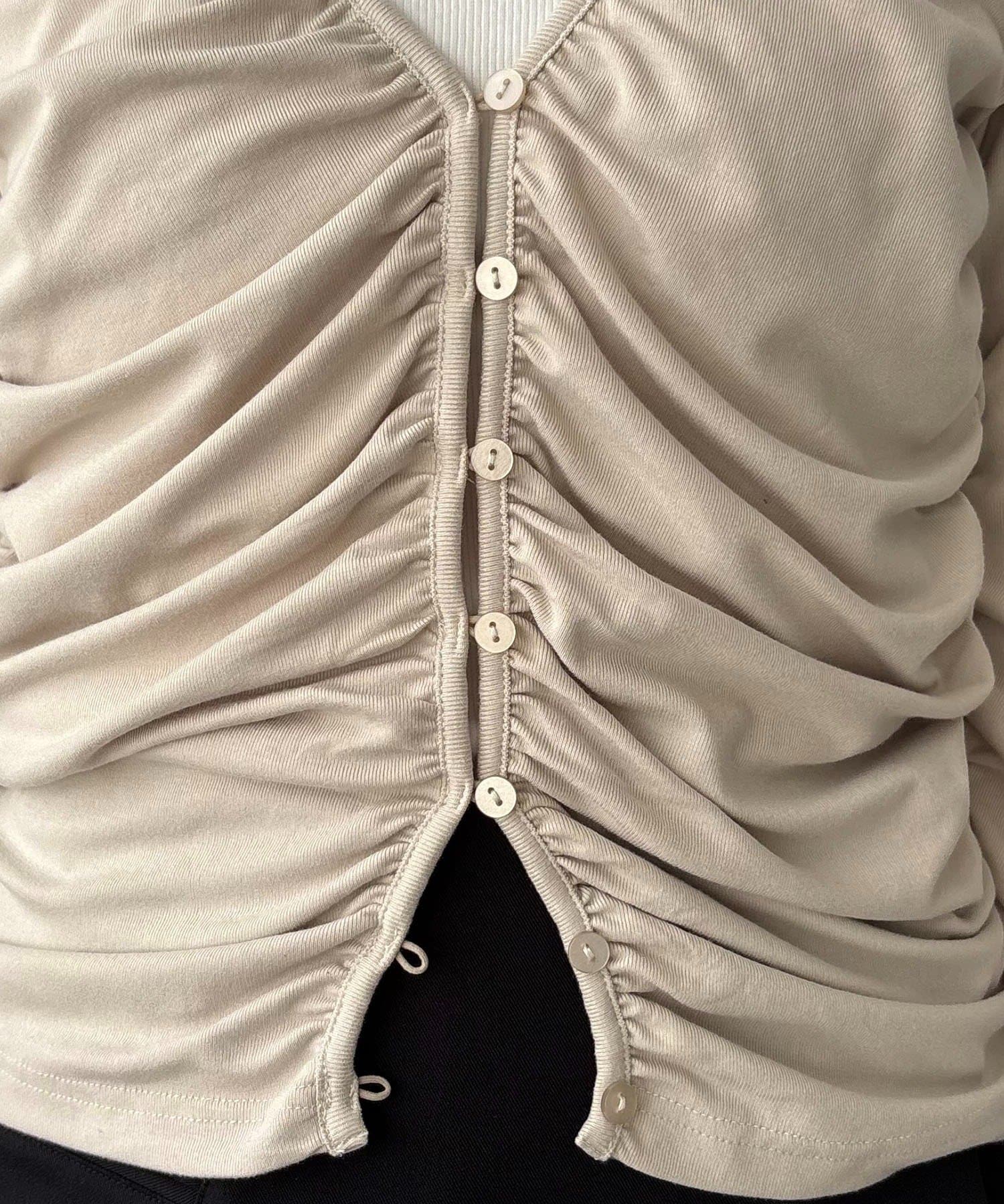 前立てから脇にかけてたっぷりとギャザーを入れた着映えするカーディガン