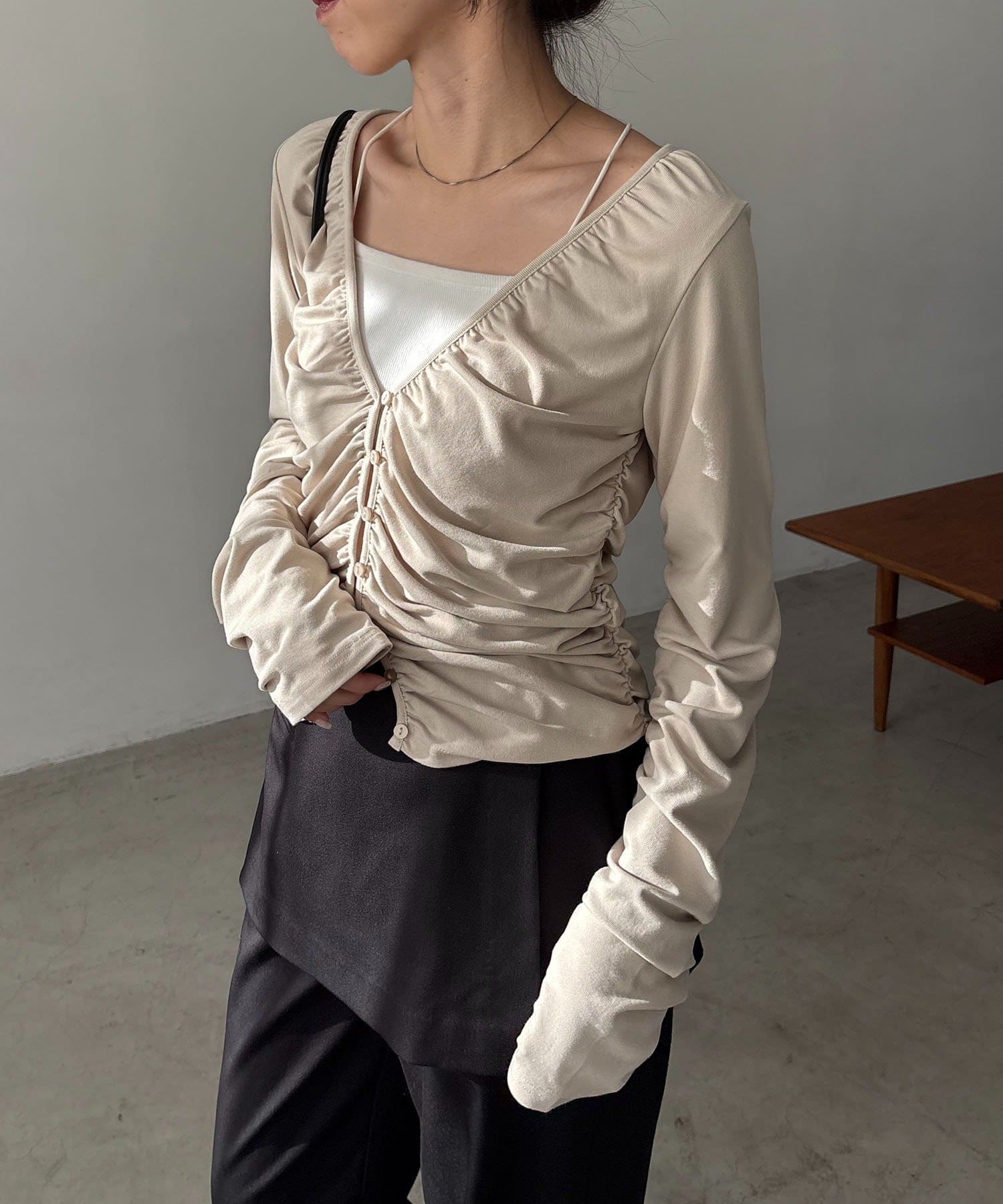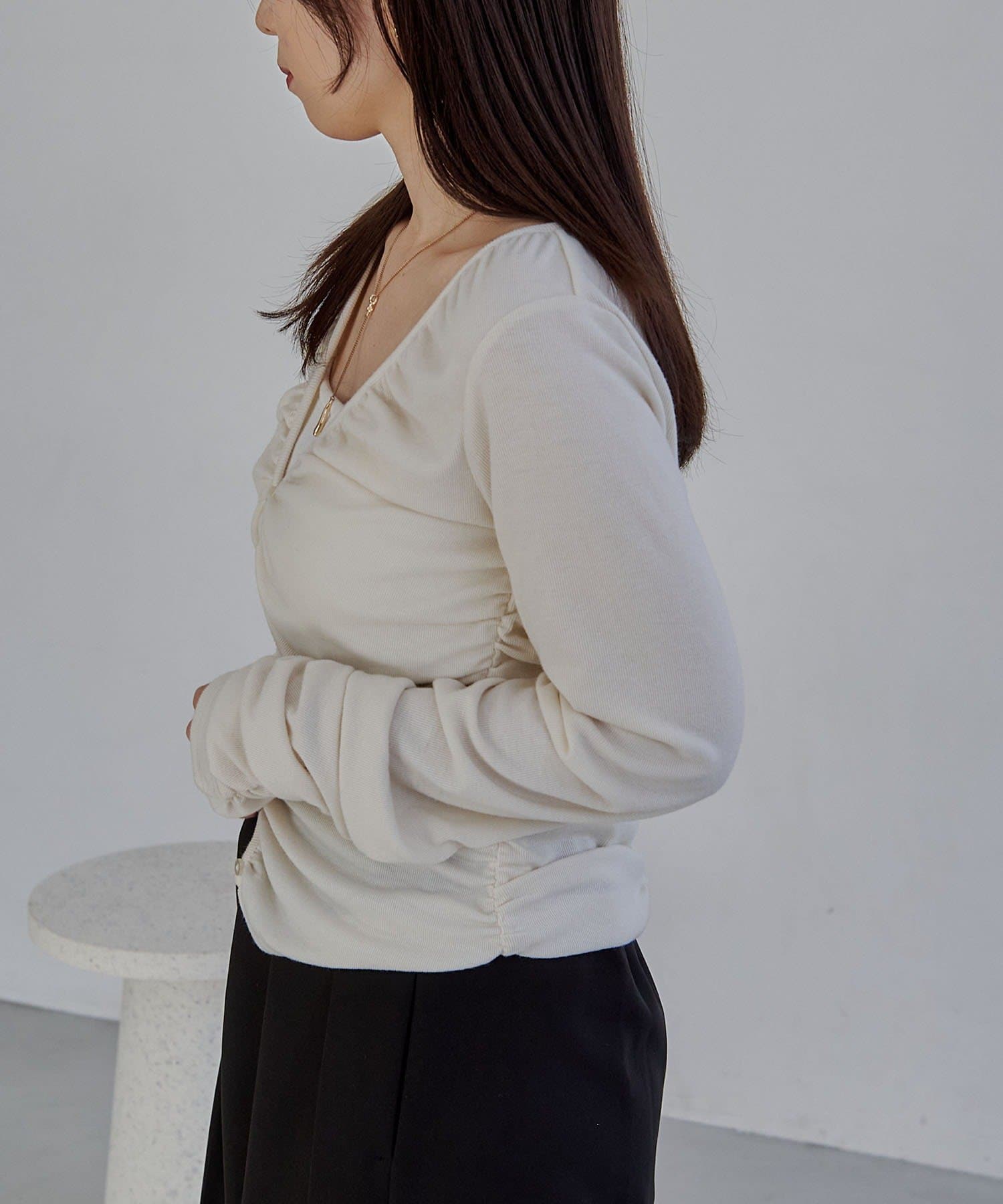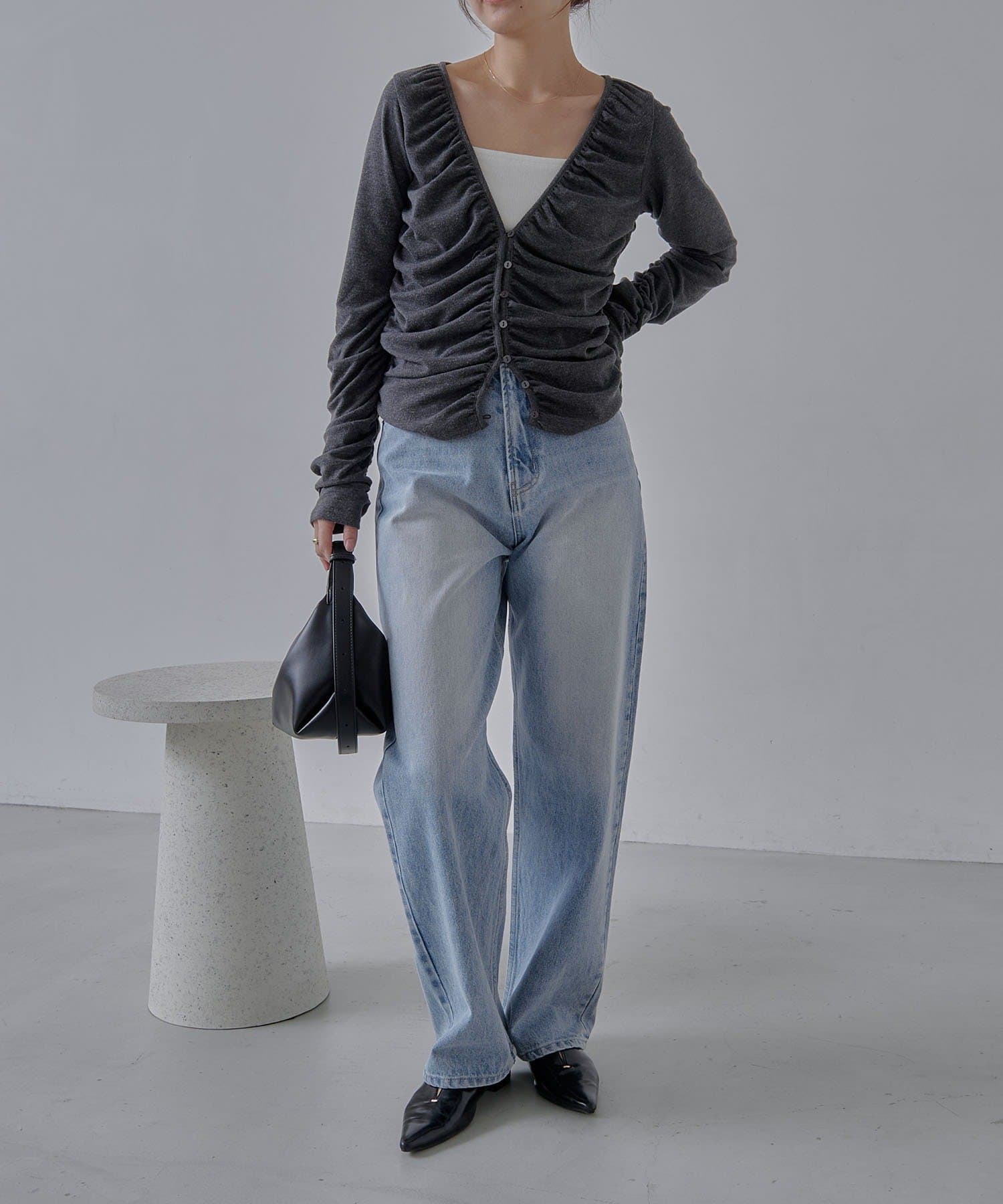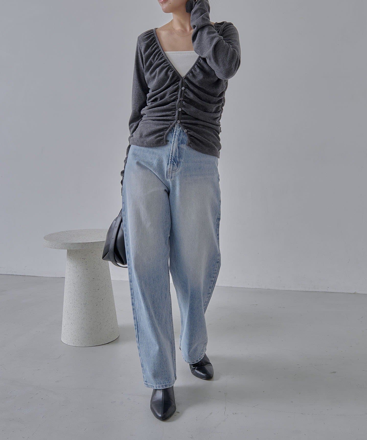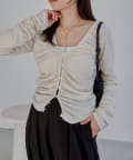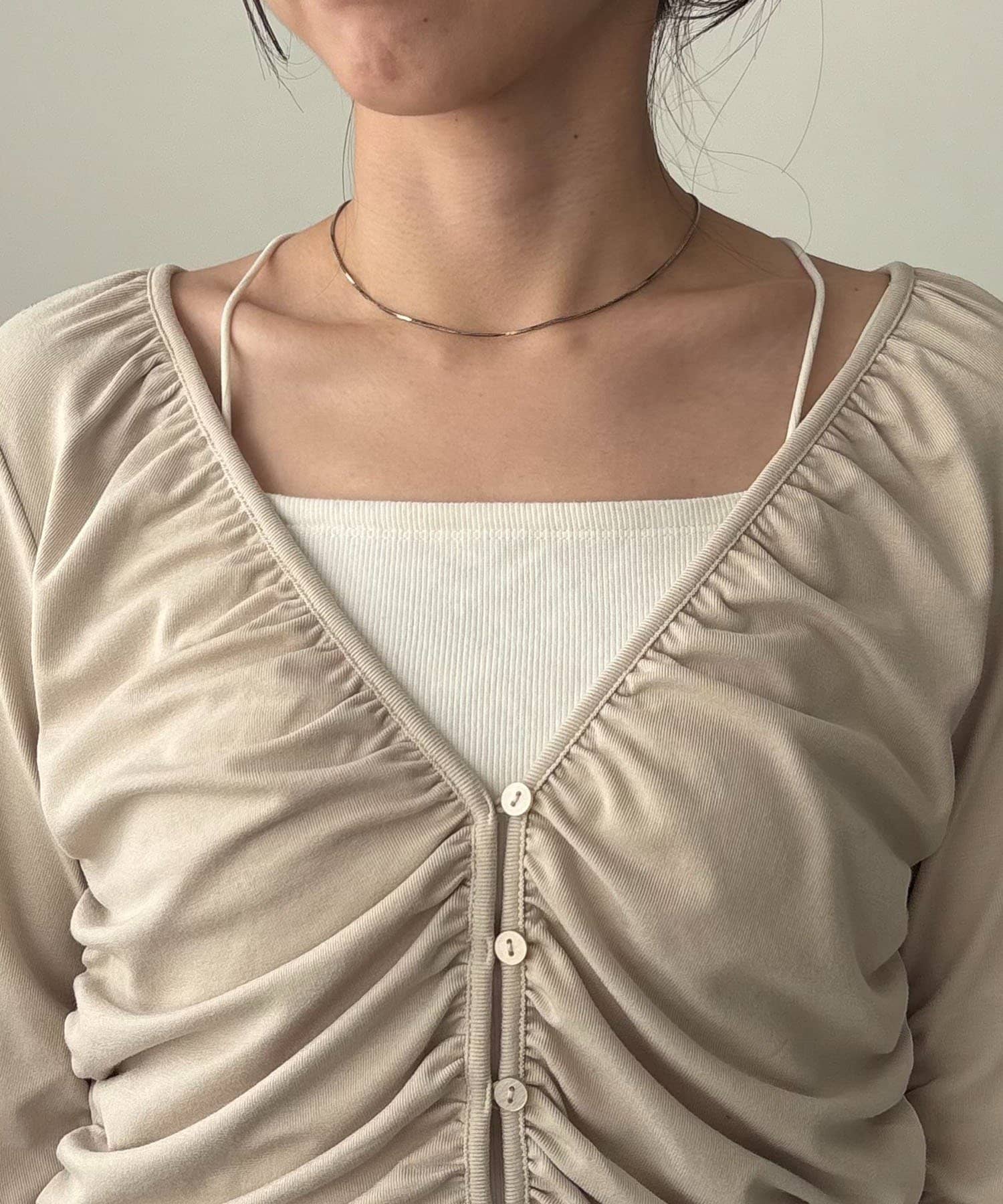 前立てから脇にかけてたっぷりとギャザーを入れた着映えするカーディガン