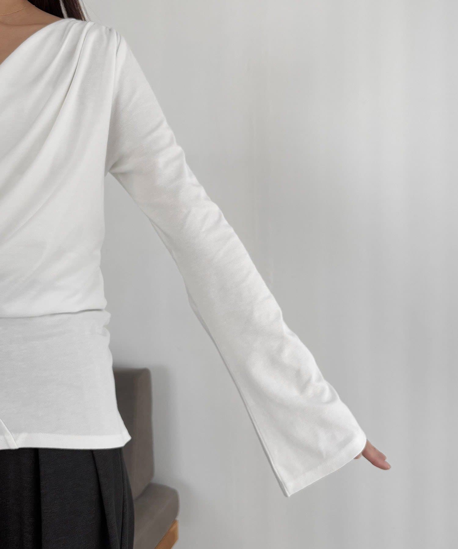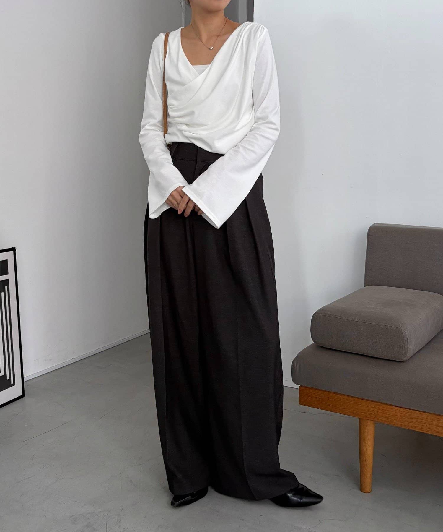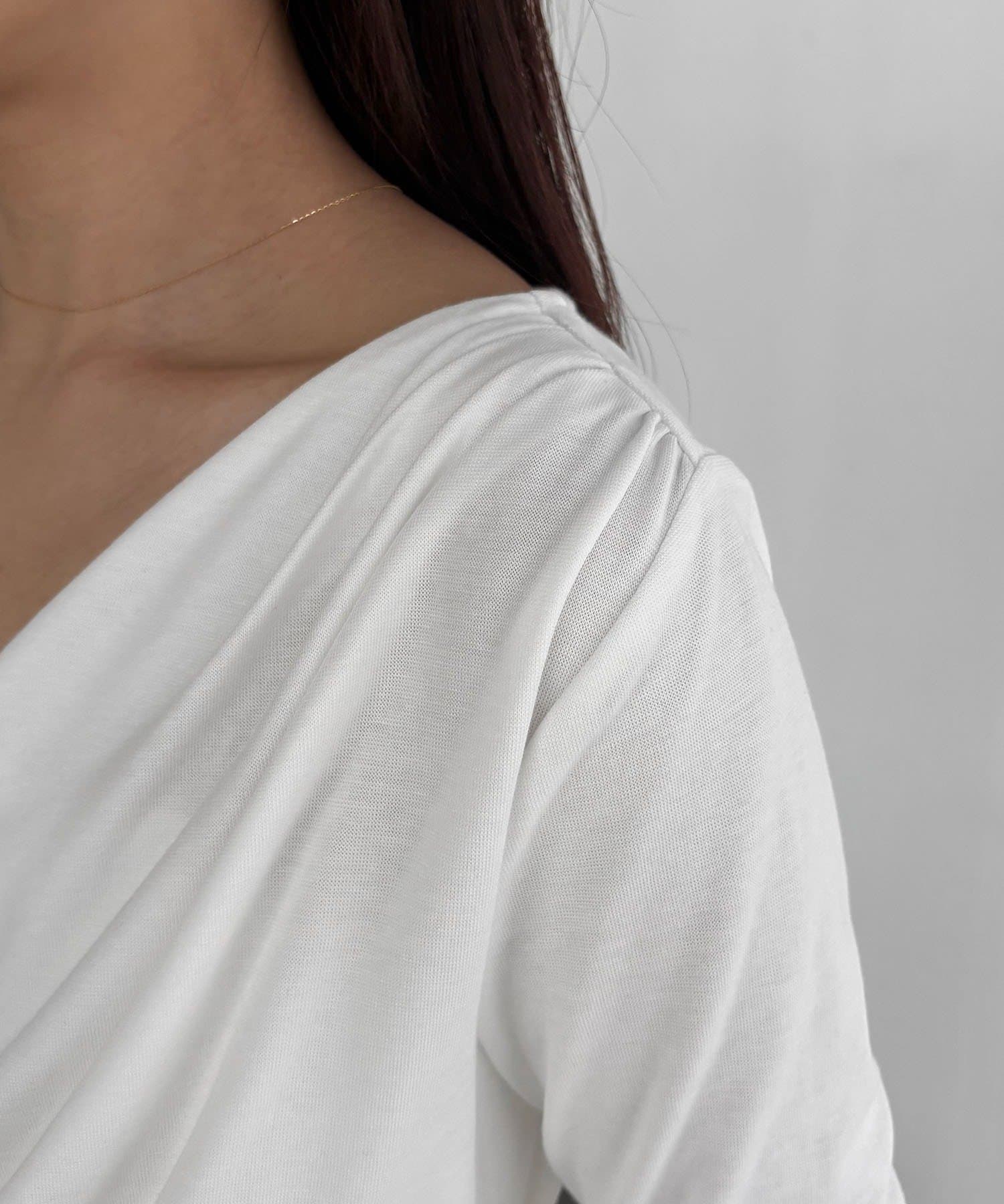 ・アシンメトリーのVネックが一癖ある抜け感をプラス