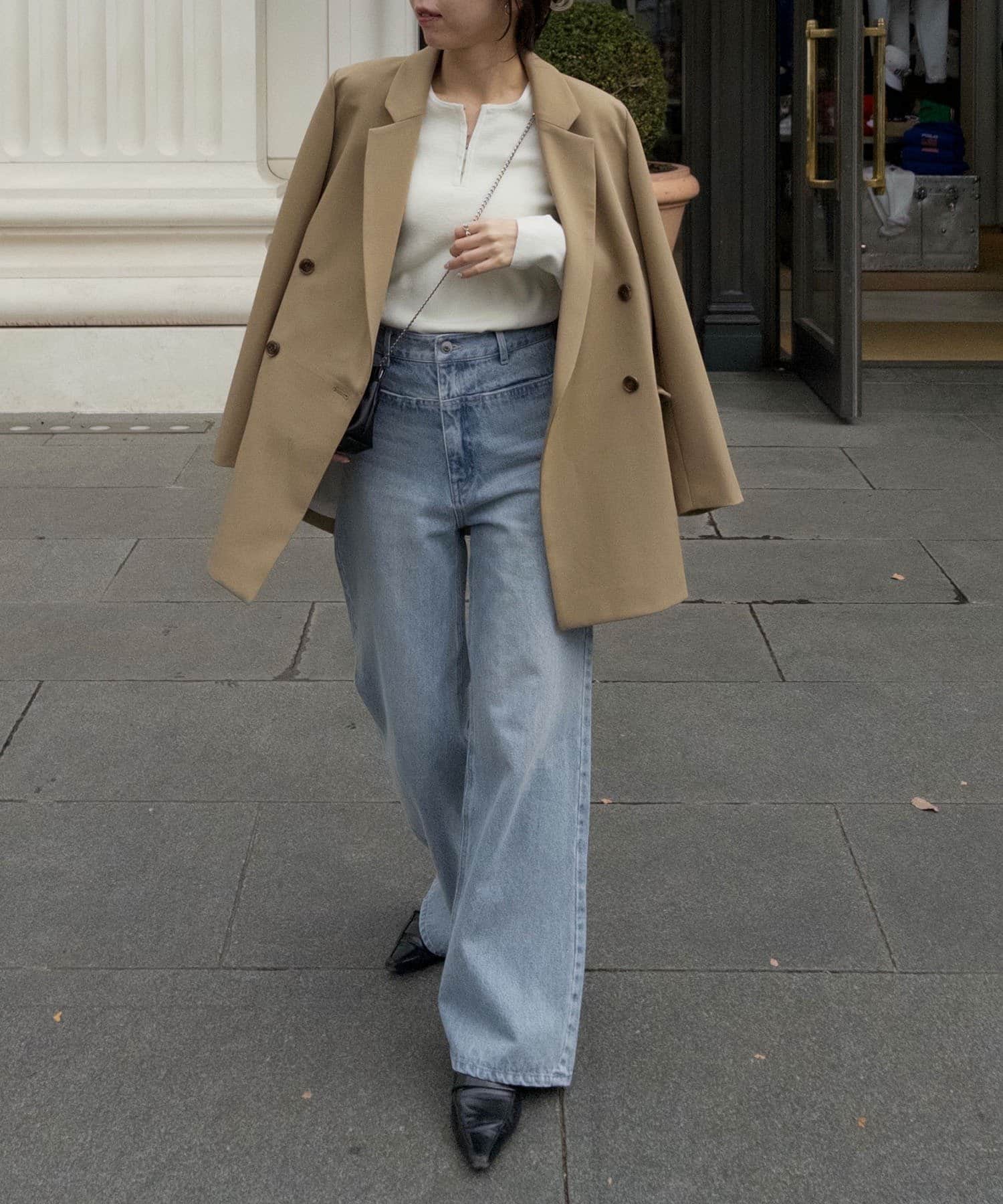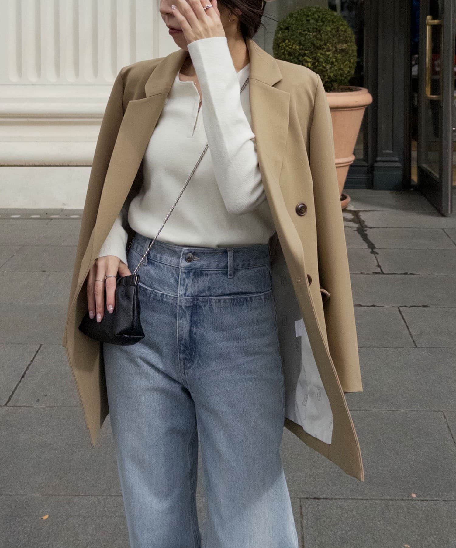 【ベージュ着用アイテム③】pants:スリットポケットストレートデニム・inner:ホックヘンリーニット
