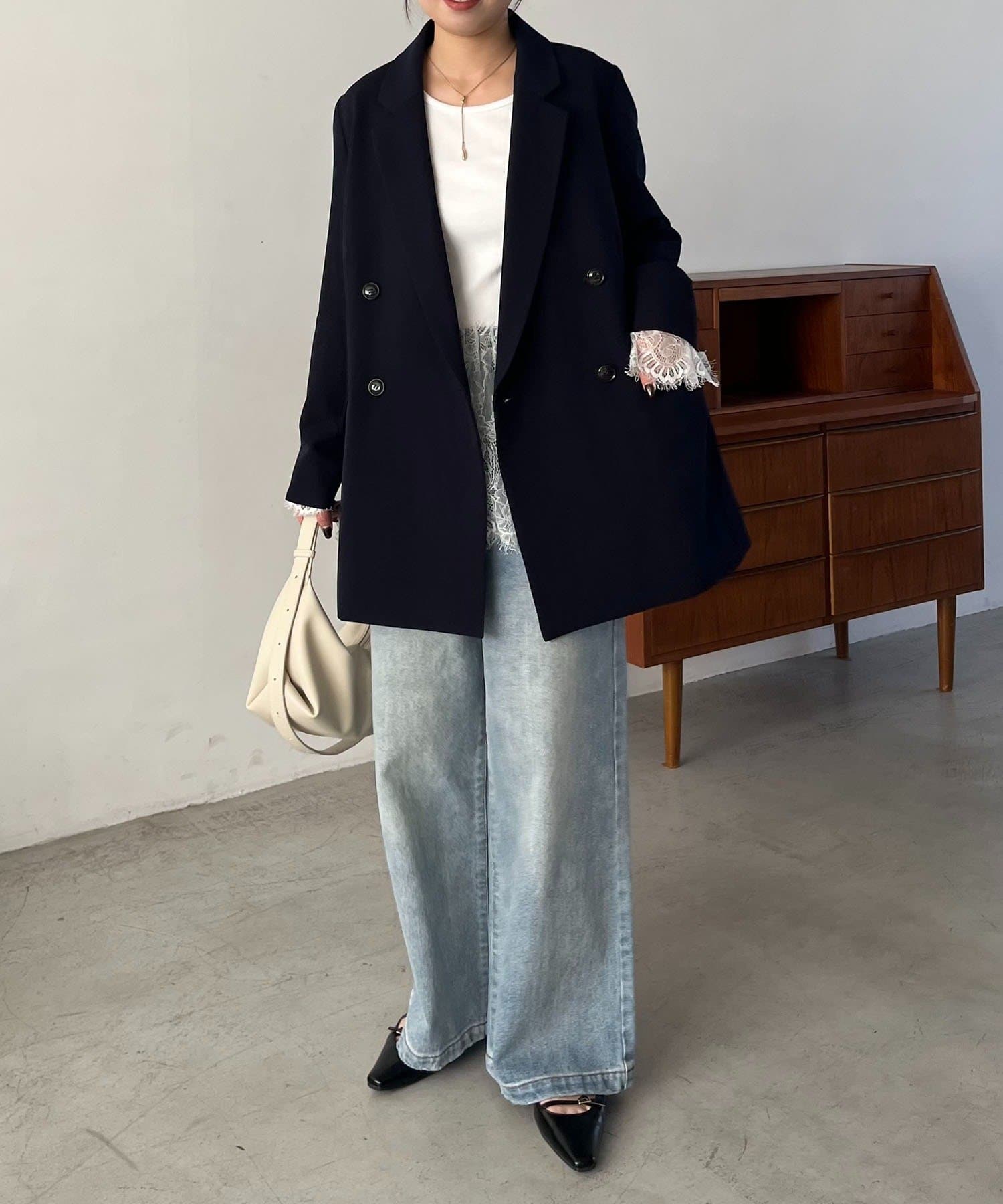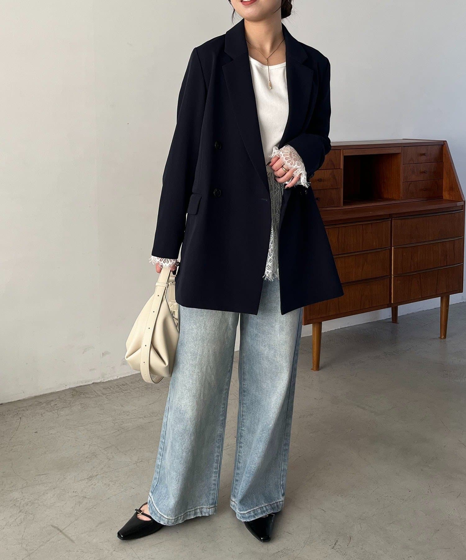 【ネイビー着用アイテム②】pants:スリットポケットストレートデニム・inner:レースロンT