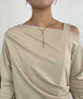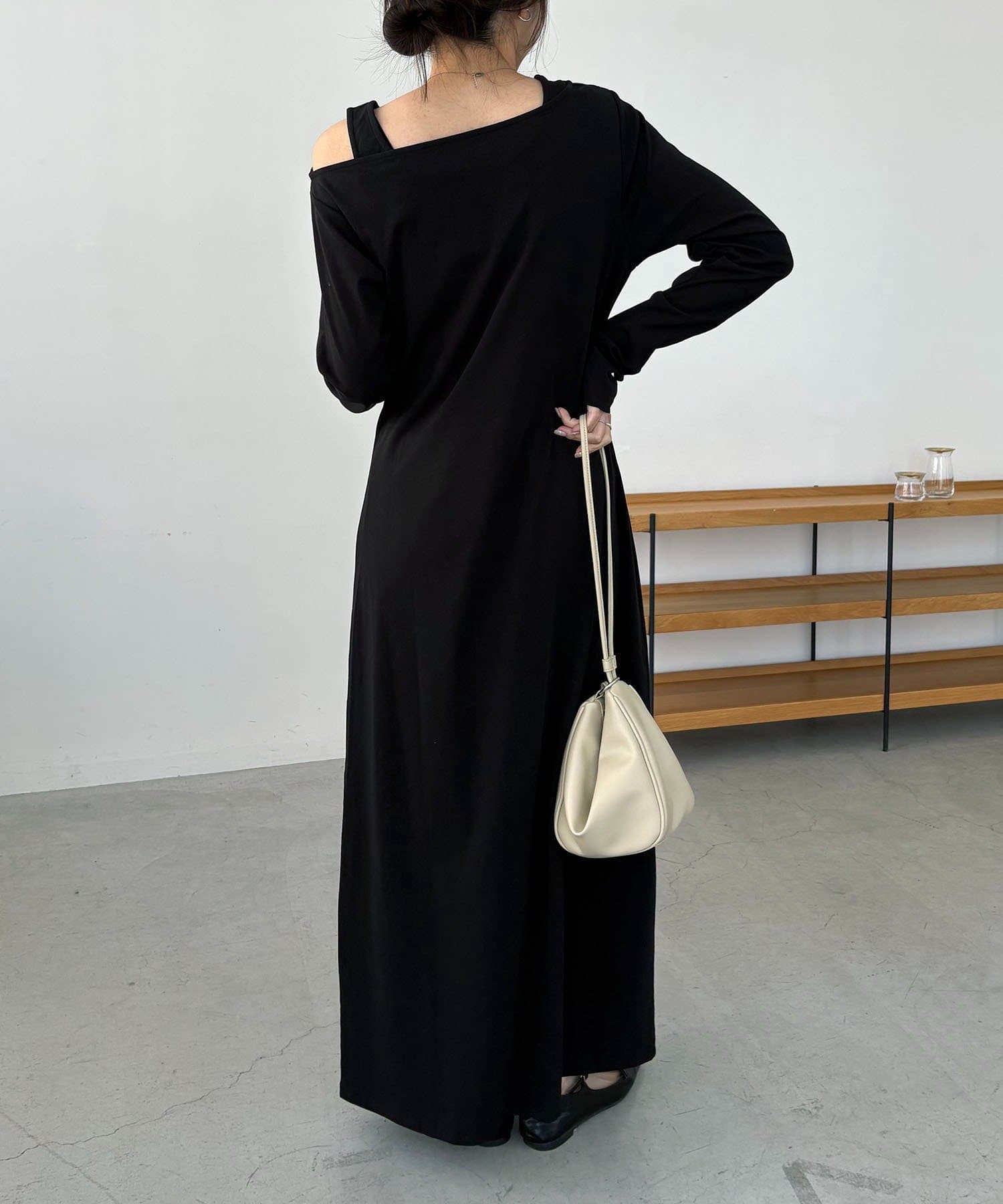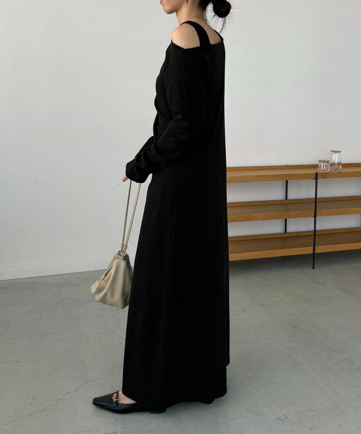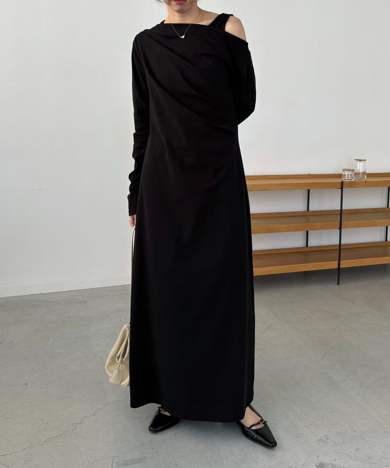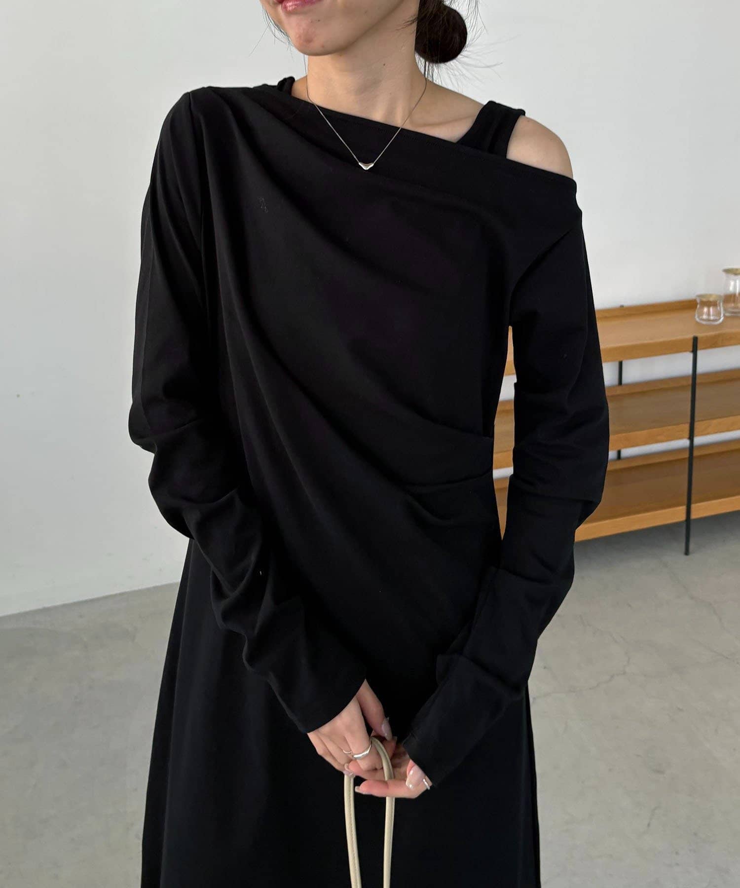 視線を惹きつけるアシンメトリーな肩周りが大人な印象