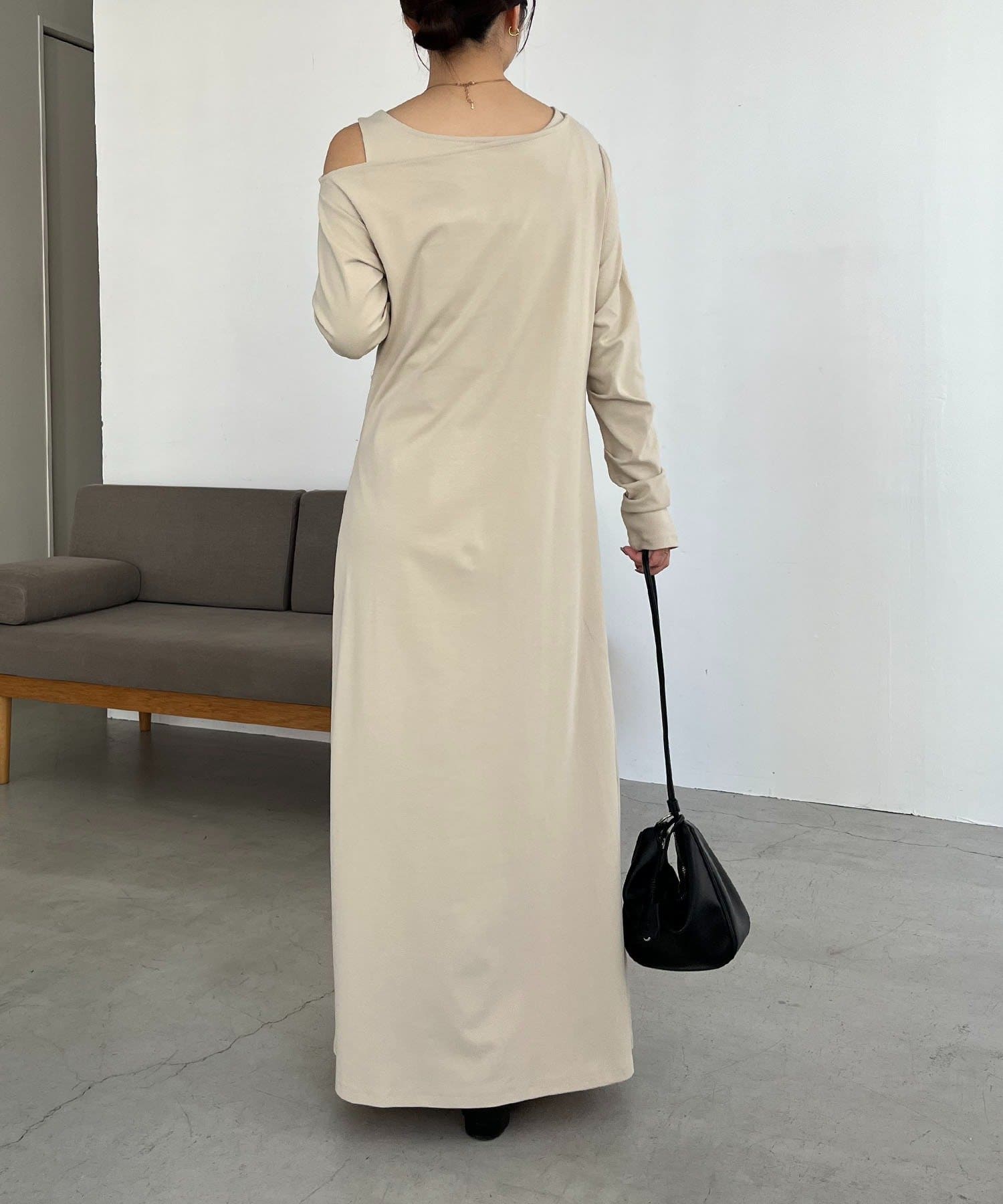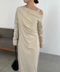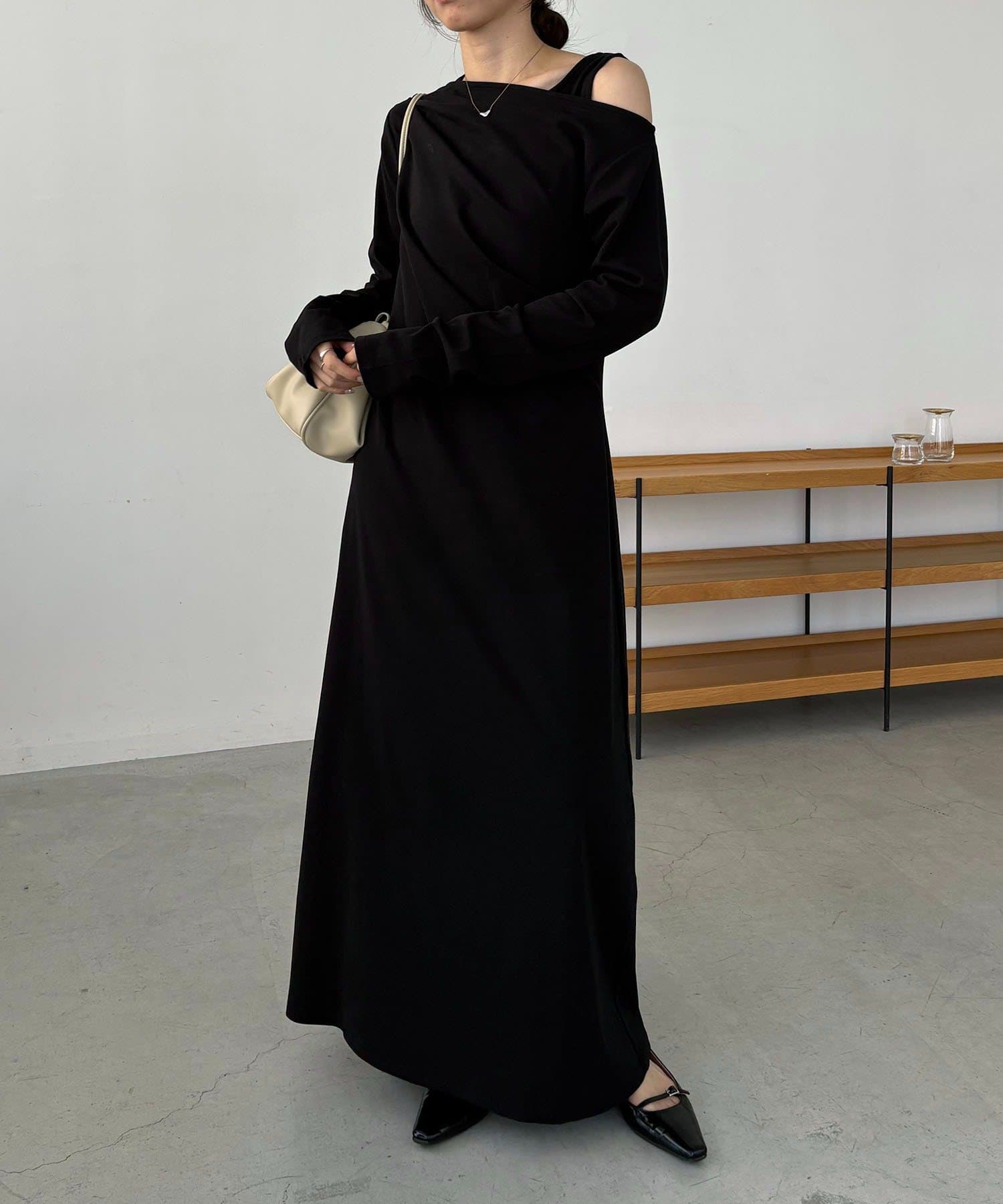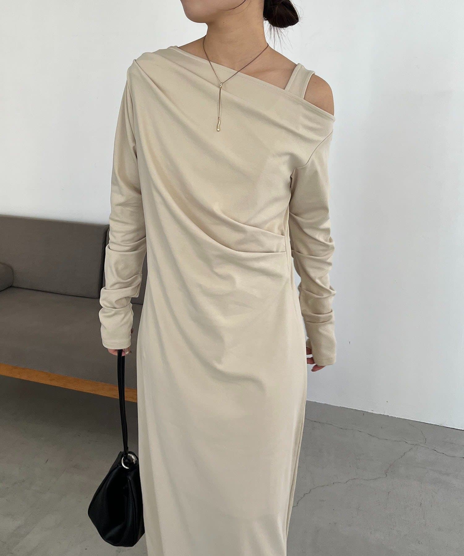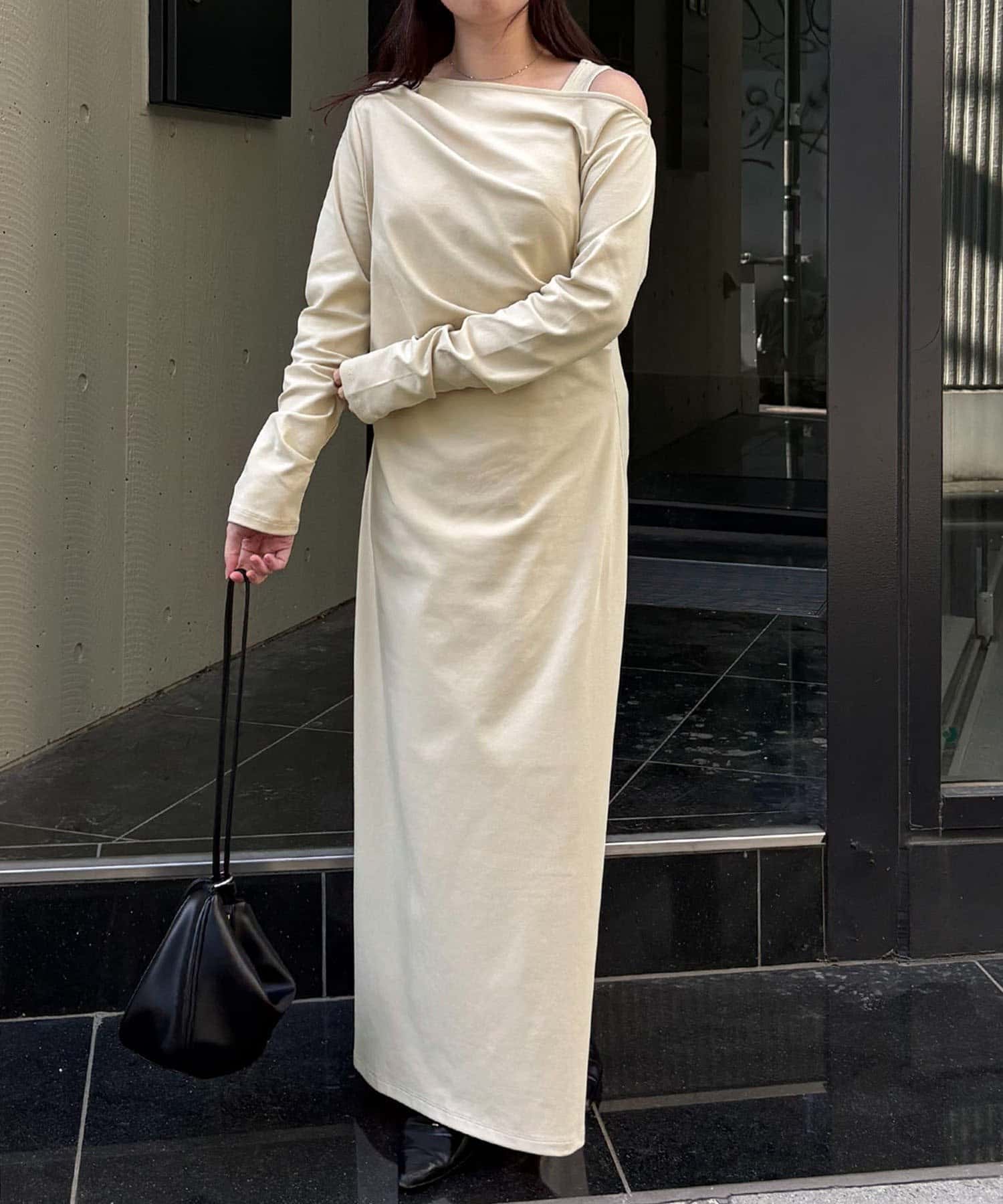 視線を惹きつけるアシンメトリーな肩周りが大人な印象