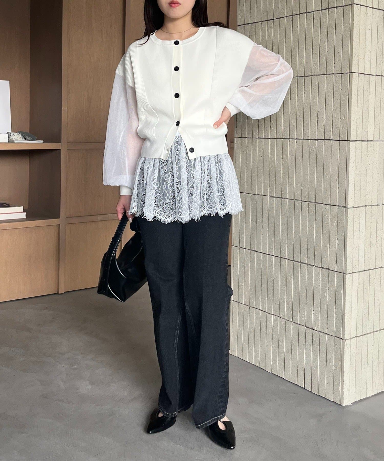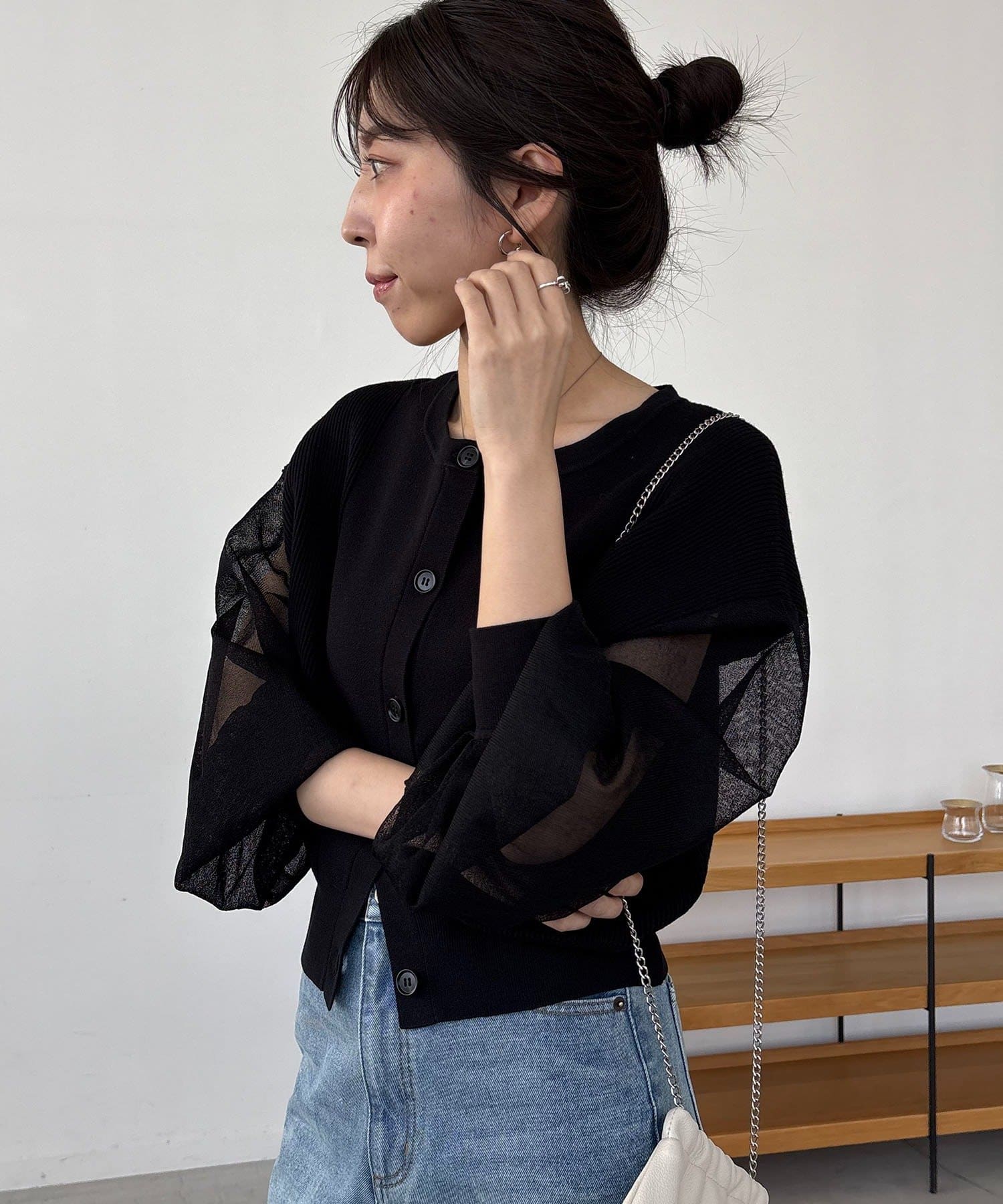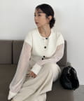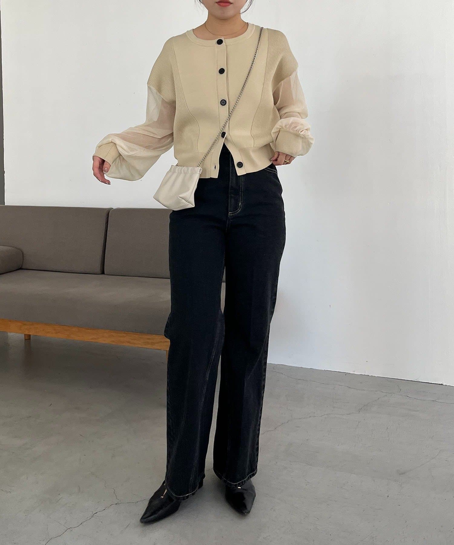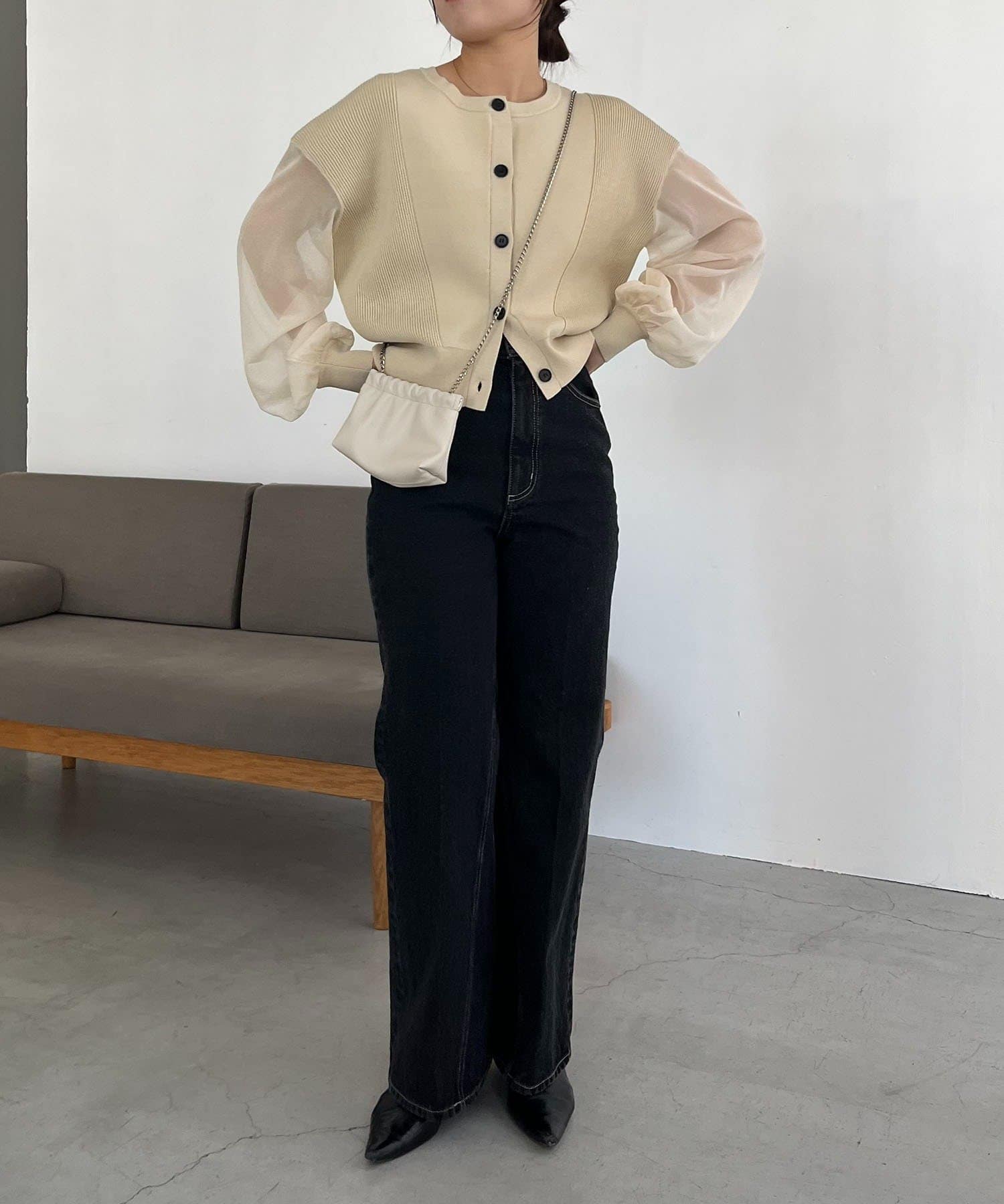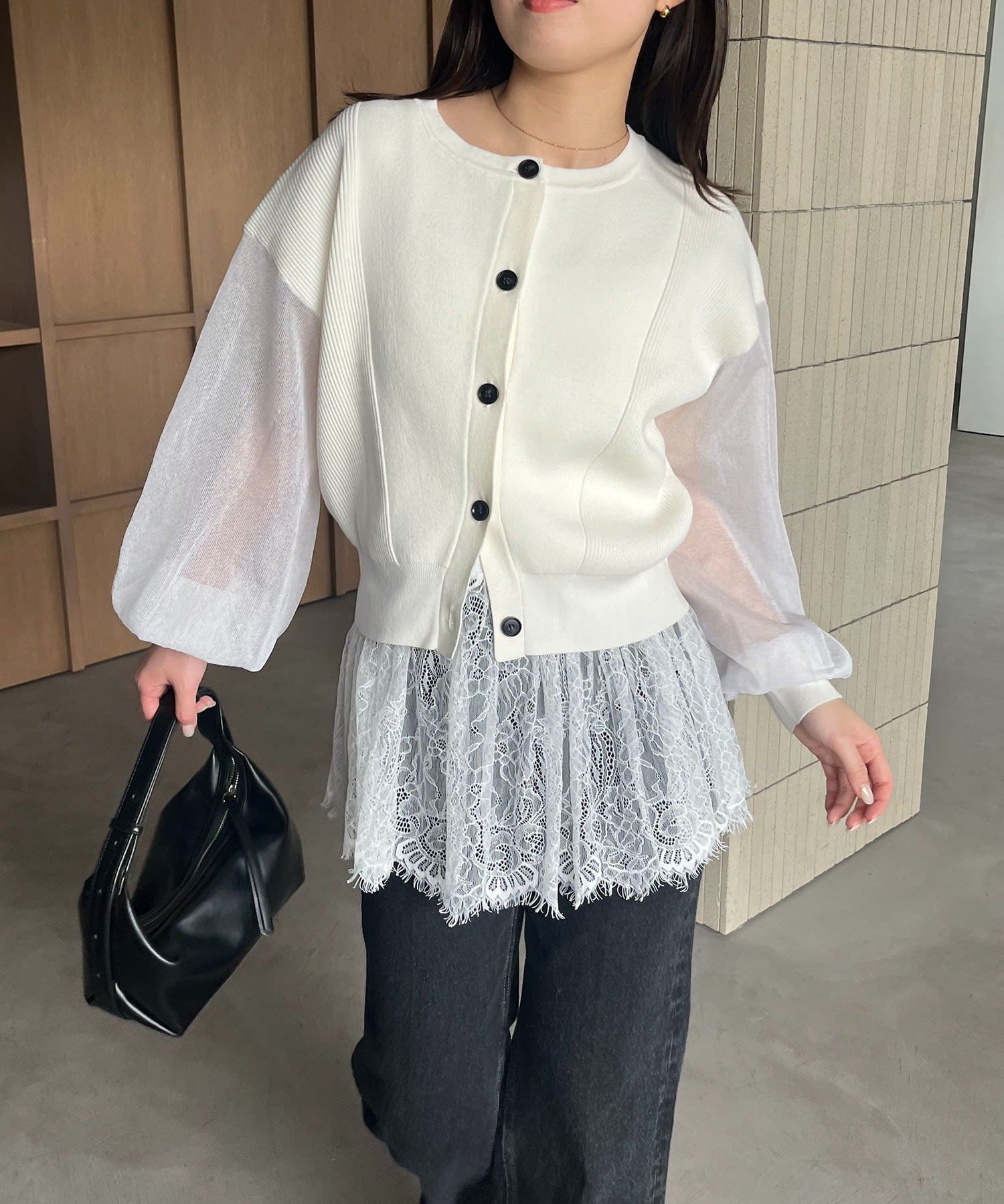 袖がシアーに切り替わった春らしいカーディガン