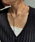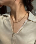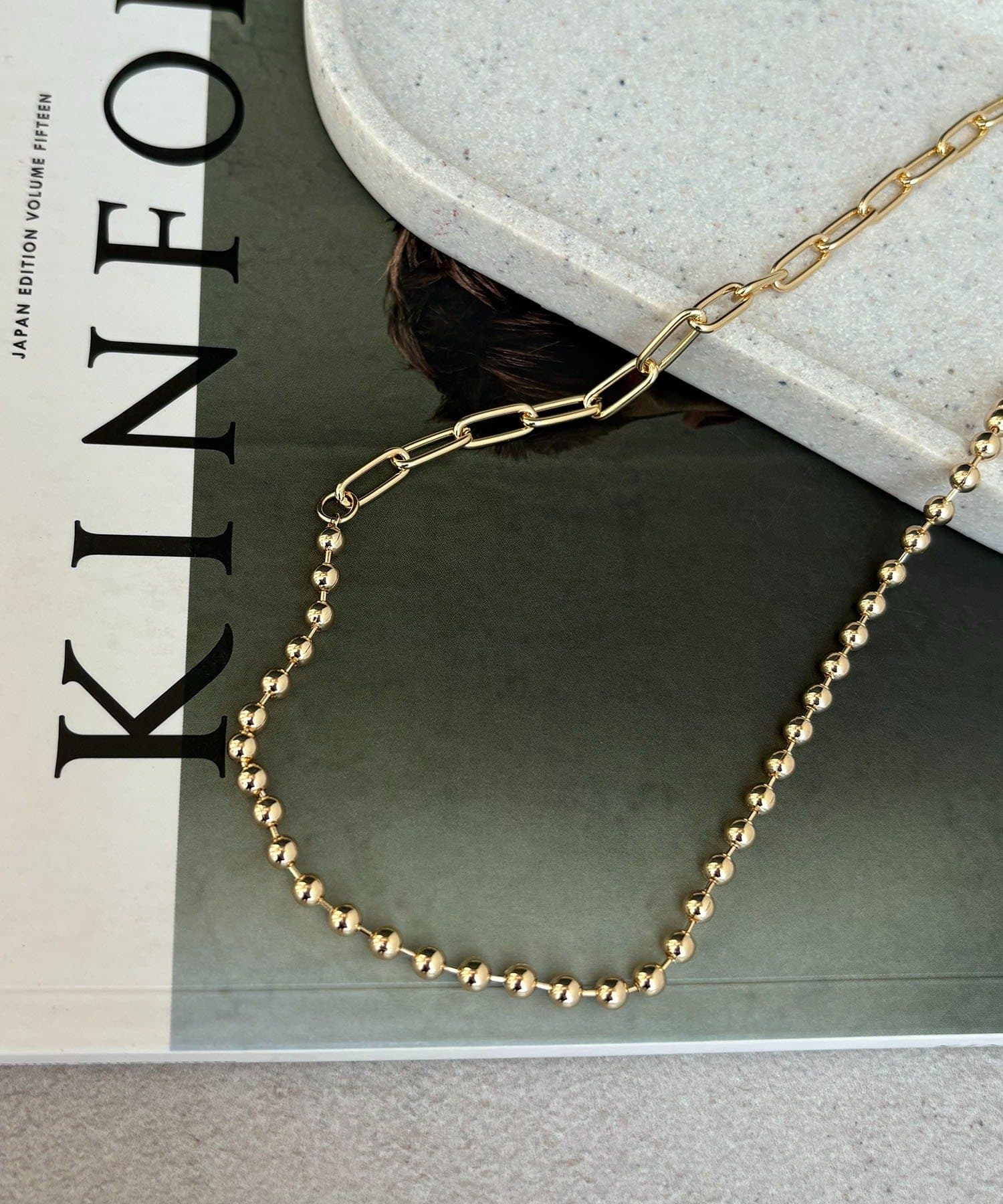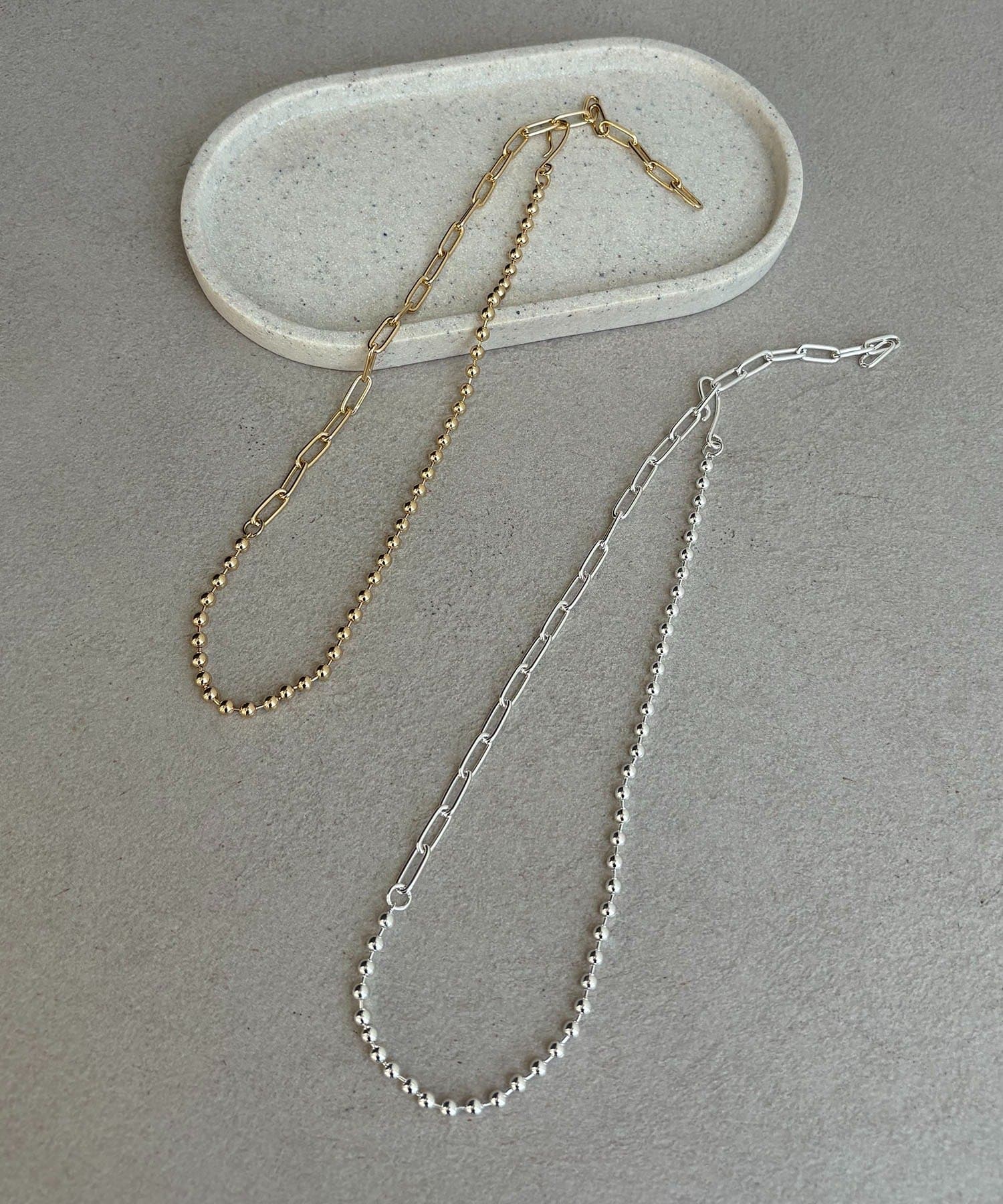 ボールチェーンとスリムなチェーンが組み合わさったネックレス。
