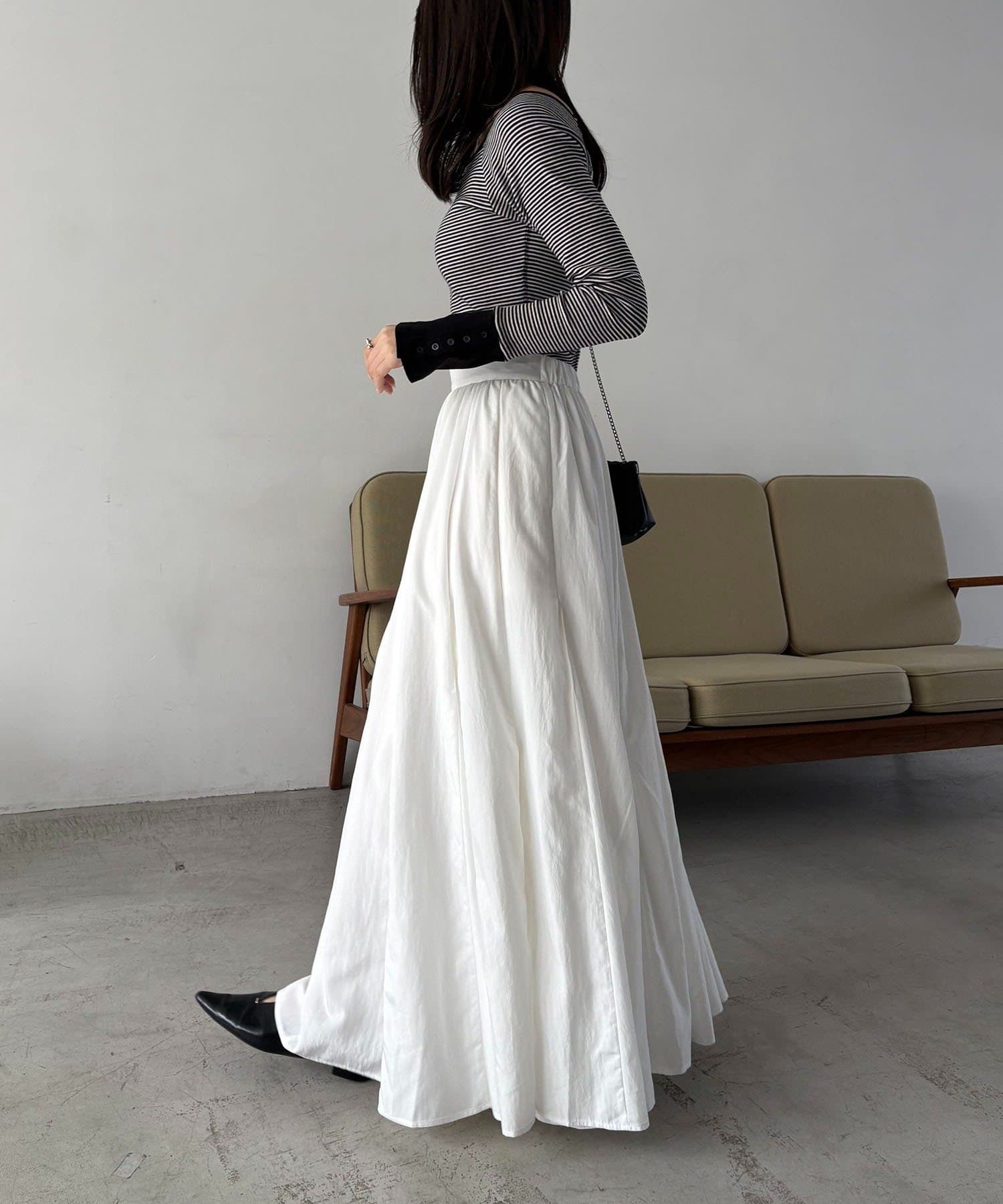・コンパクトなリブTやシアートップスを合わせて女性らしく