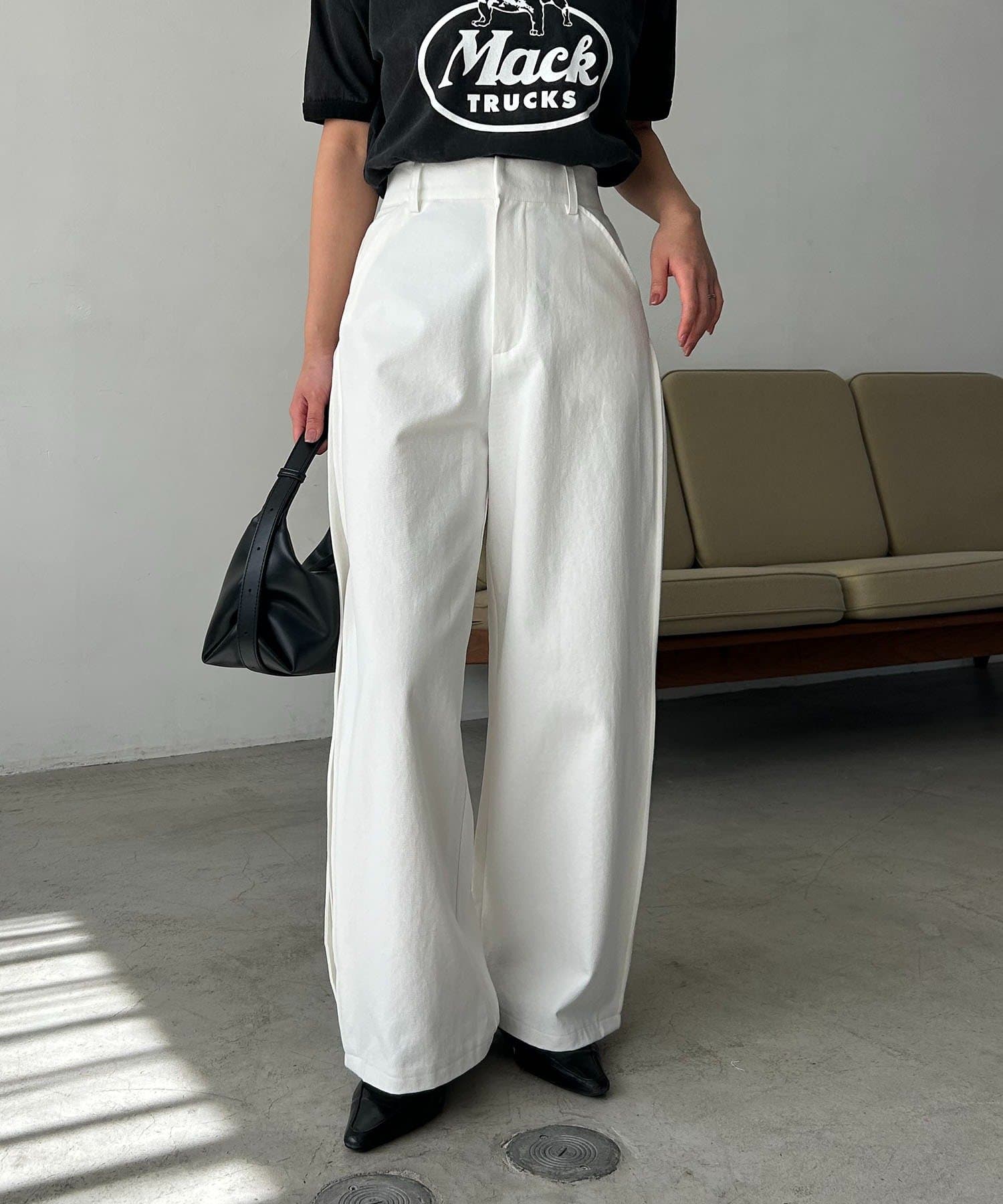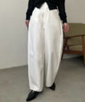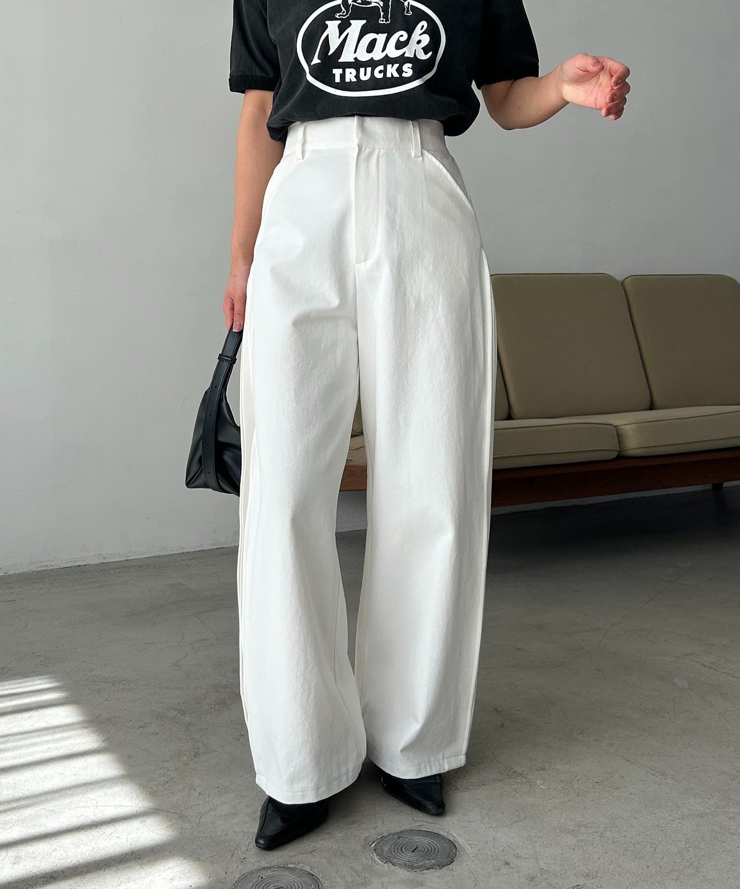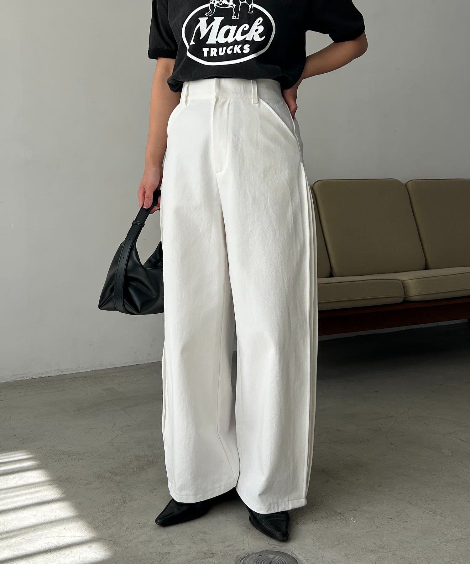 ・脇にタックを入れたややカーブラインを描くパンツ