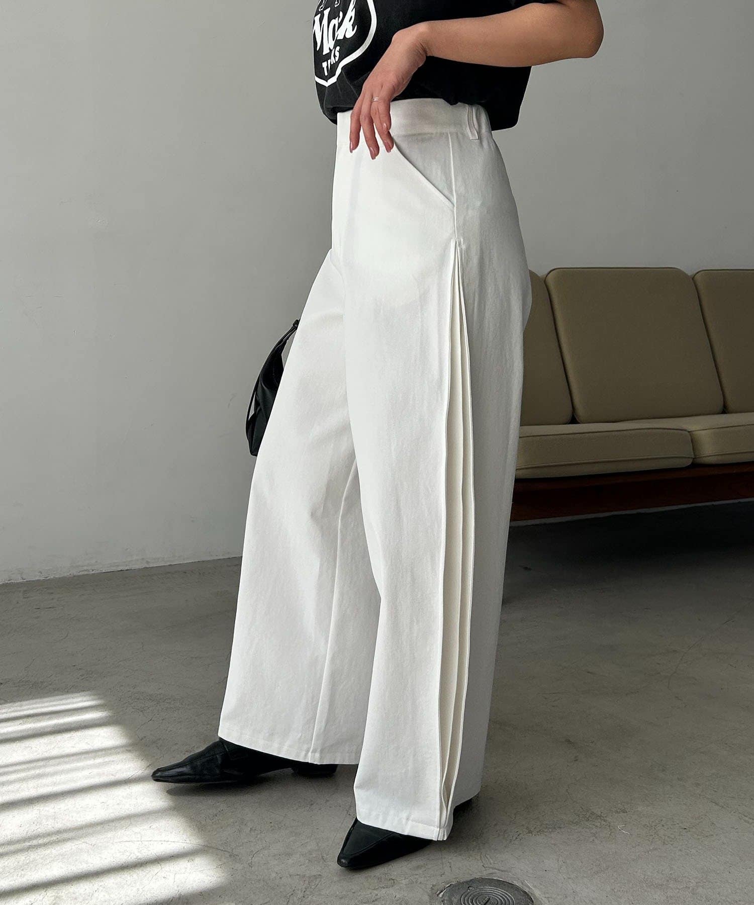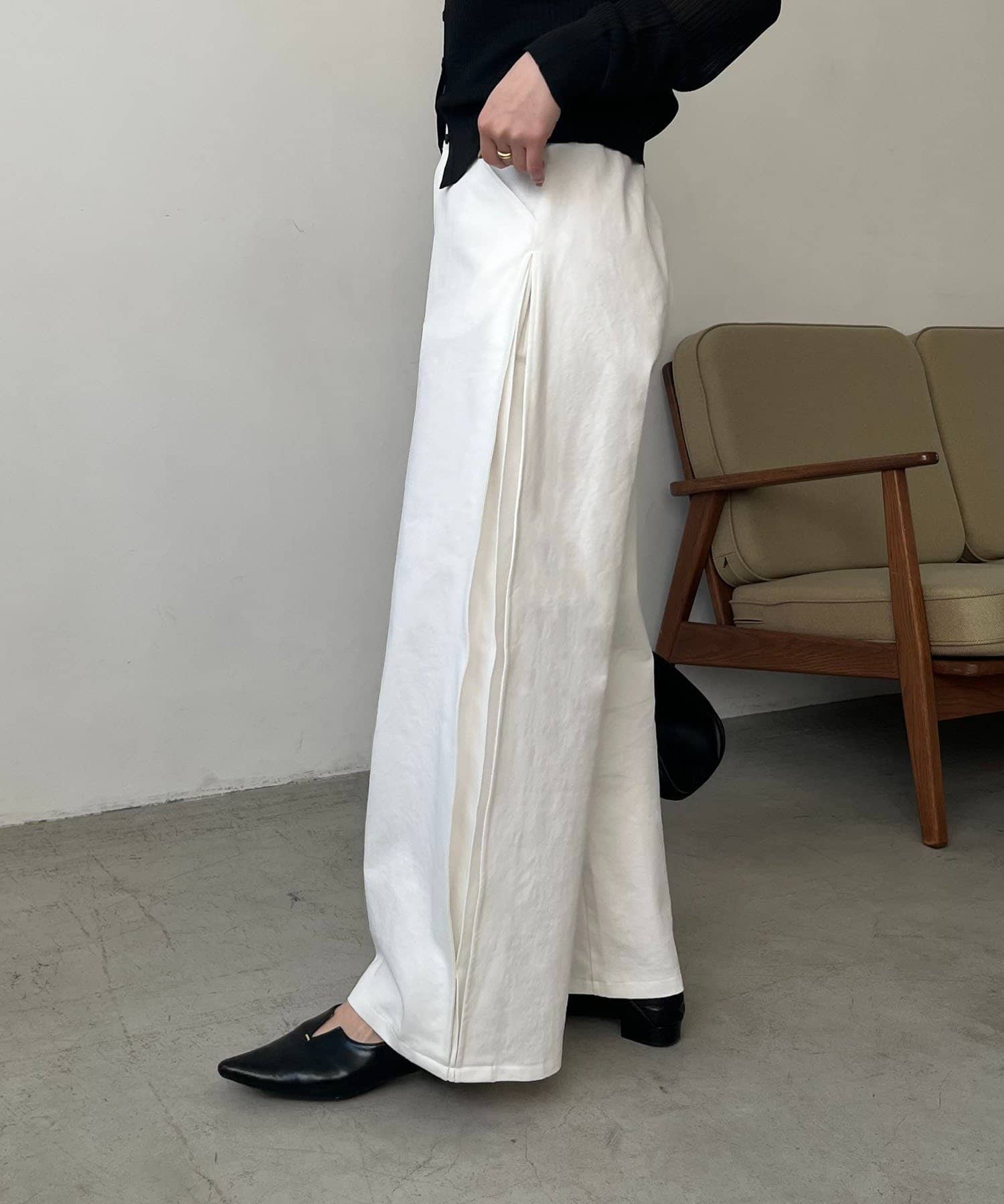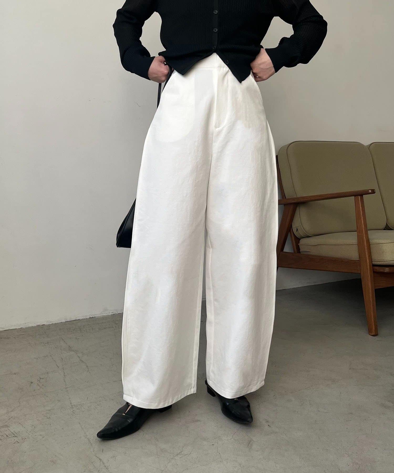 ・脇にタックを入れたややカーブラインを描くパンツ