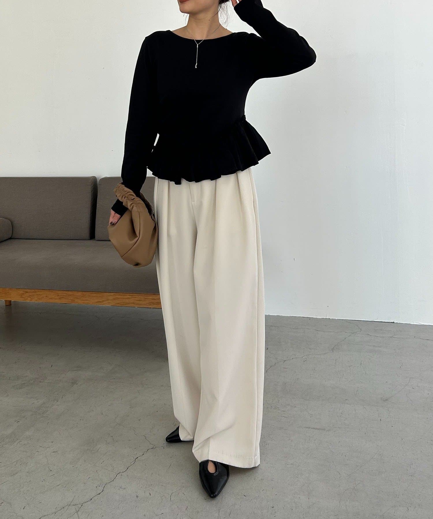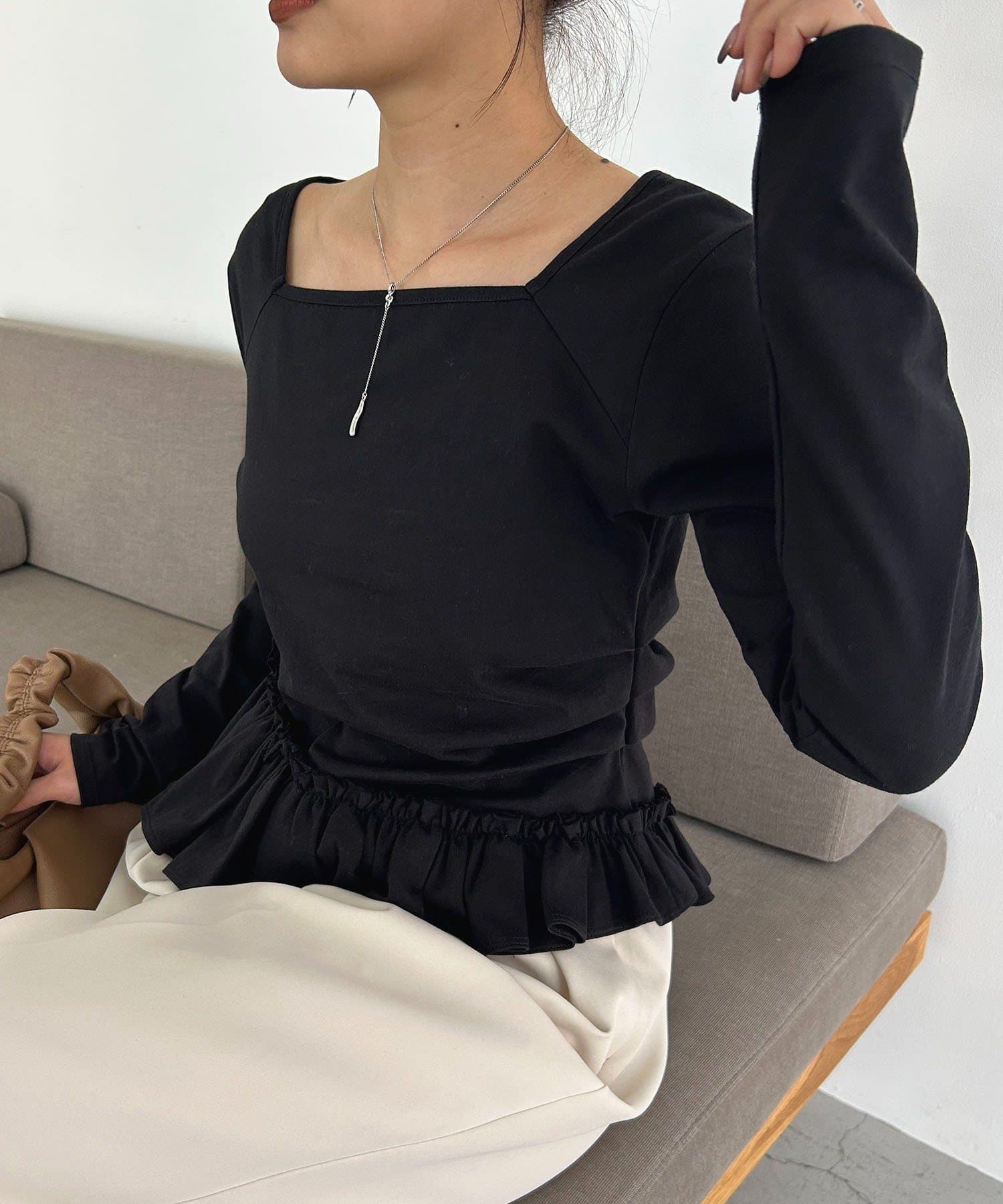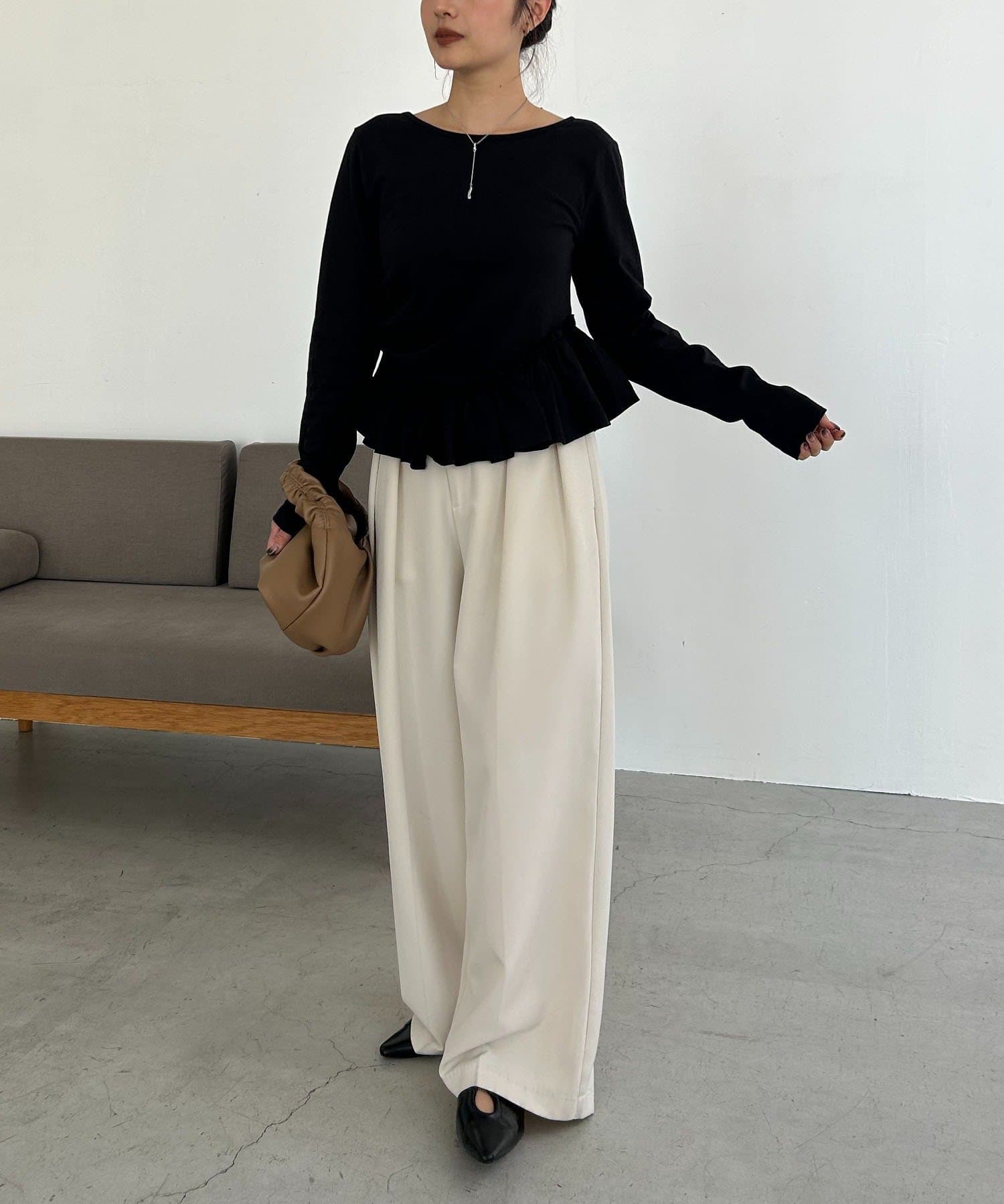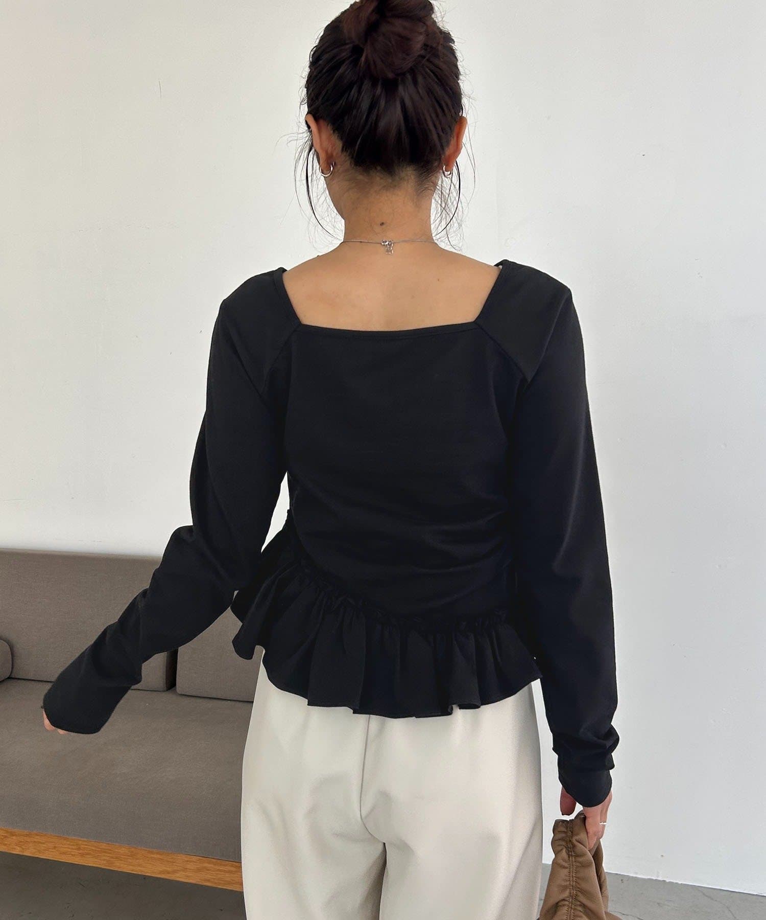 ・フリルデザインが女性らしいペプラムトップス