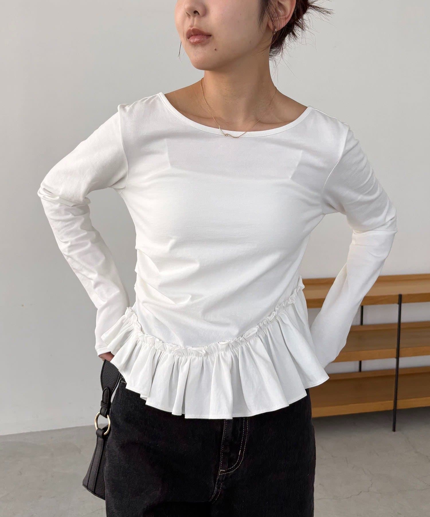 ・フリルデザインが女性らしいペプラムトップス