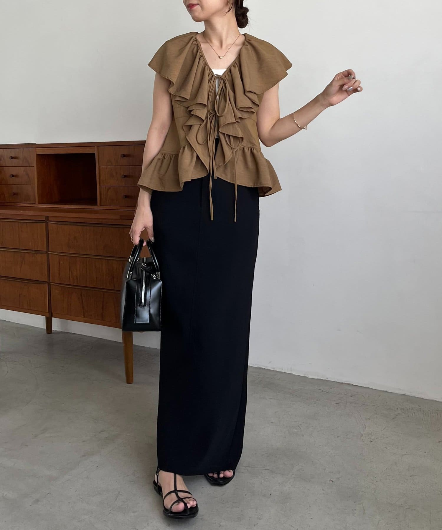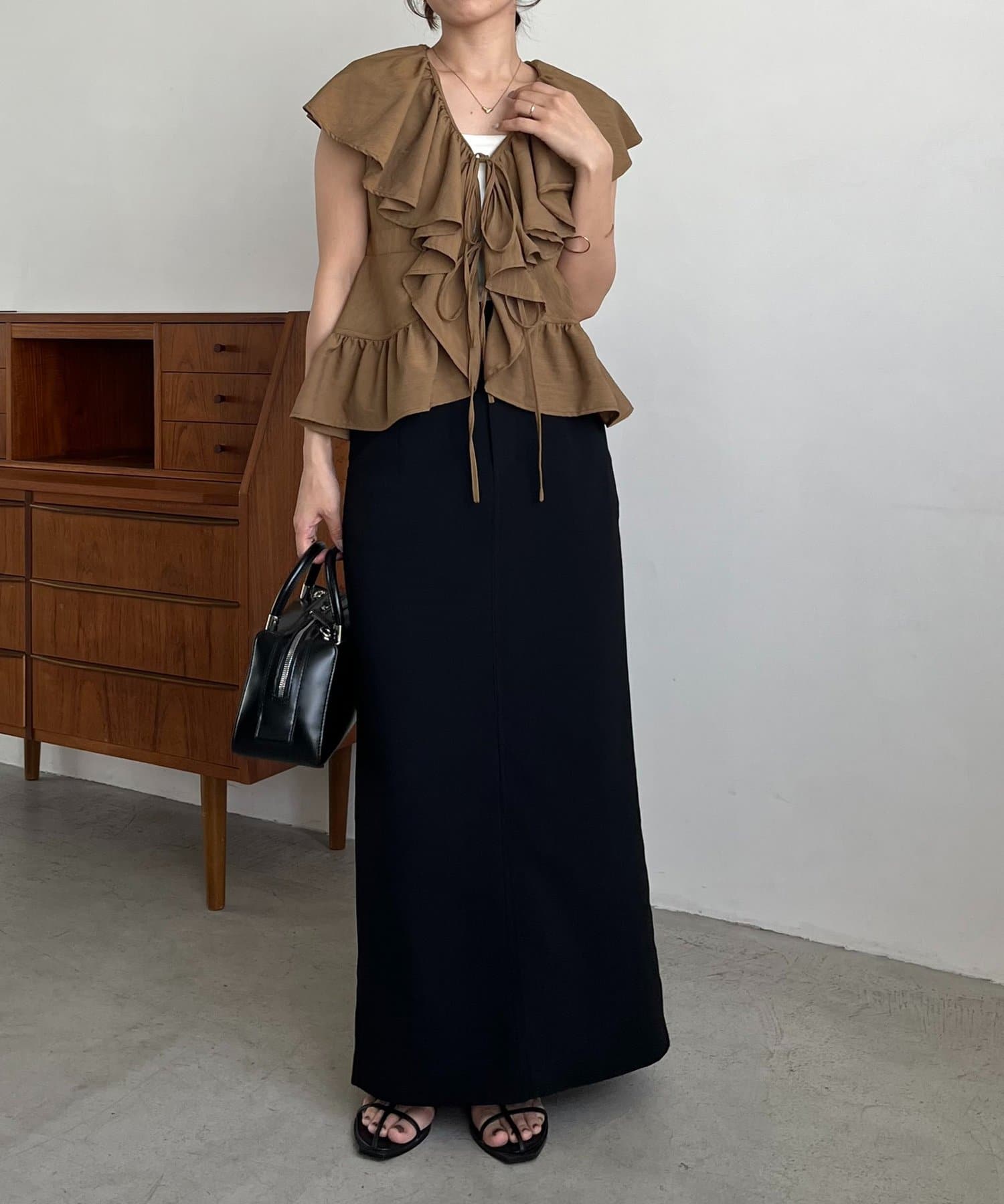 ・マキシIラインスカート合わせの女性らしいスタイリングもおすすめ