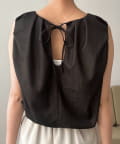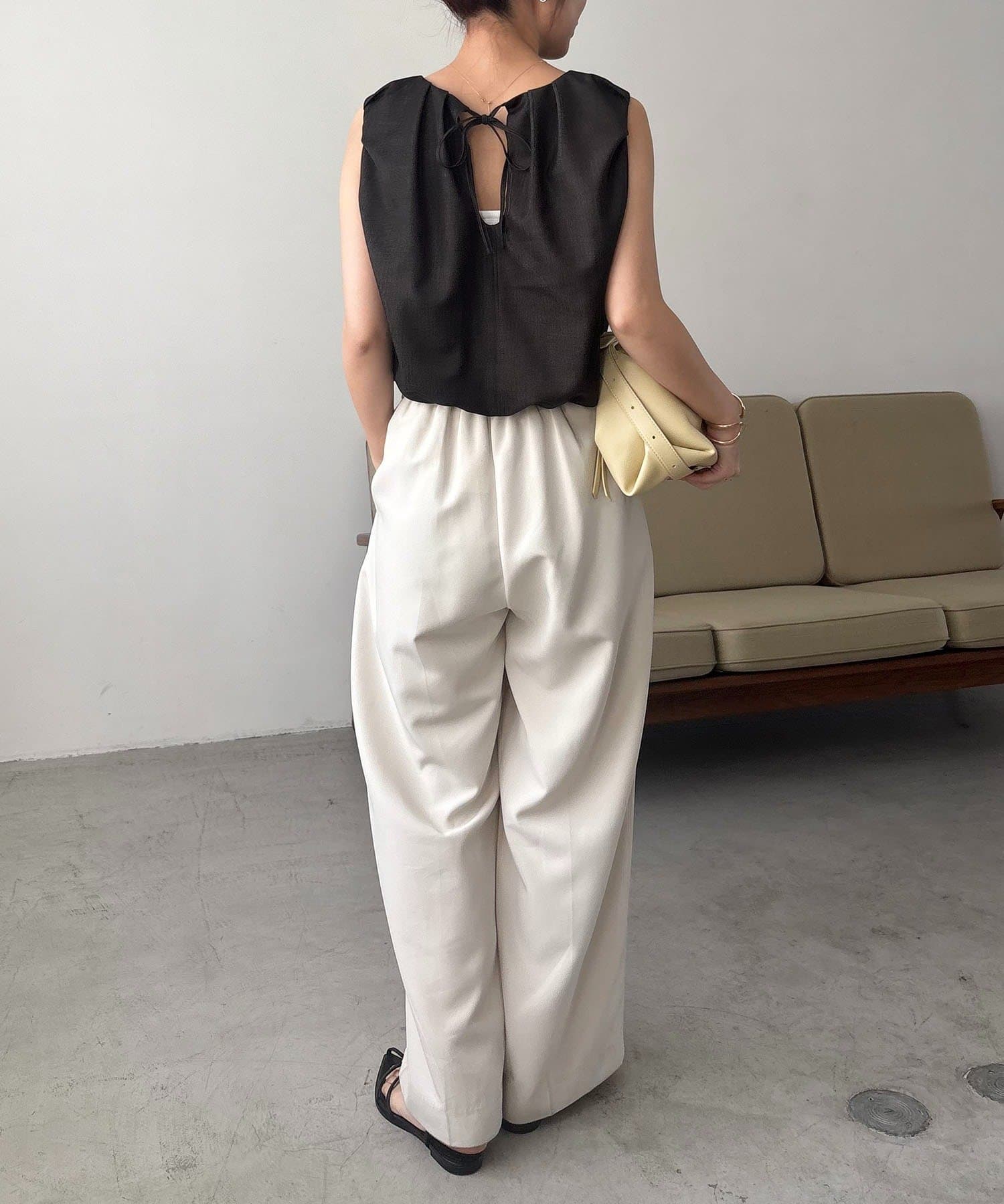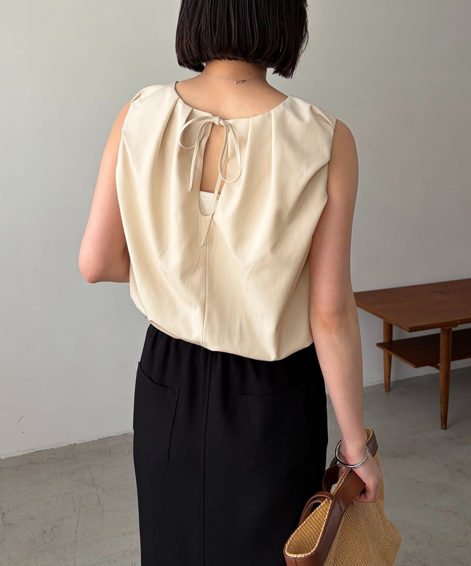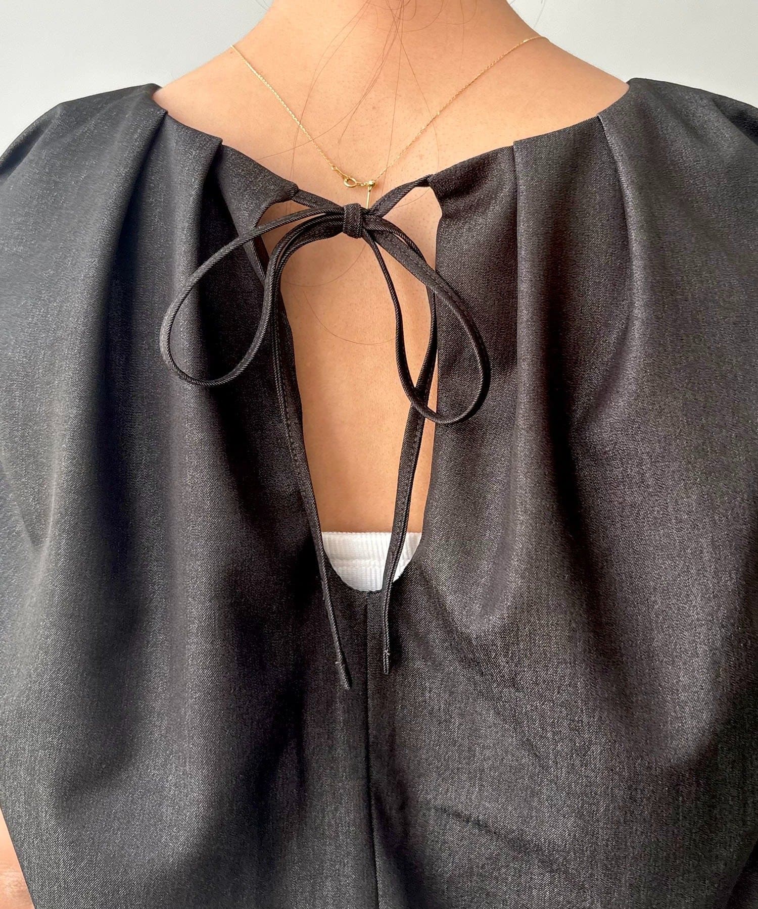 ・背中の涙あきを華奢なリボンで結ぶ仕様。程よい肌見せが、大人の抜け感を演出◎