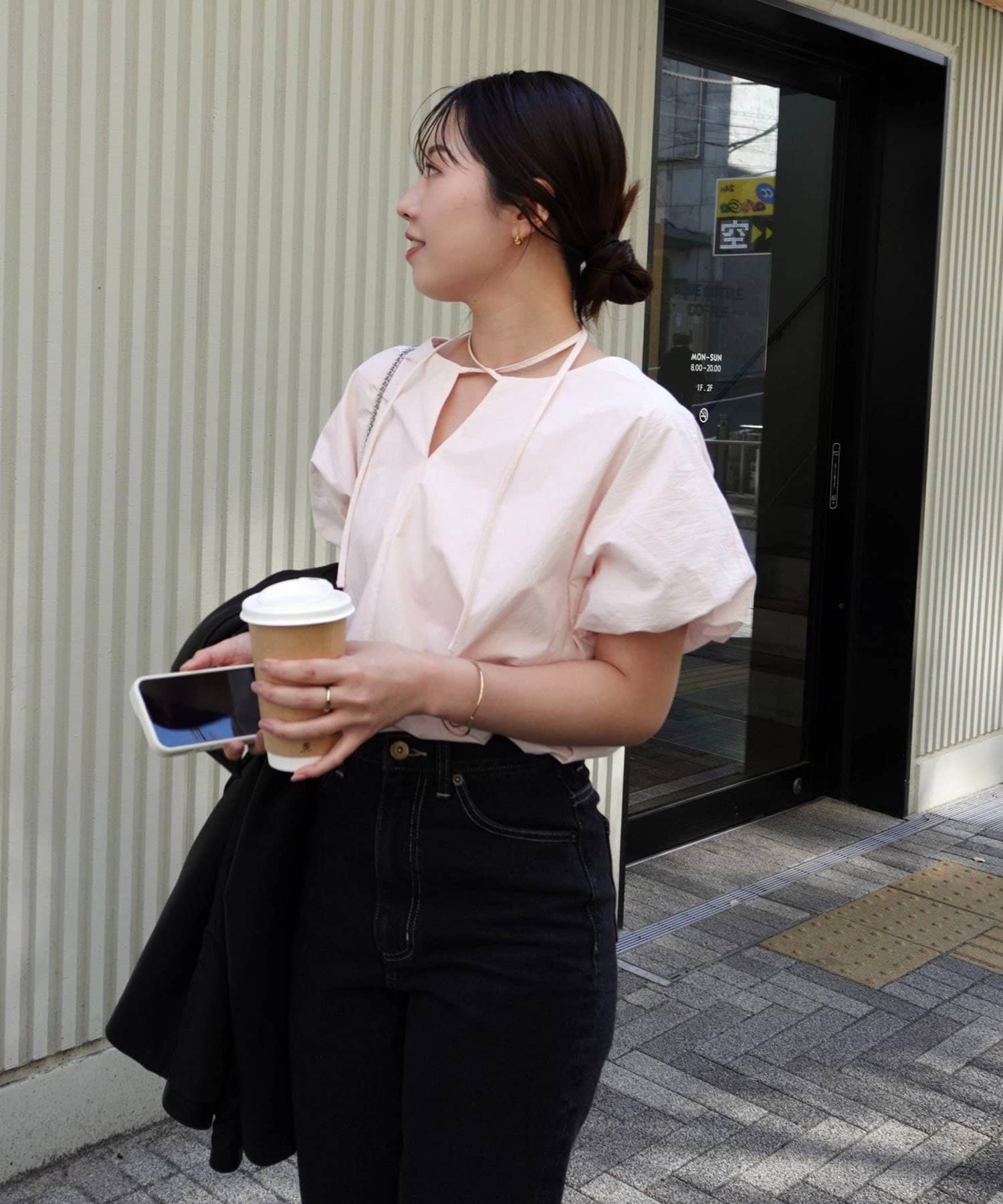 購入場所:パルクローゼット一見シンプルなブラウスですが、首の紐の付け方・結び方によっては印象が変わるため着回ししやすいです。