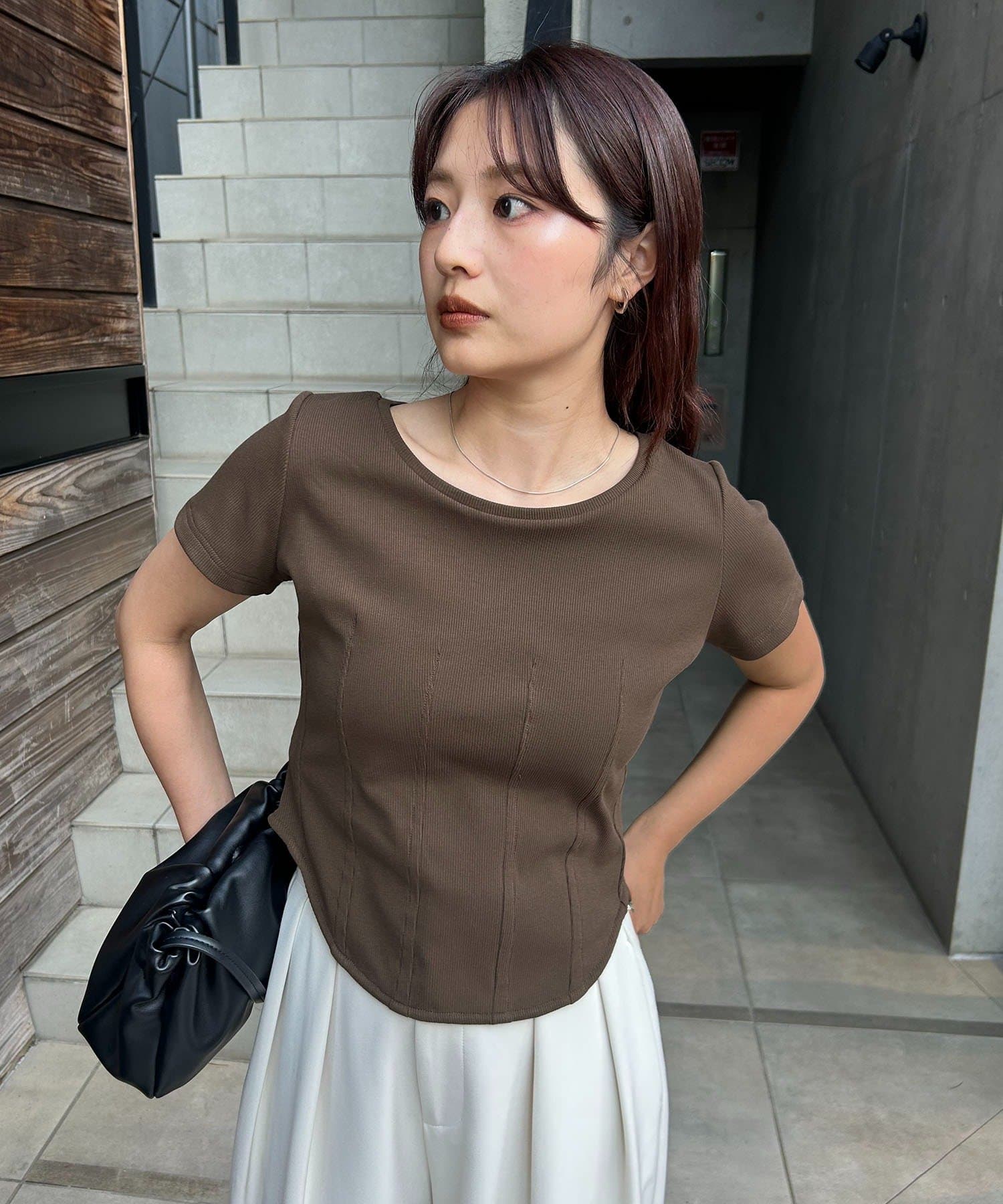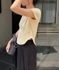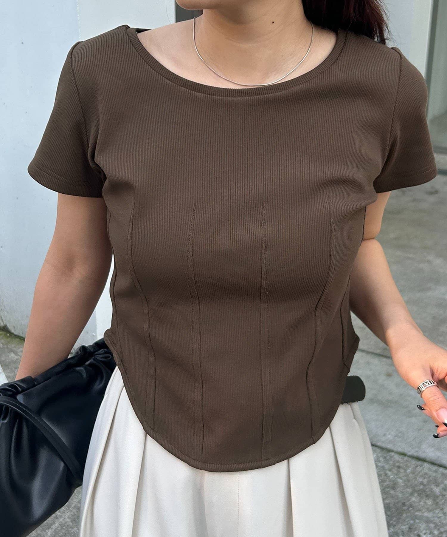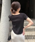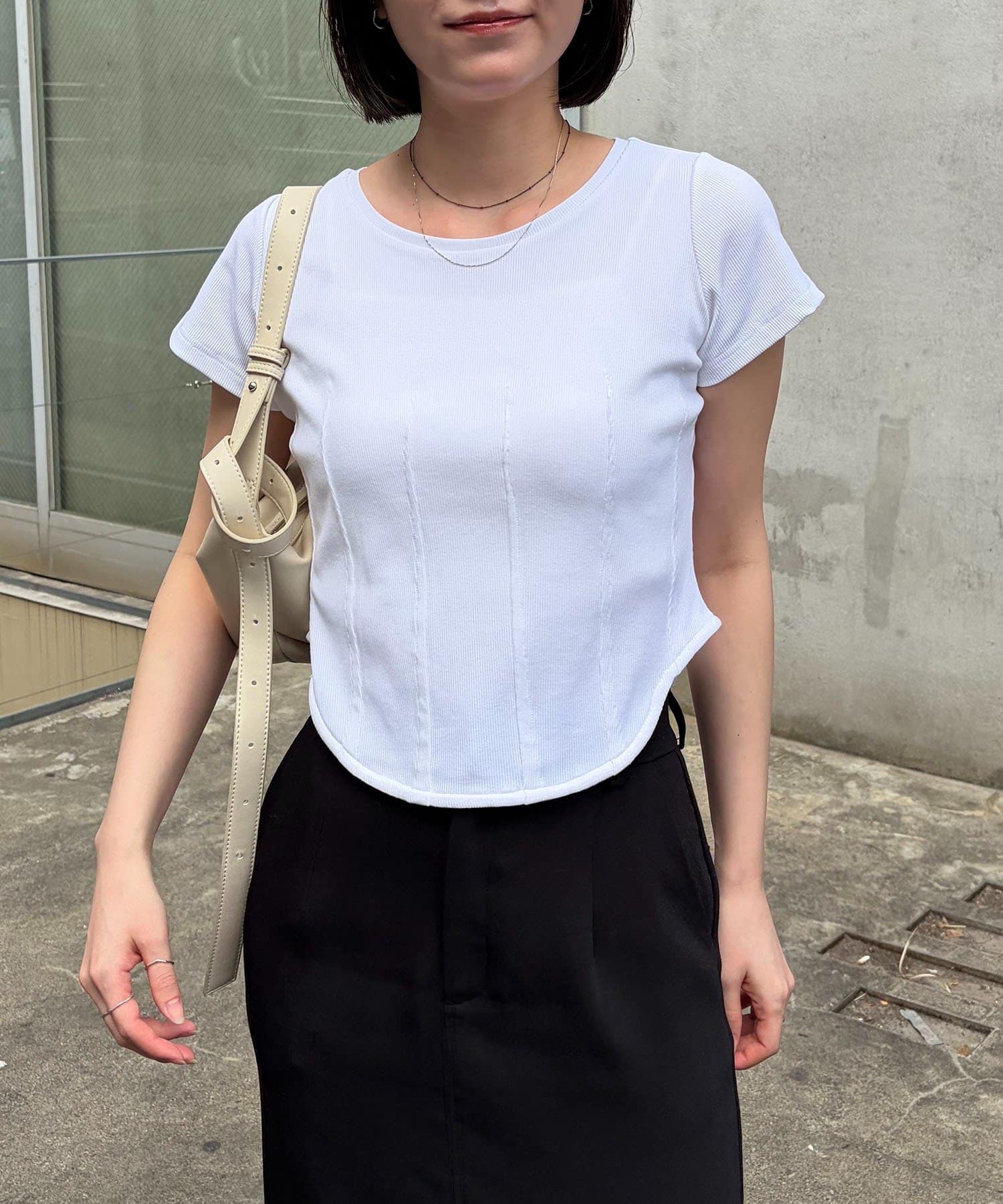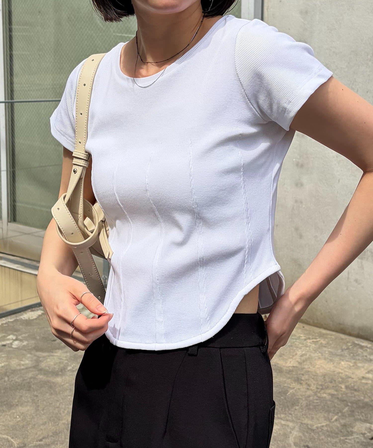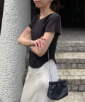 ・インせずに裾のラウンドを見せて着るスタイリングでトレンド感アップ