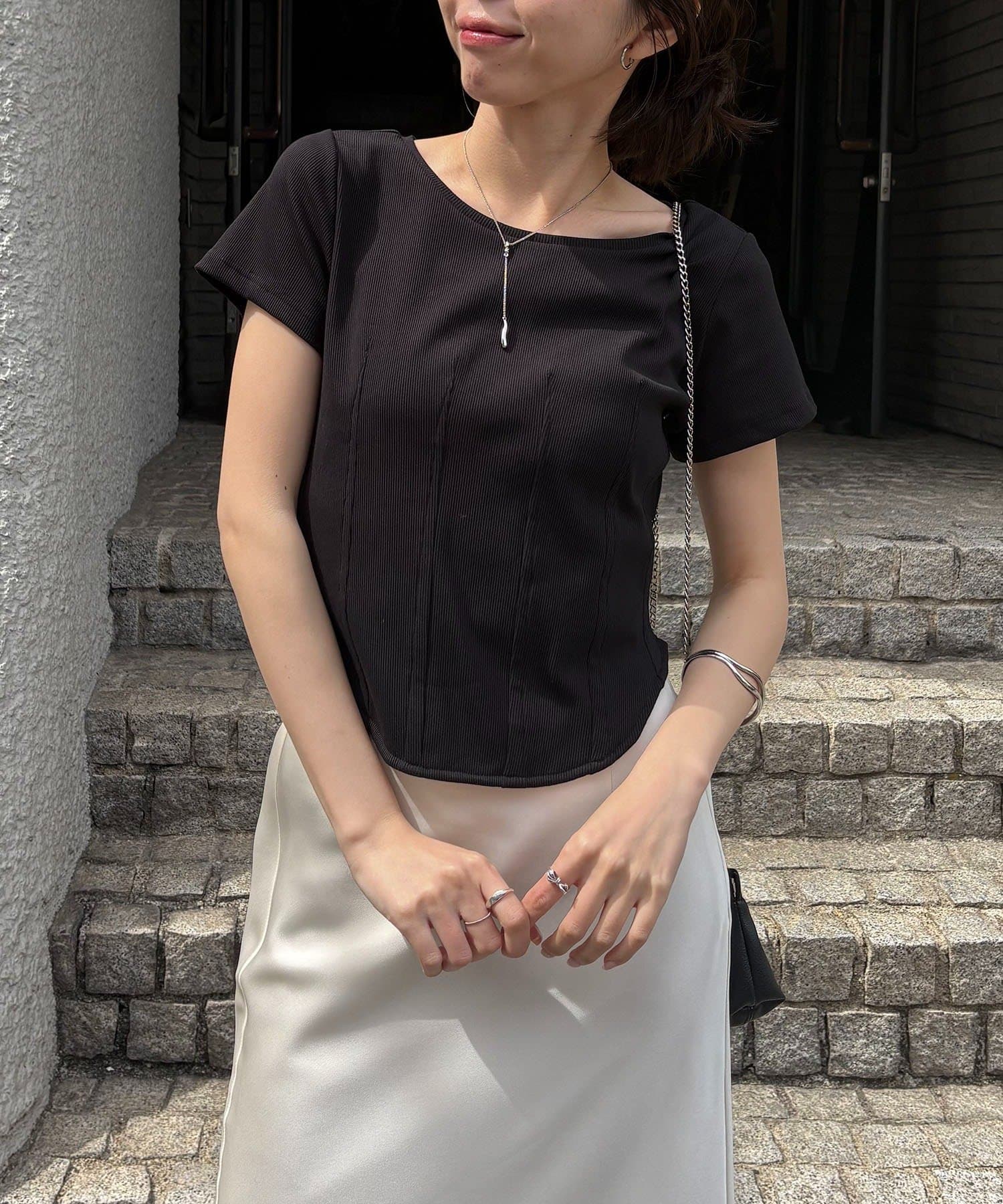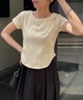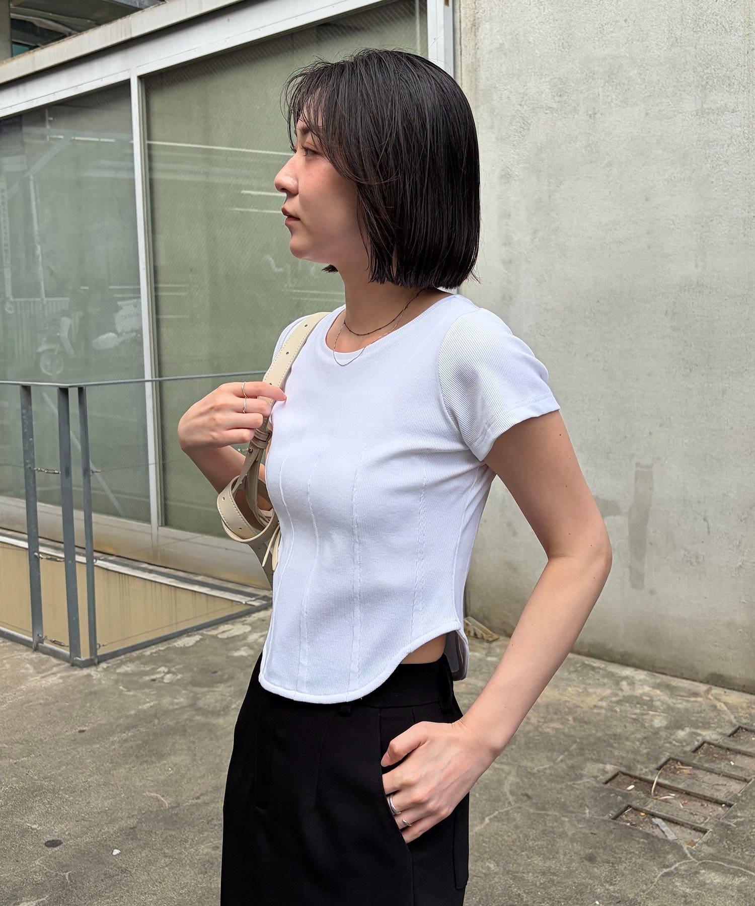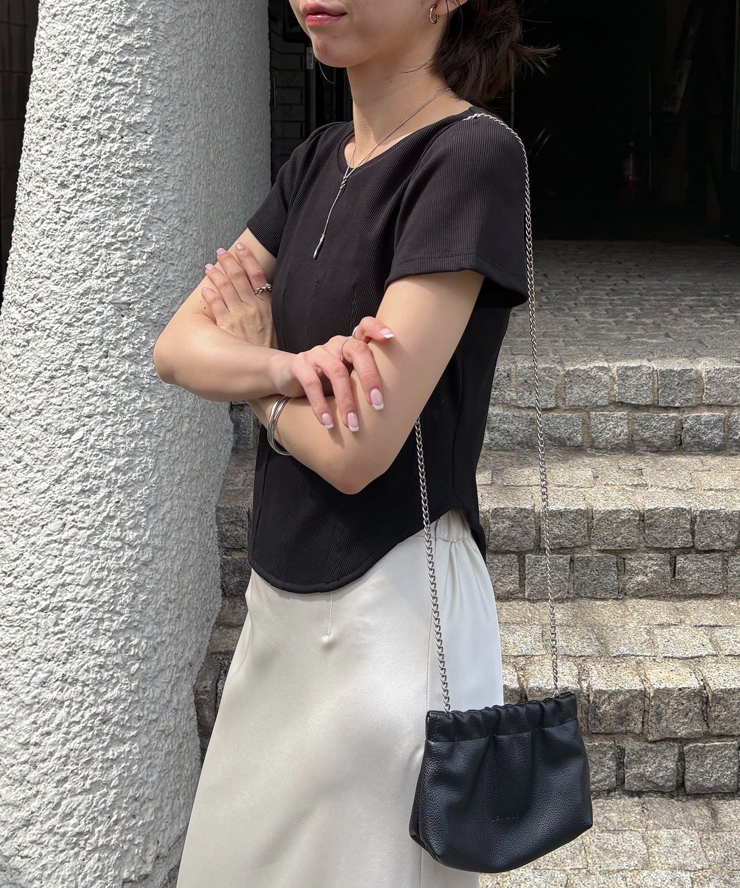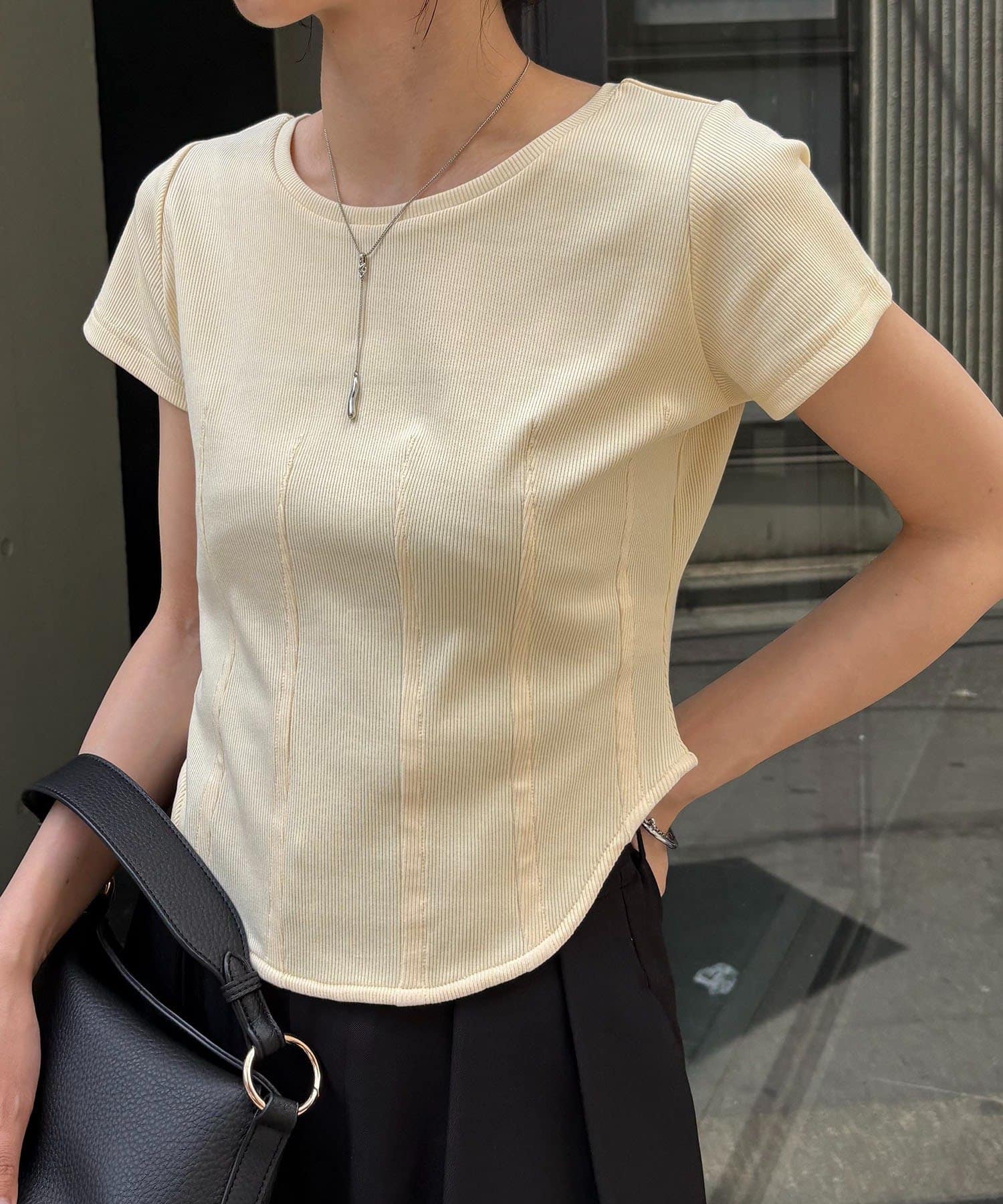 ・インせずに裾のラウンドを見せて着るスタイリングでトレンド感アップ