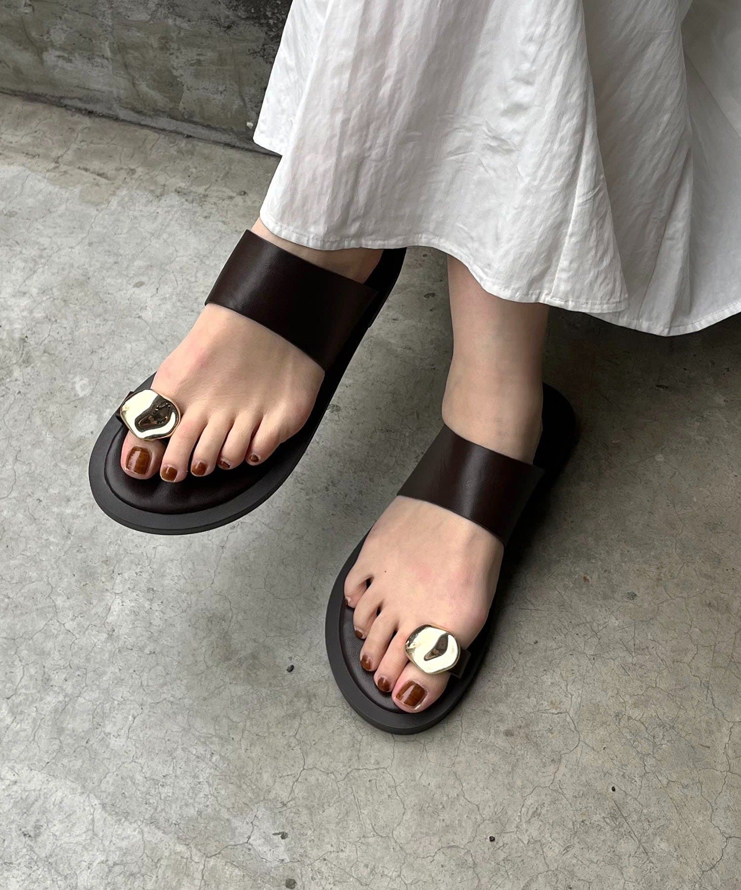 ・トング部分にメタリックパーツが付いたこなれ感漂うフラットサンダル