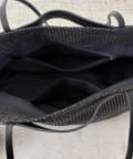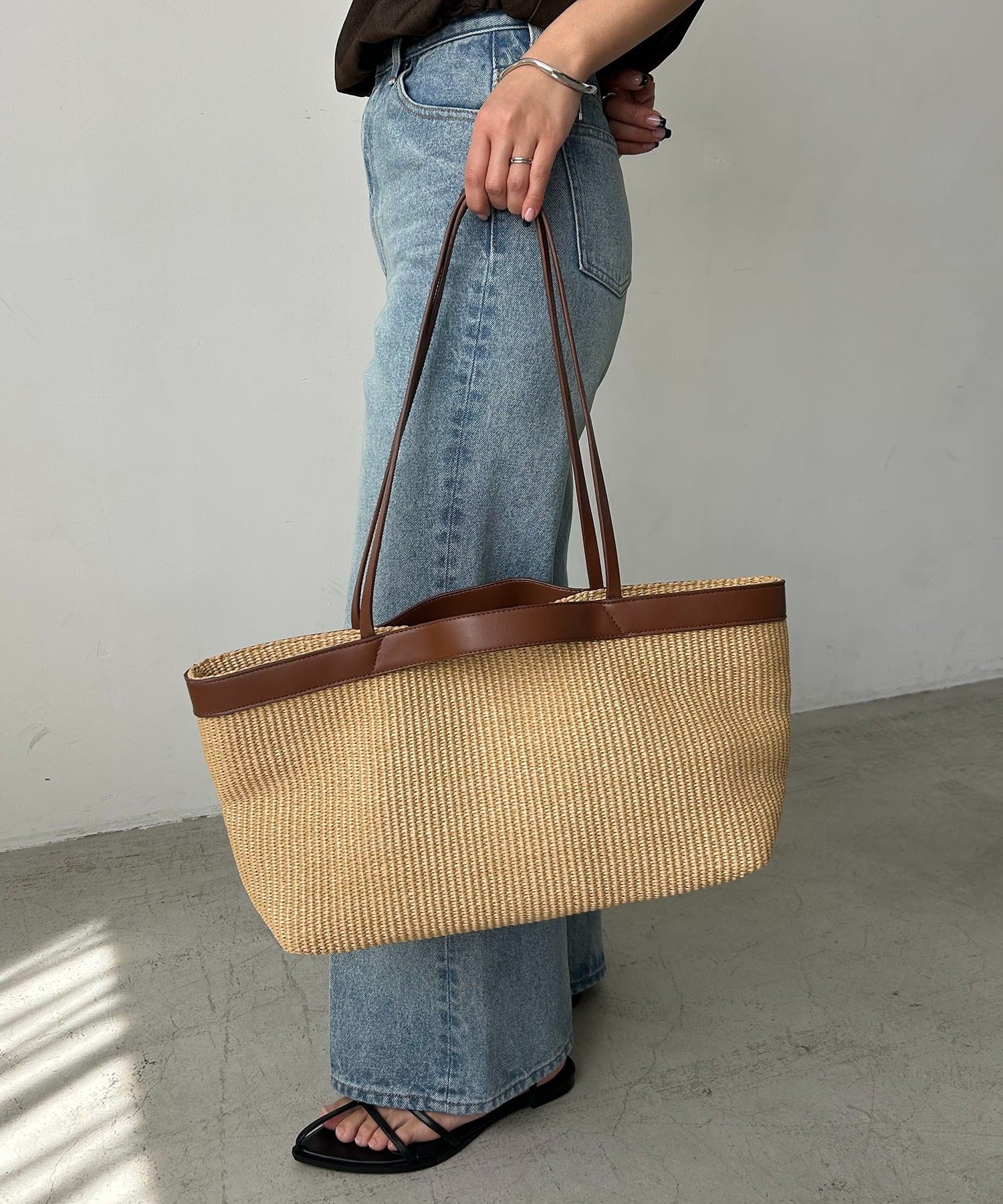 異素材コンビのデザインが目を惹くワイドトートバッグ