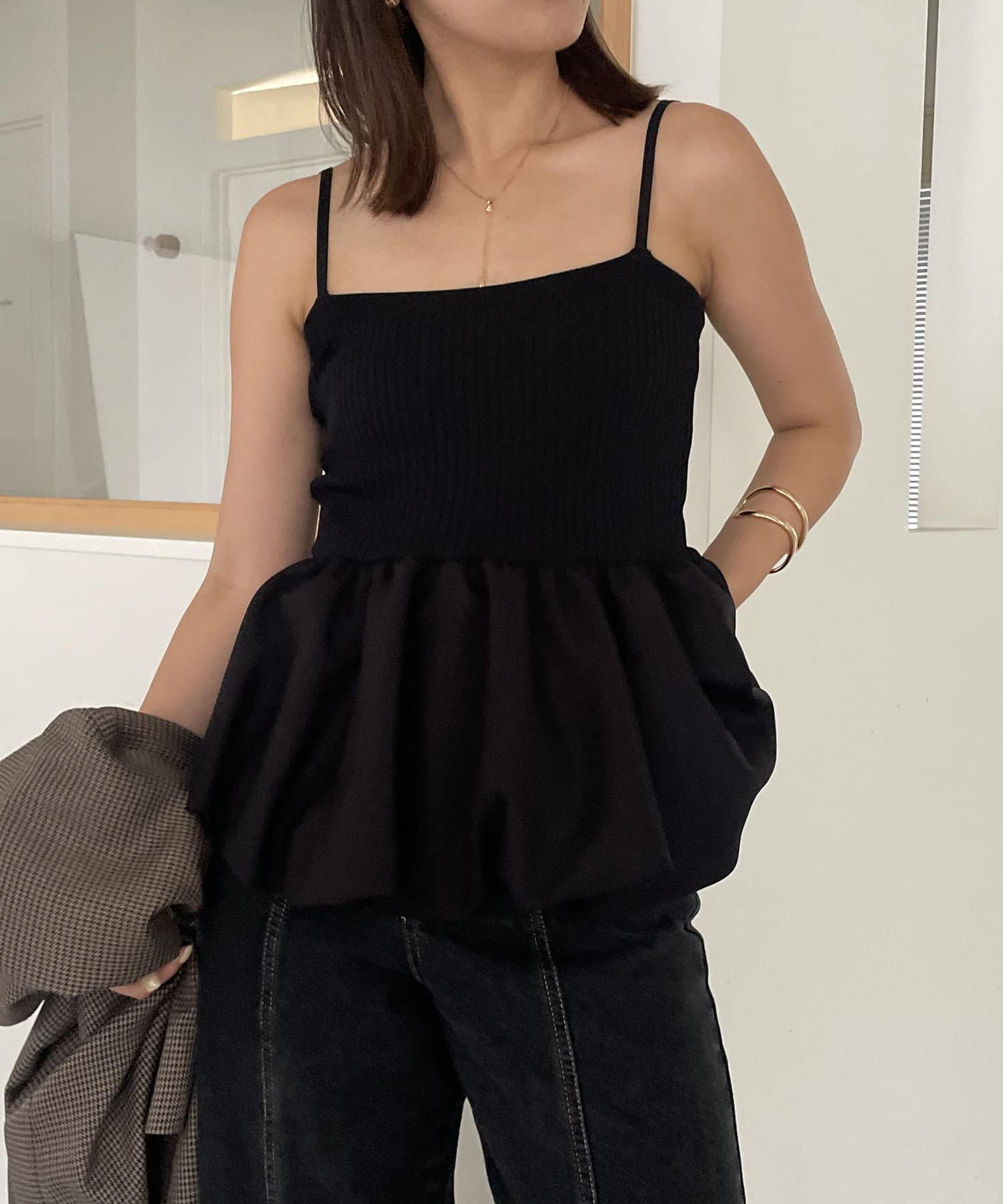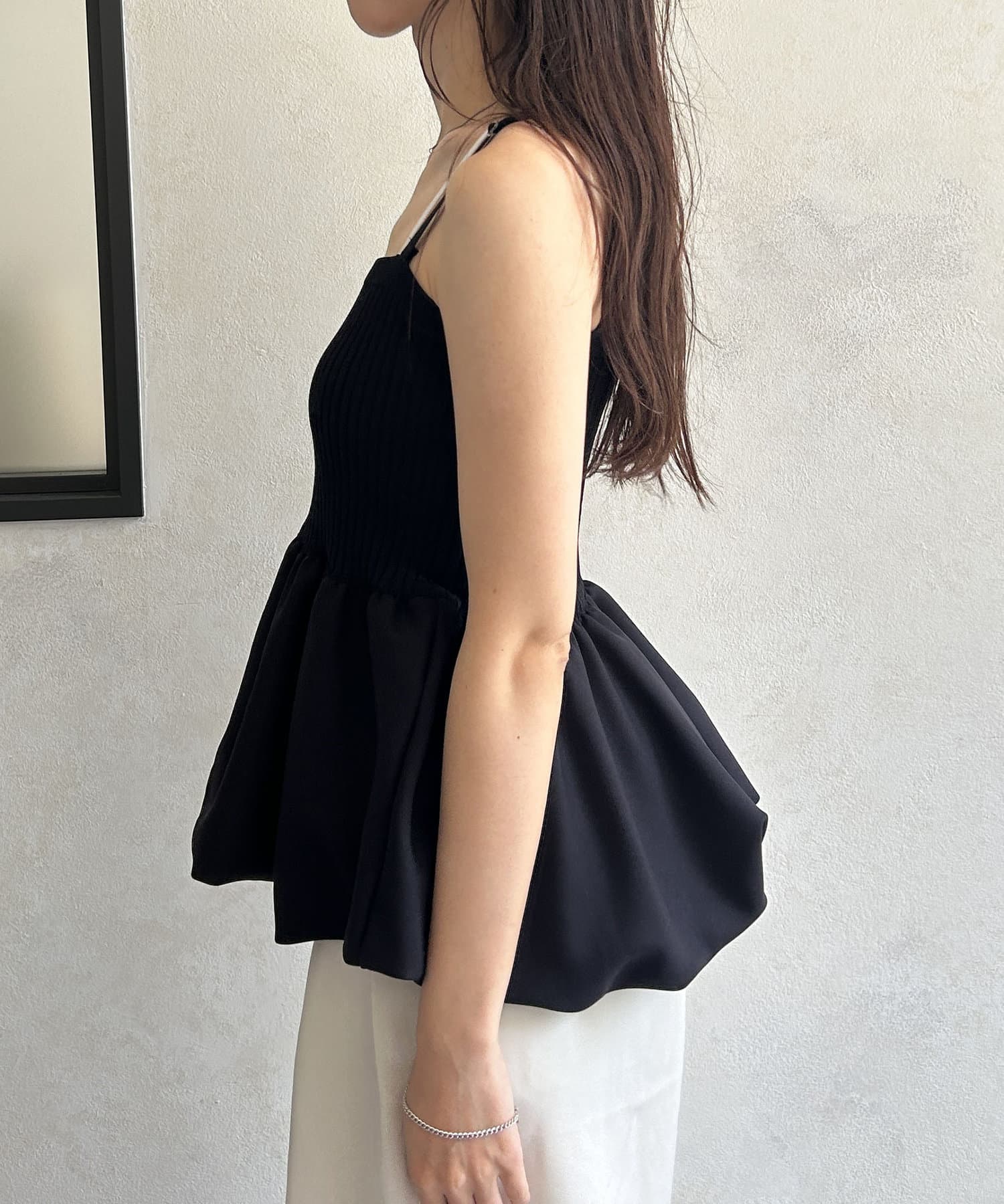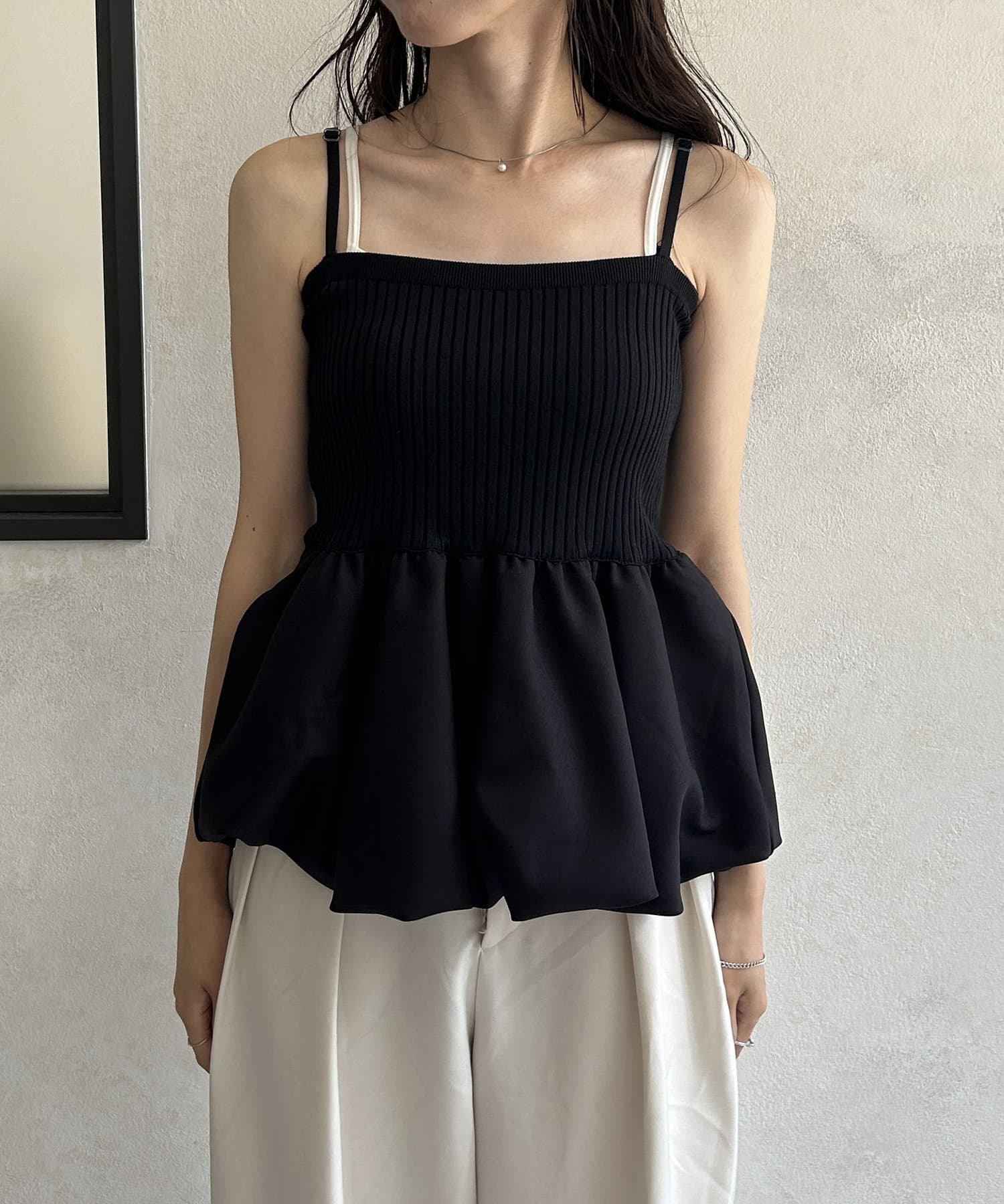 バルーンシルエットがポイントの異素材キャミ