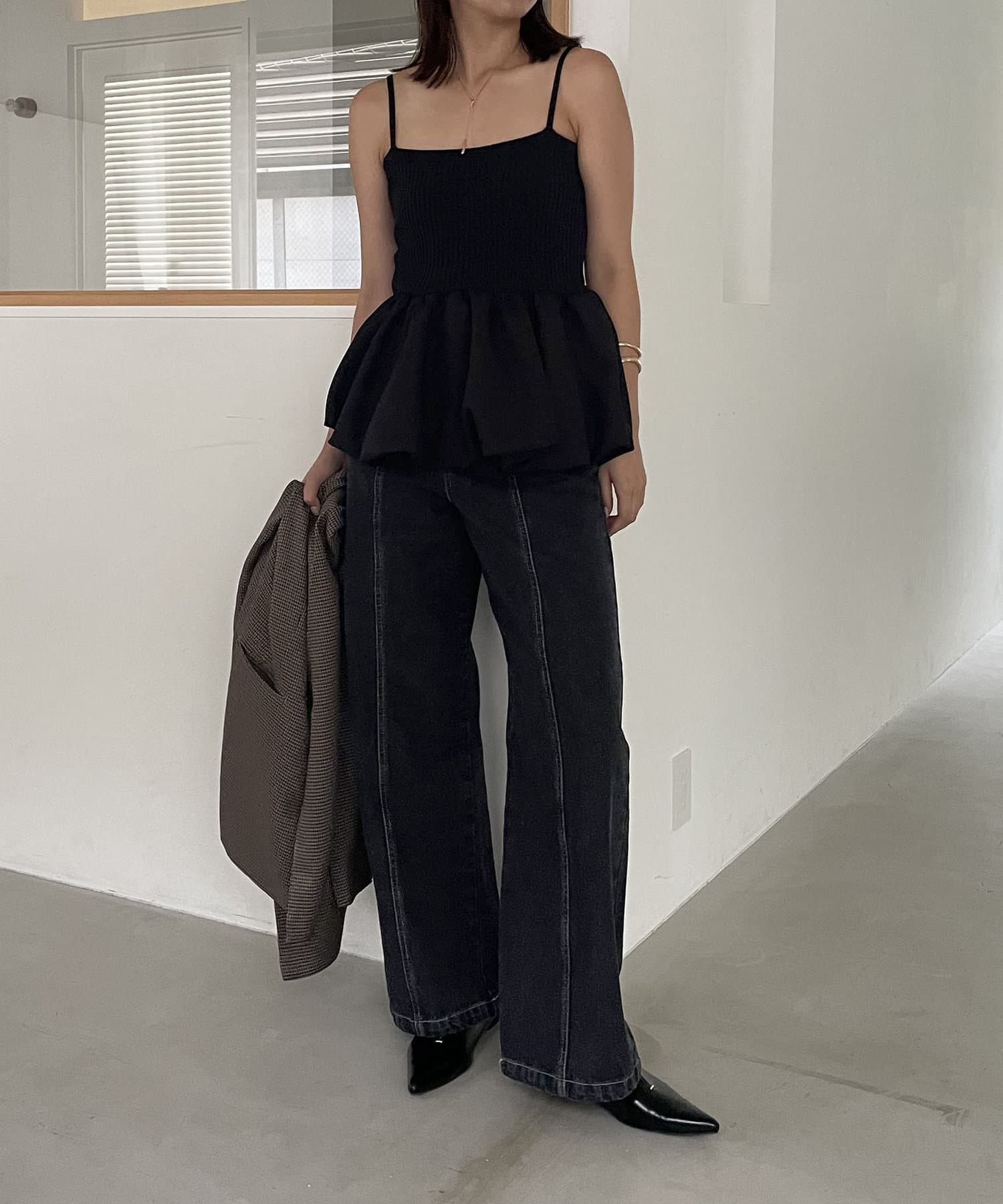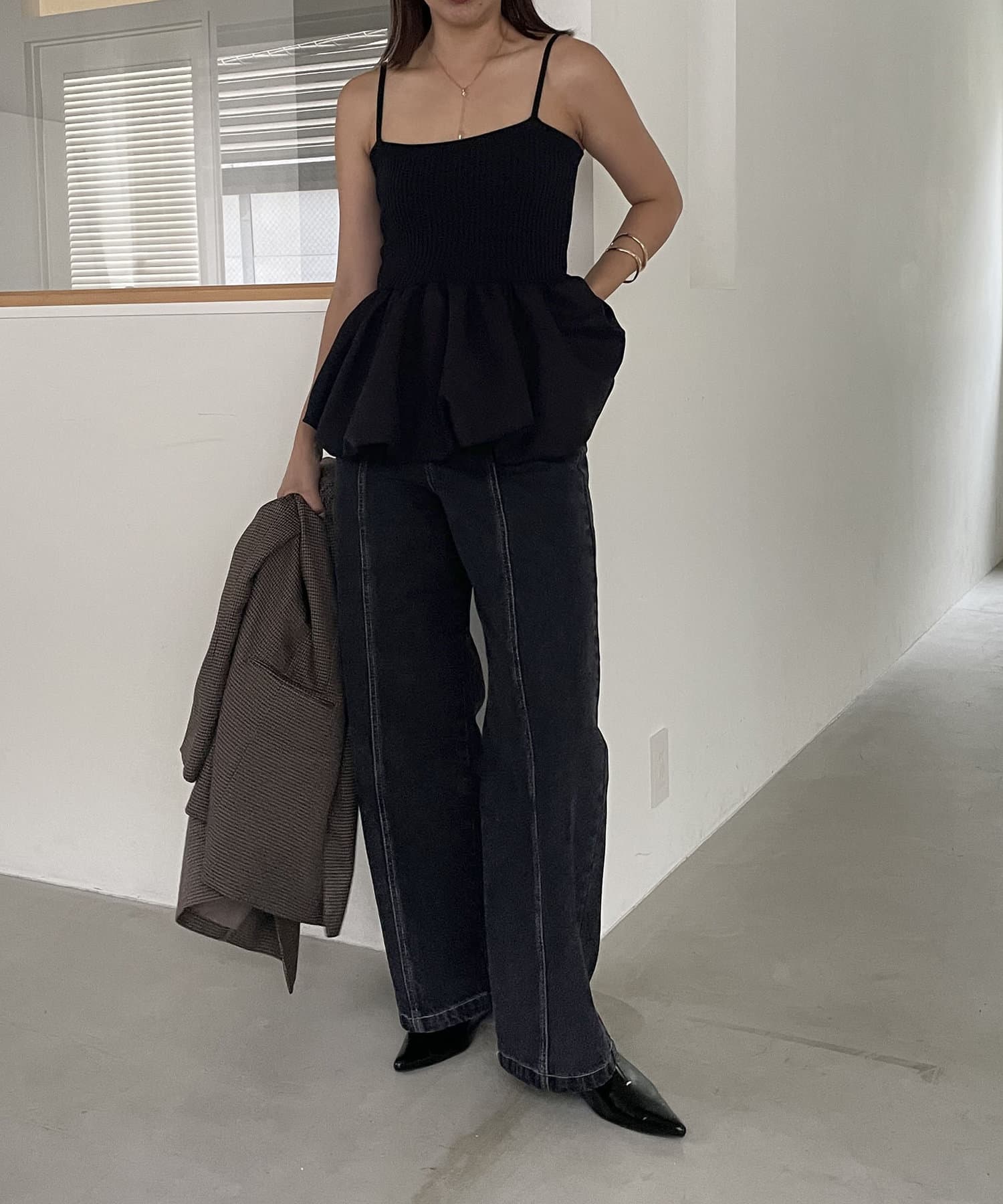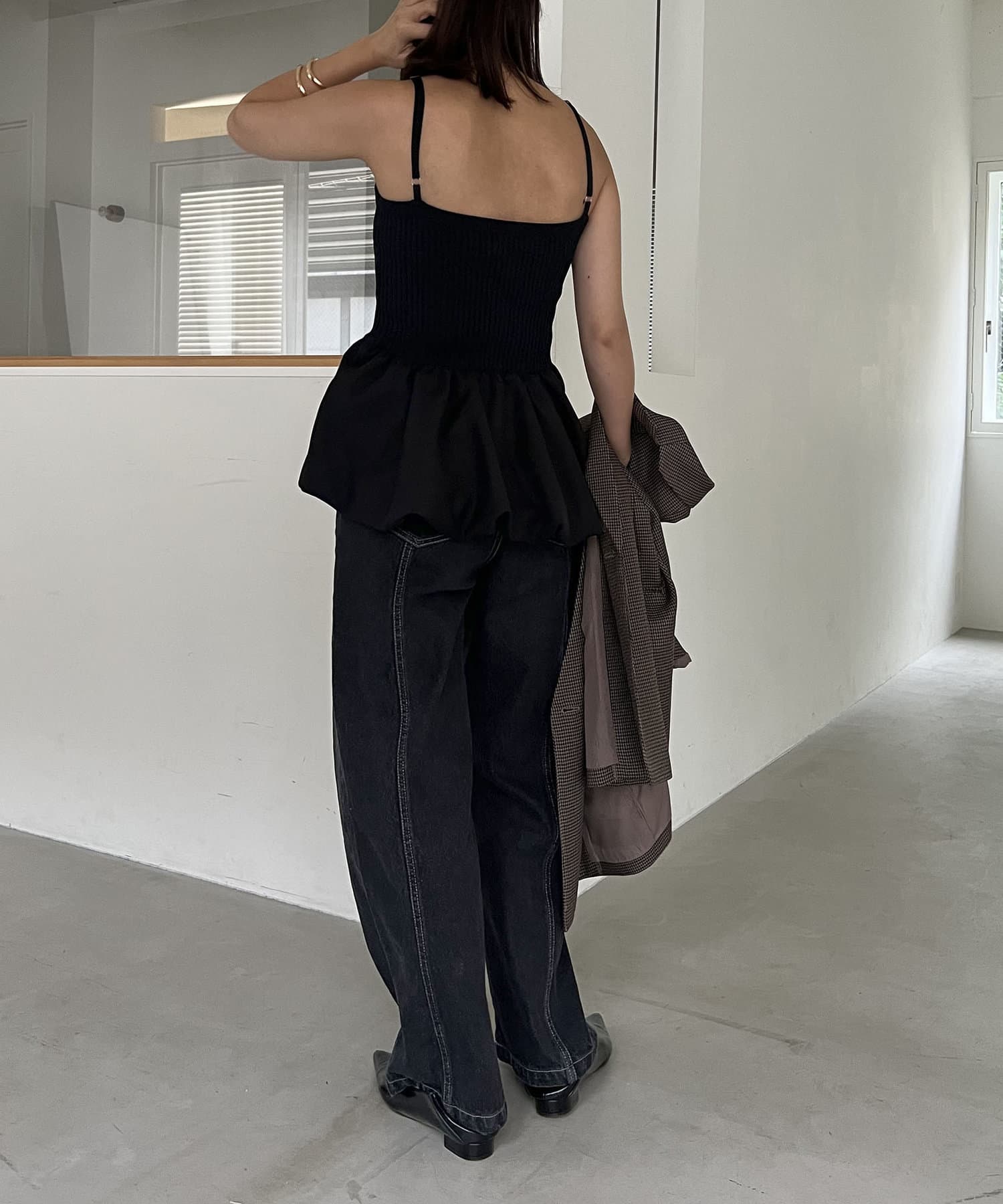 バルーンシルエットがポイントの異素材キャミ