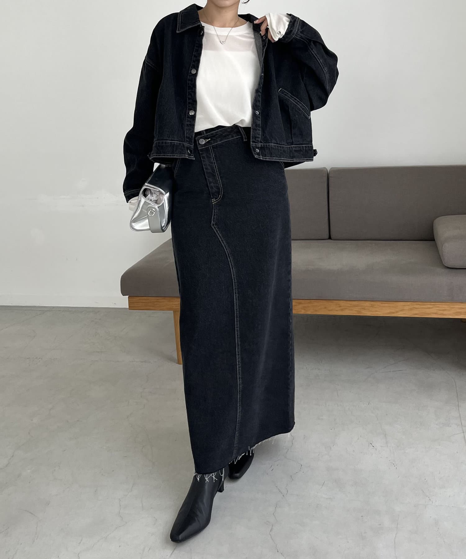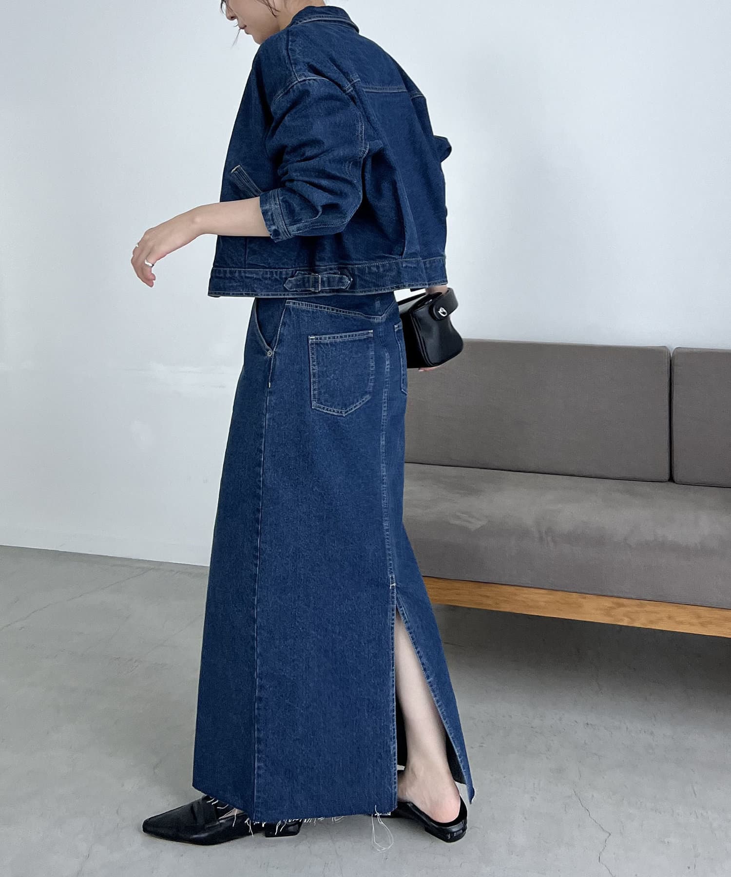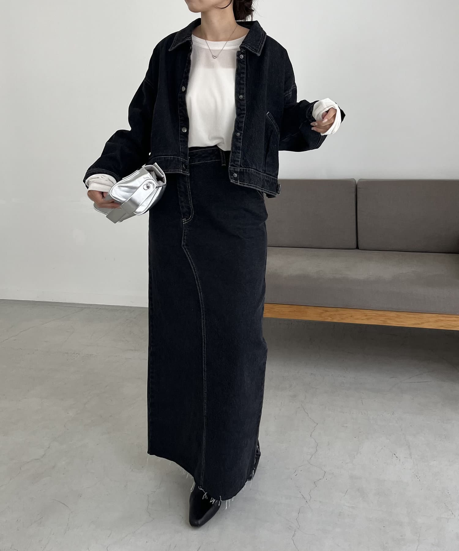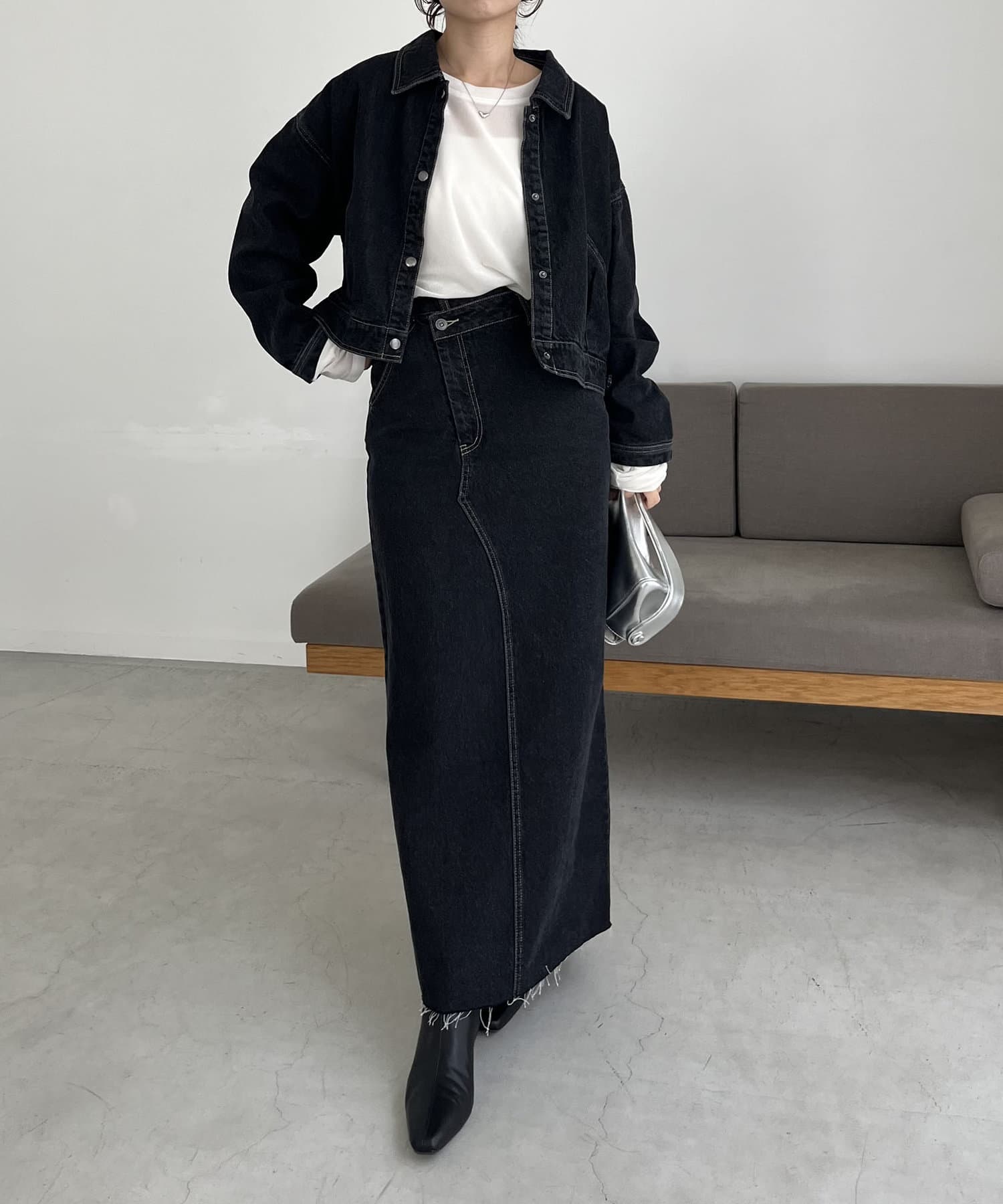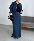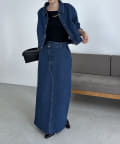 ・デニムマキシスカート、センター切替デニムはBLACK、BLUEがセットアップ対象