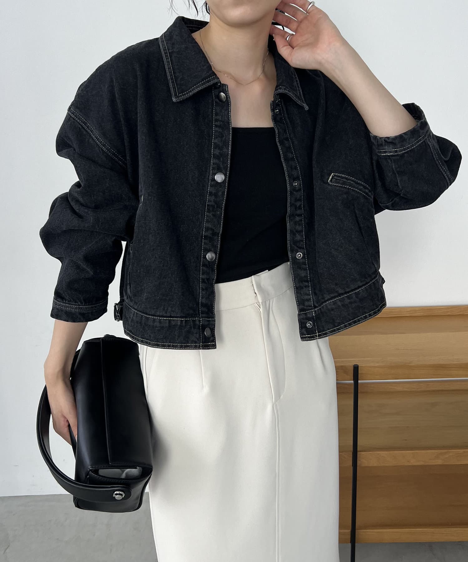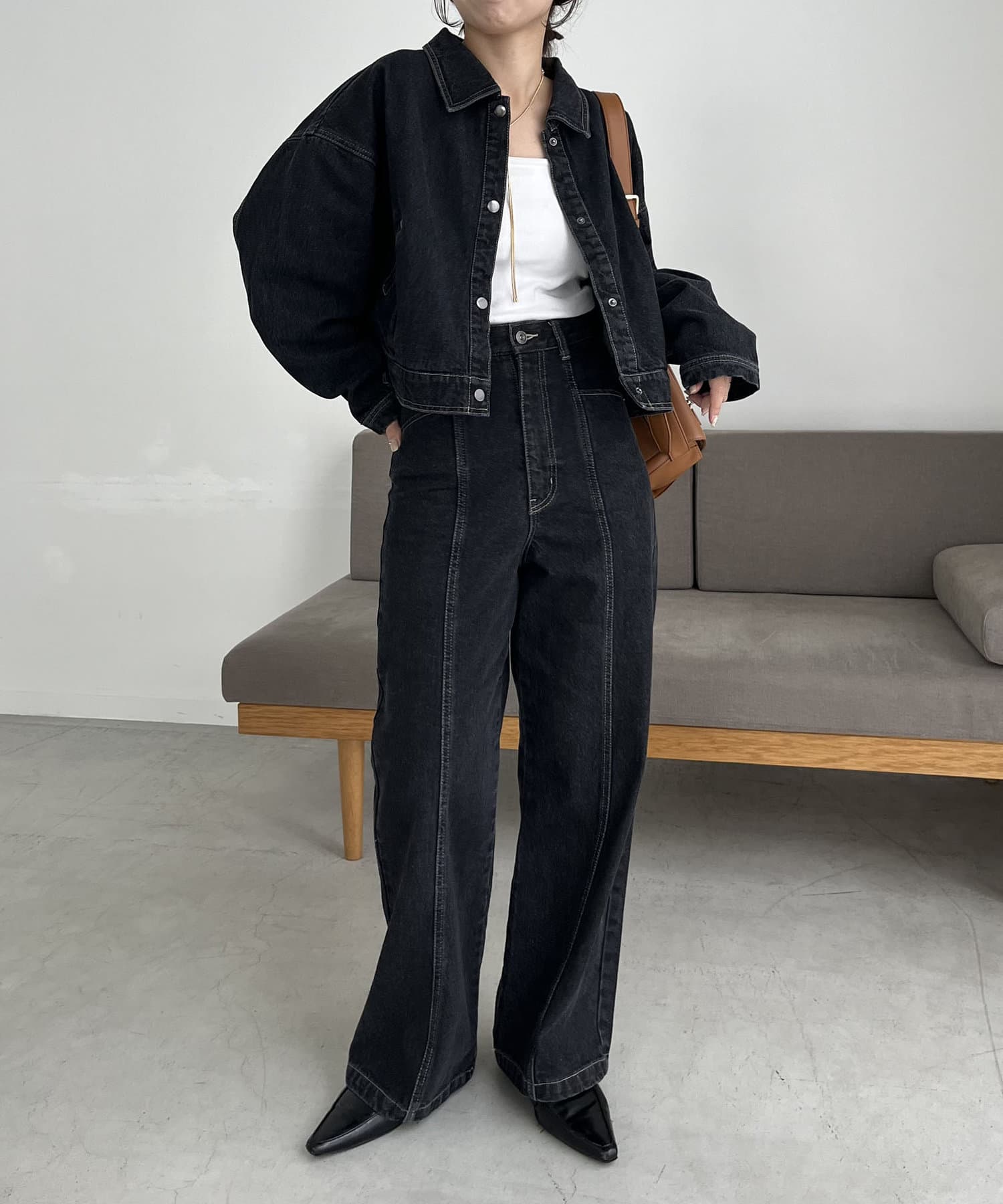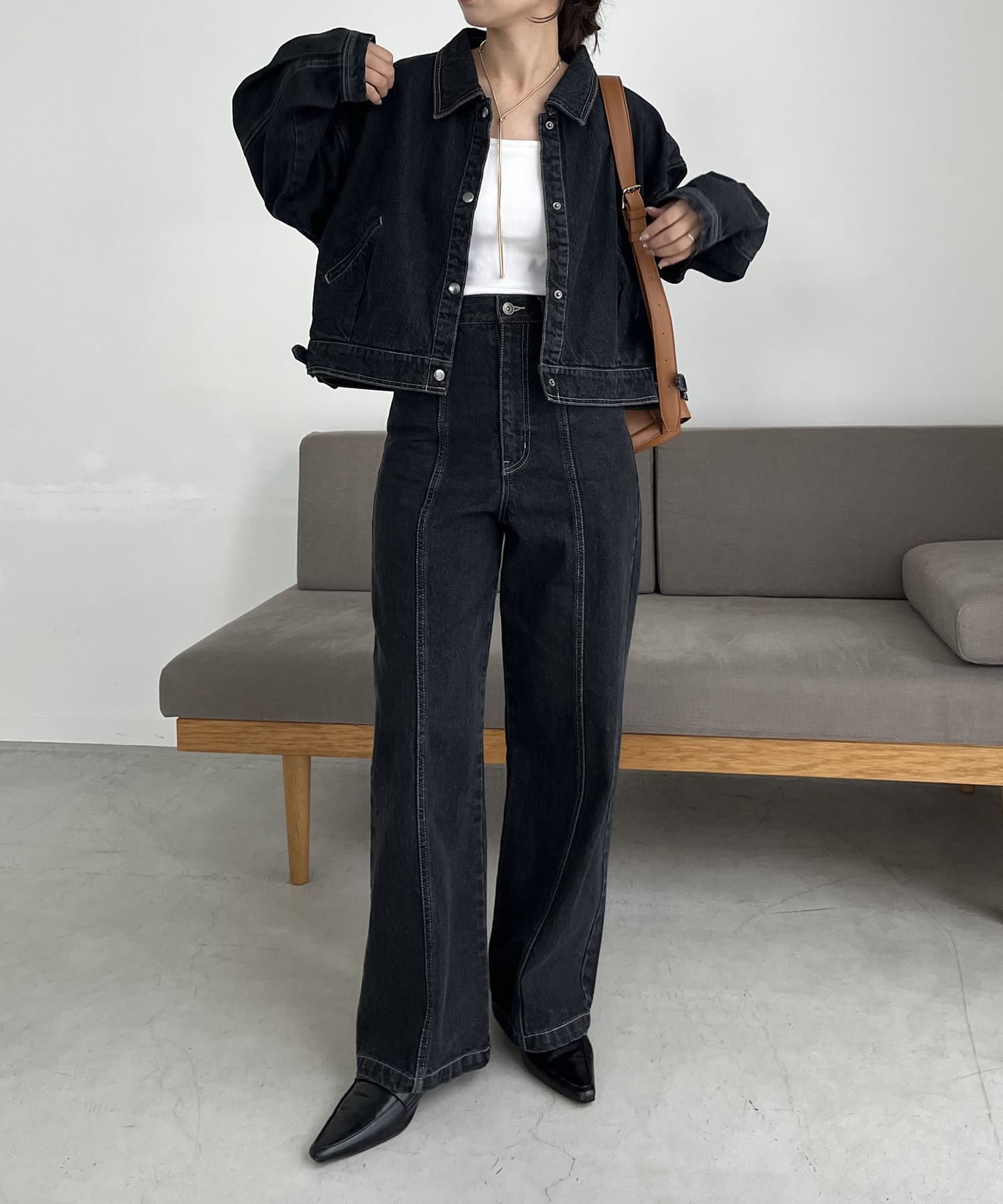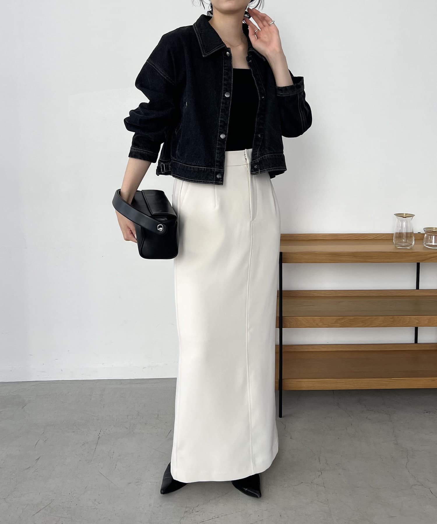 ・2024SSの裾スリットスリムストレートデニム、ロールアップストレートデニム、デニムホックビスチェのBLACKとセットで着られる