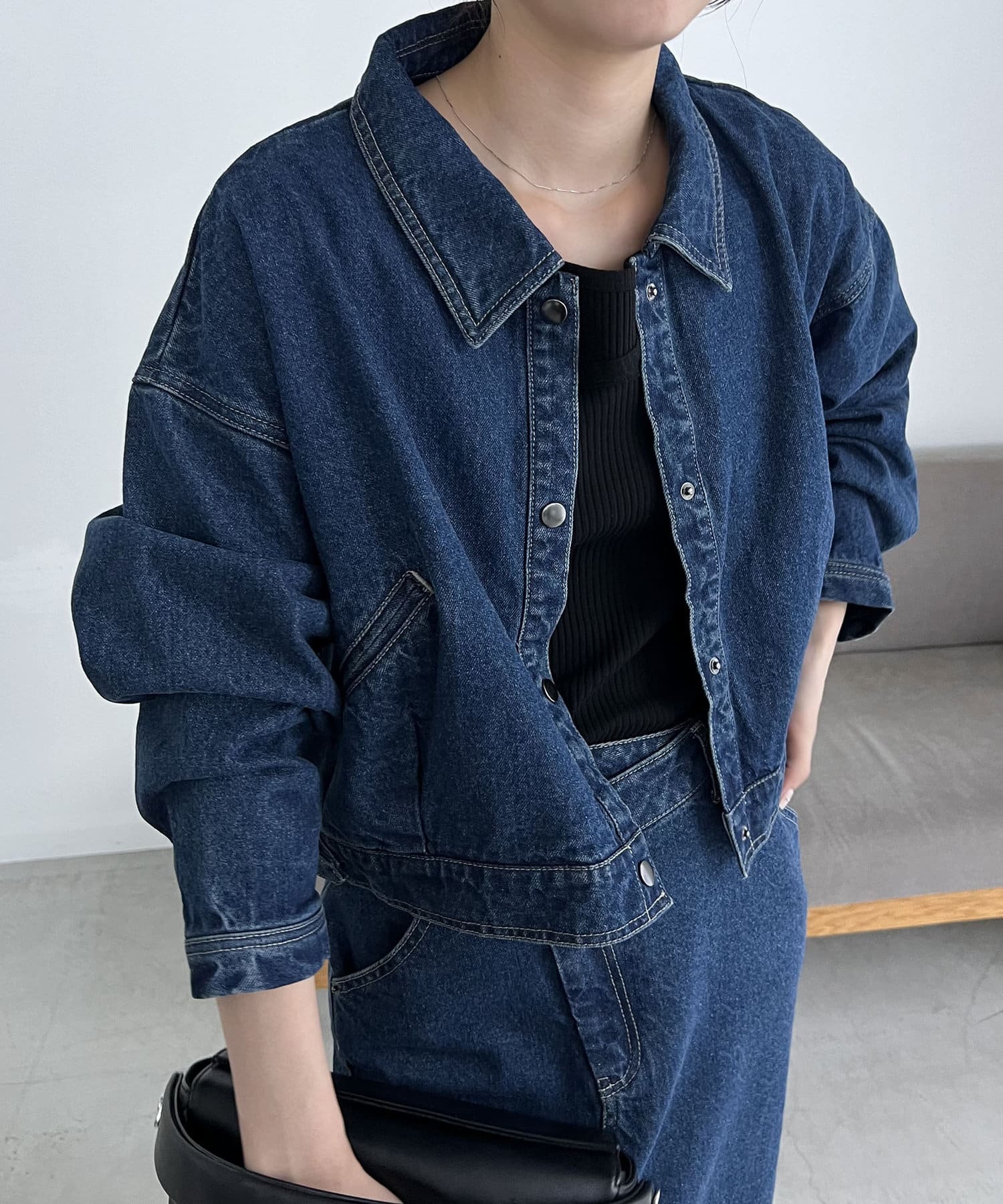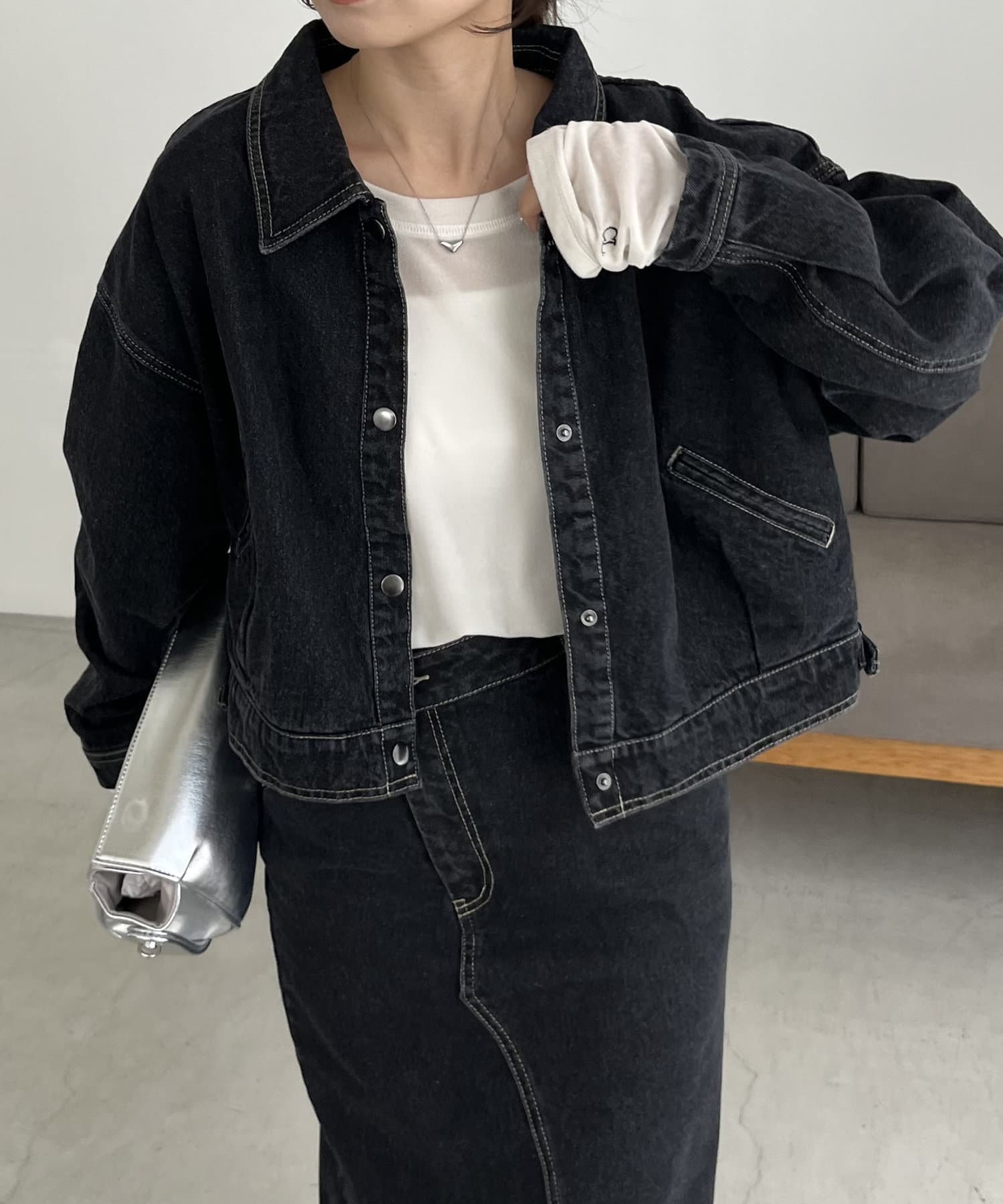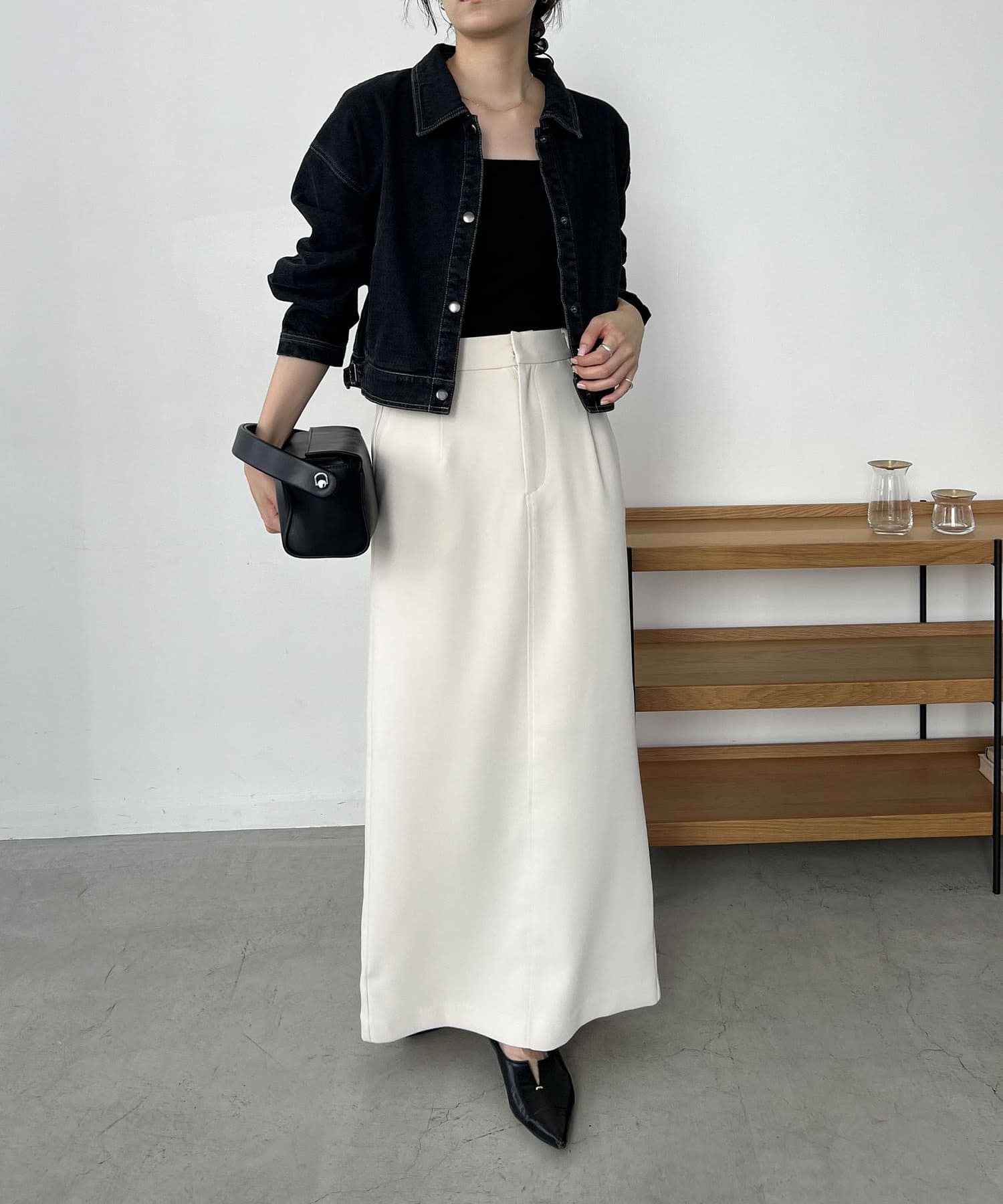 ・2024SSの裾スリットスリムストレートデニム、ロールアップストレートデニム、デニムホックビスチェのBLACKとセットで着られる