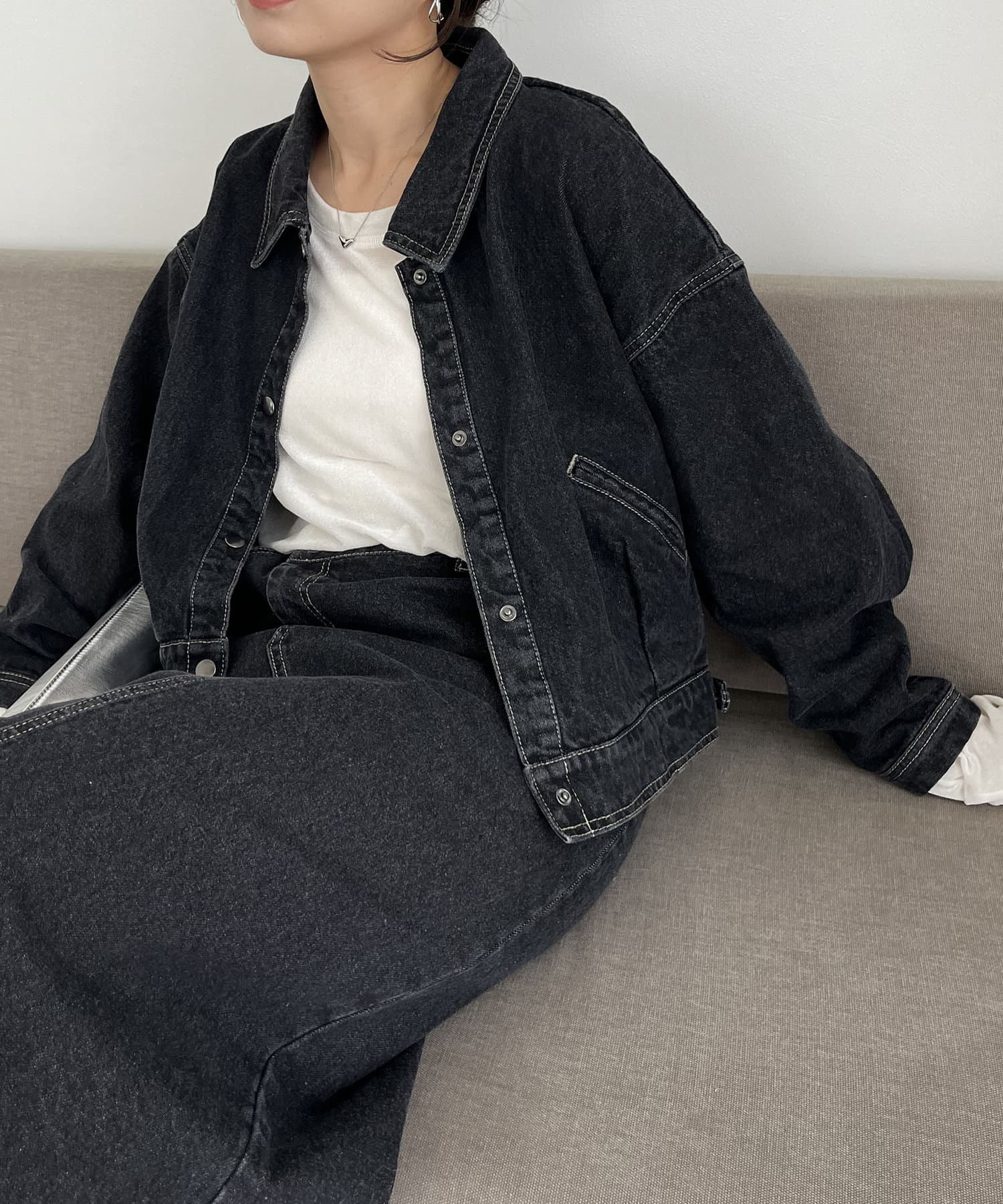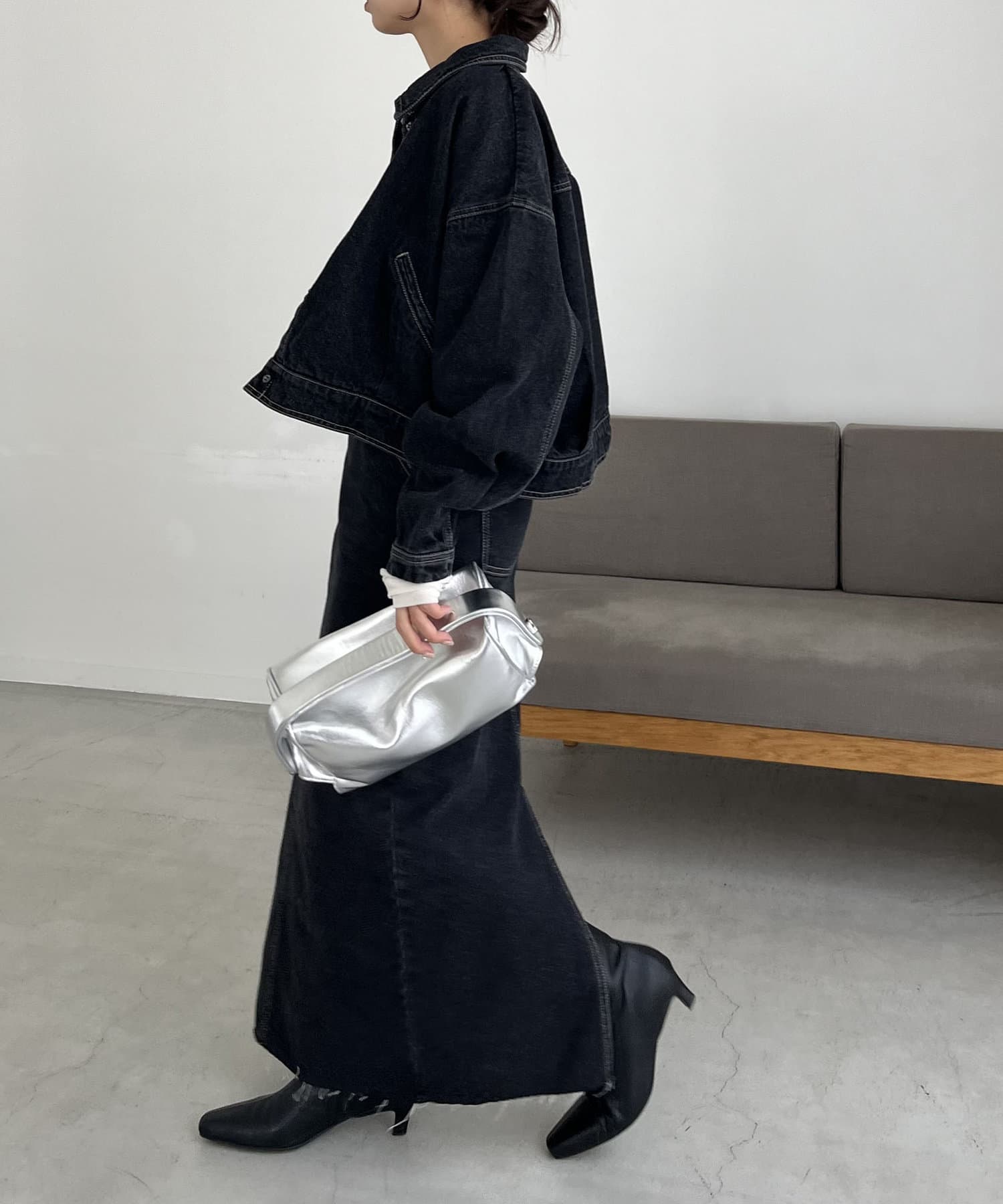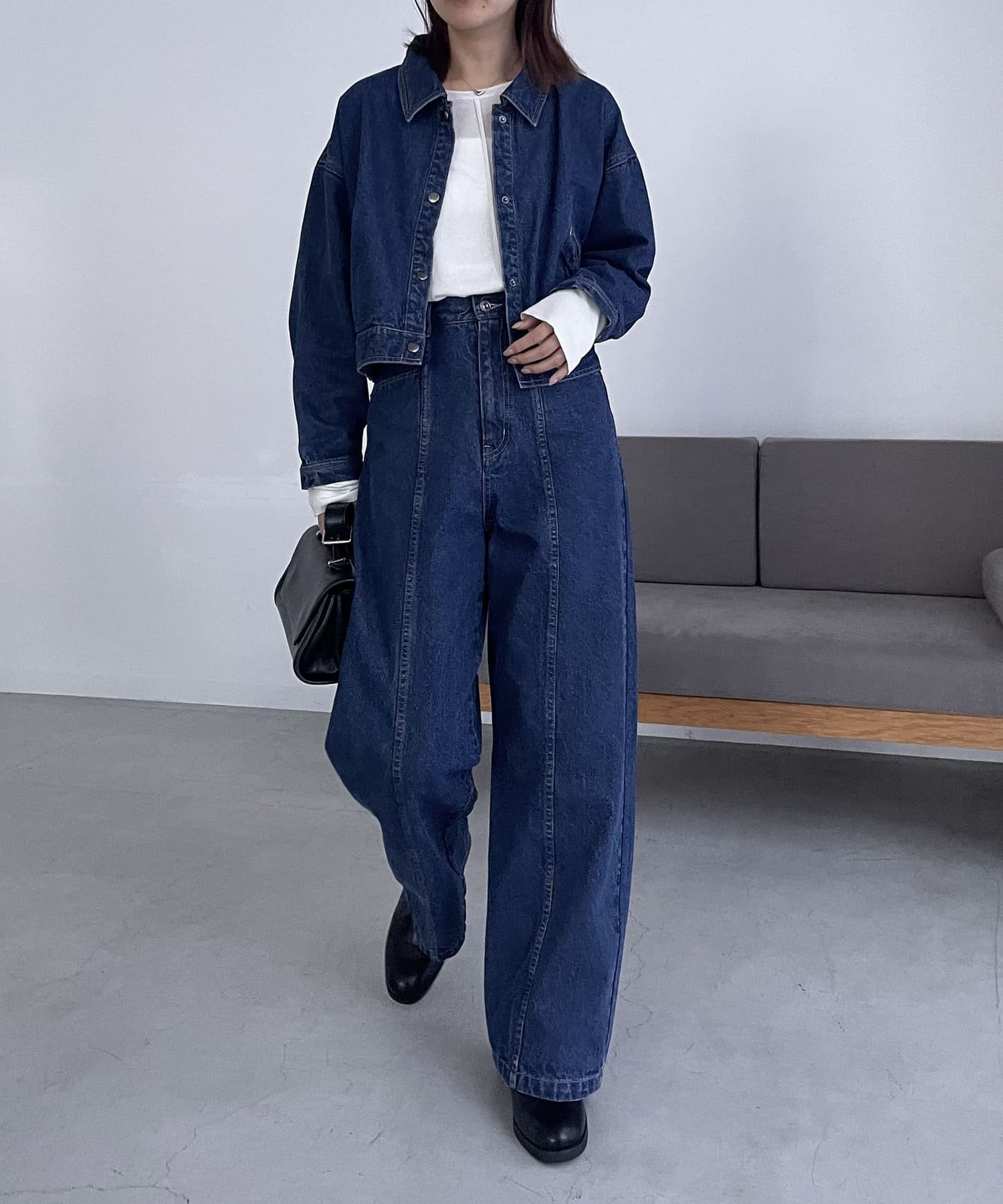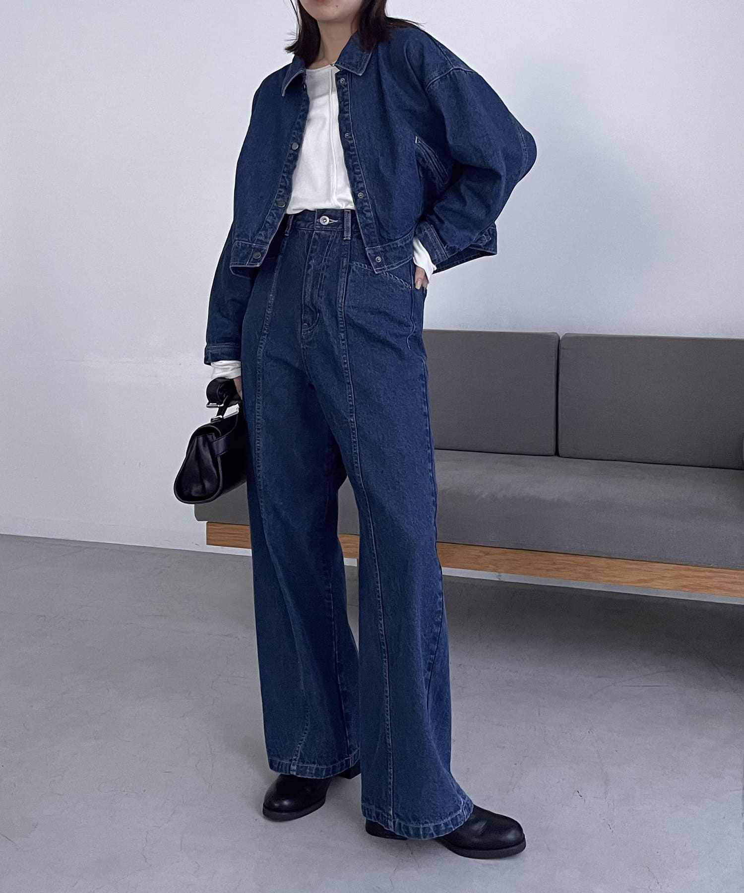 ・2024SSの裾スリットスリムストレートデニム、ロールアップストレートデニム、デニムホックビスチェのBLACKとセットで着られる