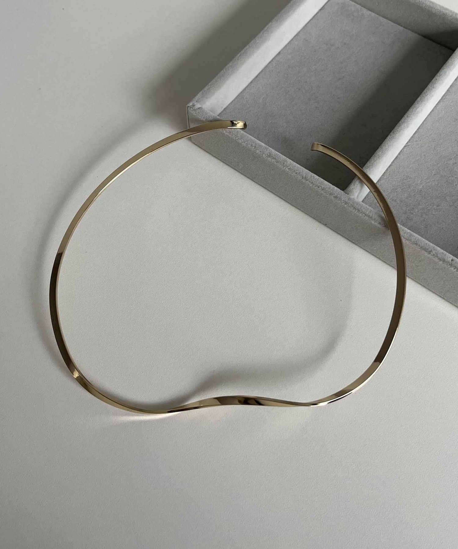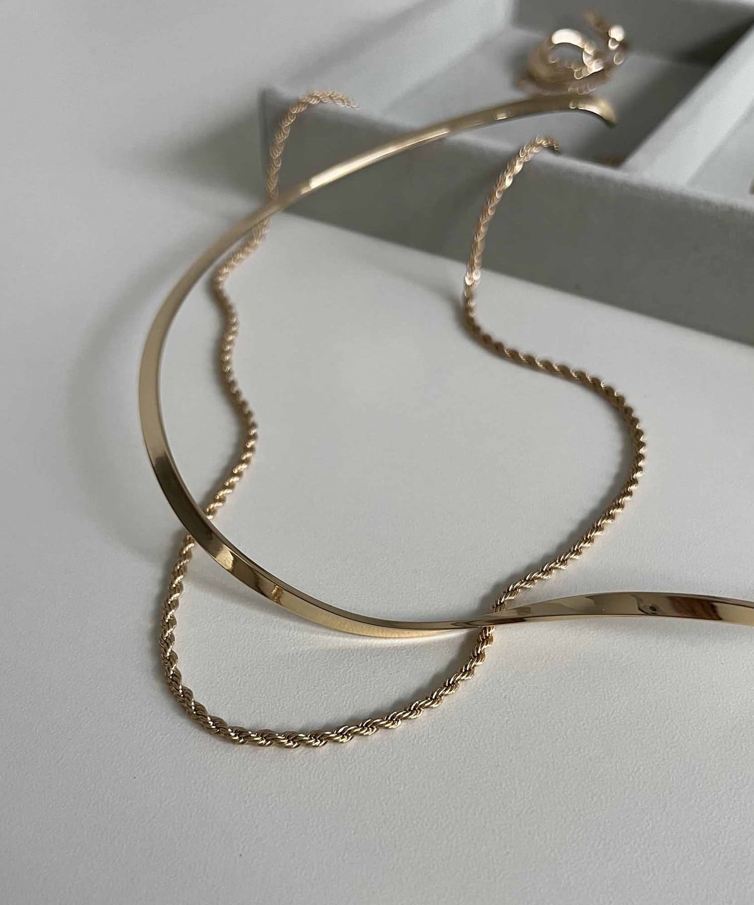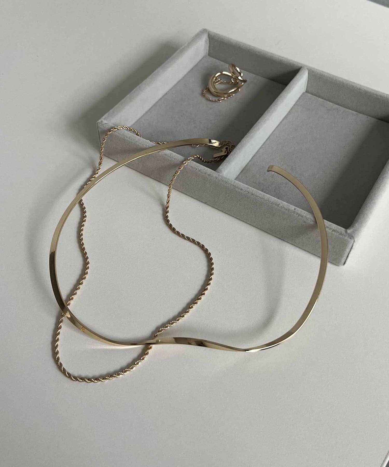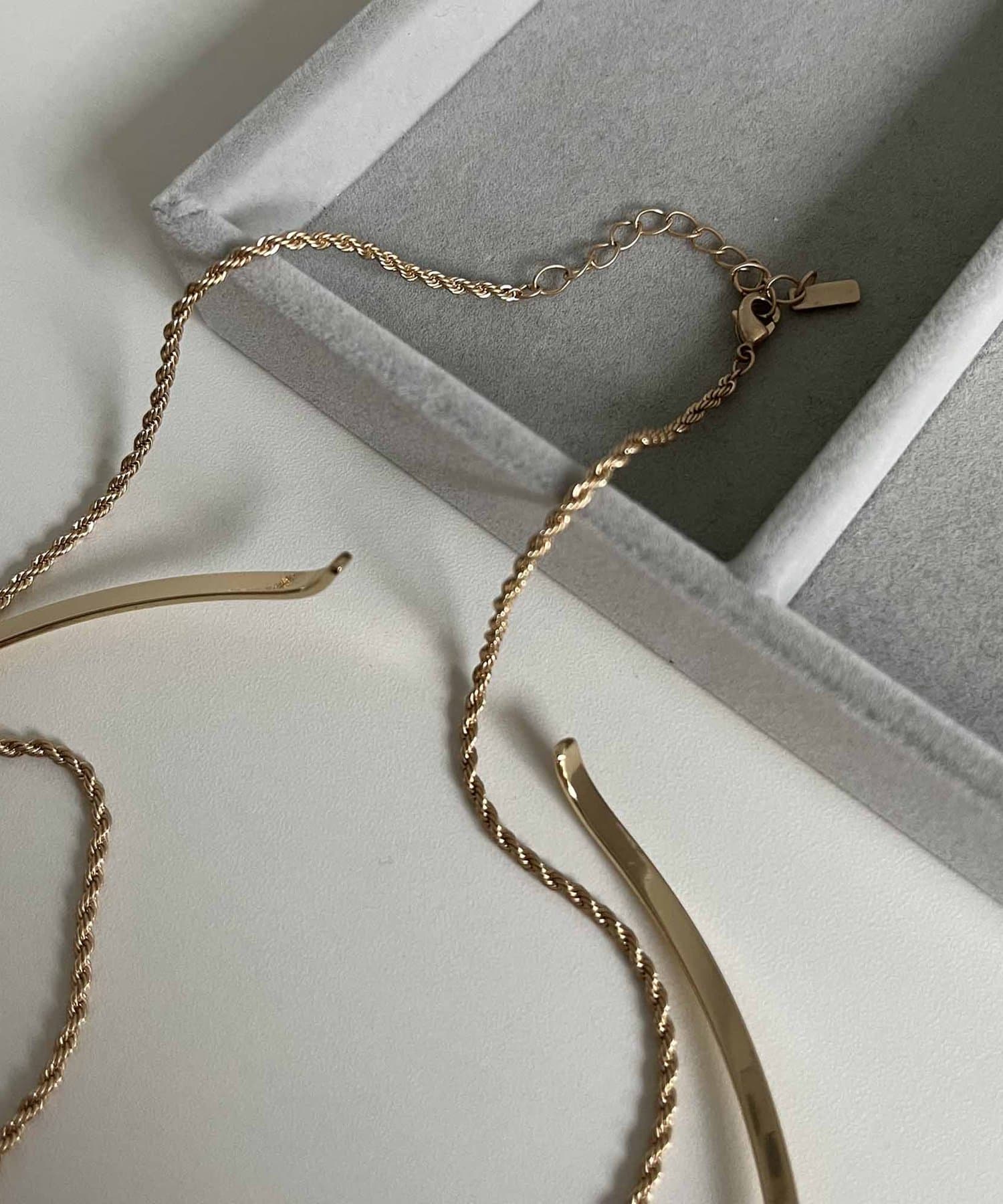 滑らかなラインのネックカフと華奢なチェーンネックレスの2セットアイテム。