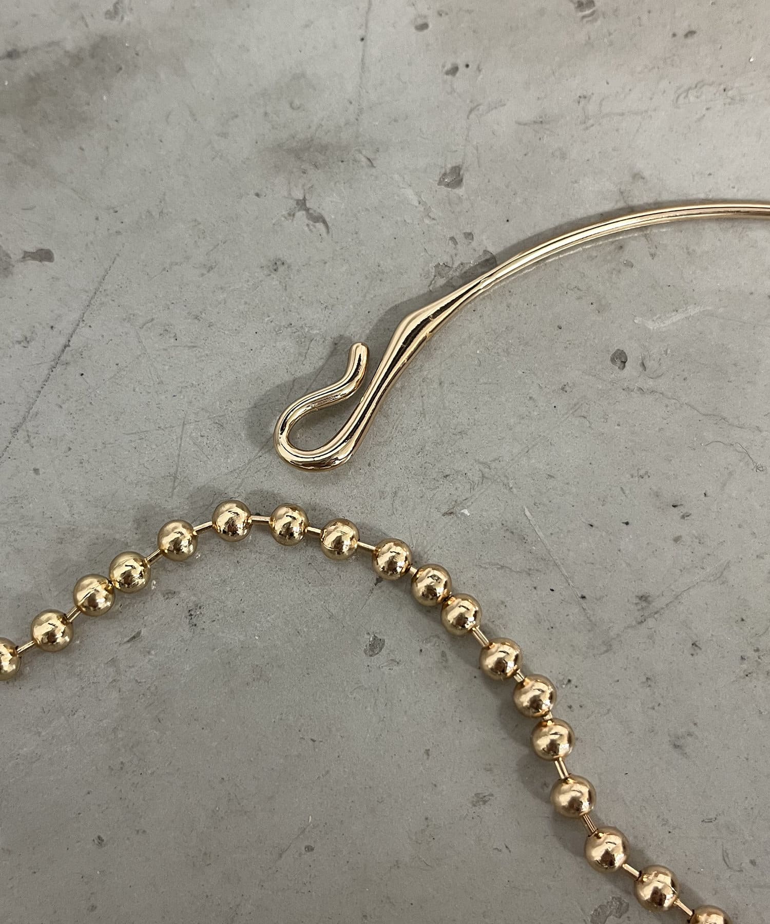 ネックカフとボールチェーンを繋げたアシンメトリーなコンビネーションデザイン。