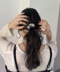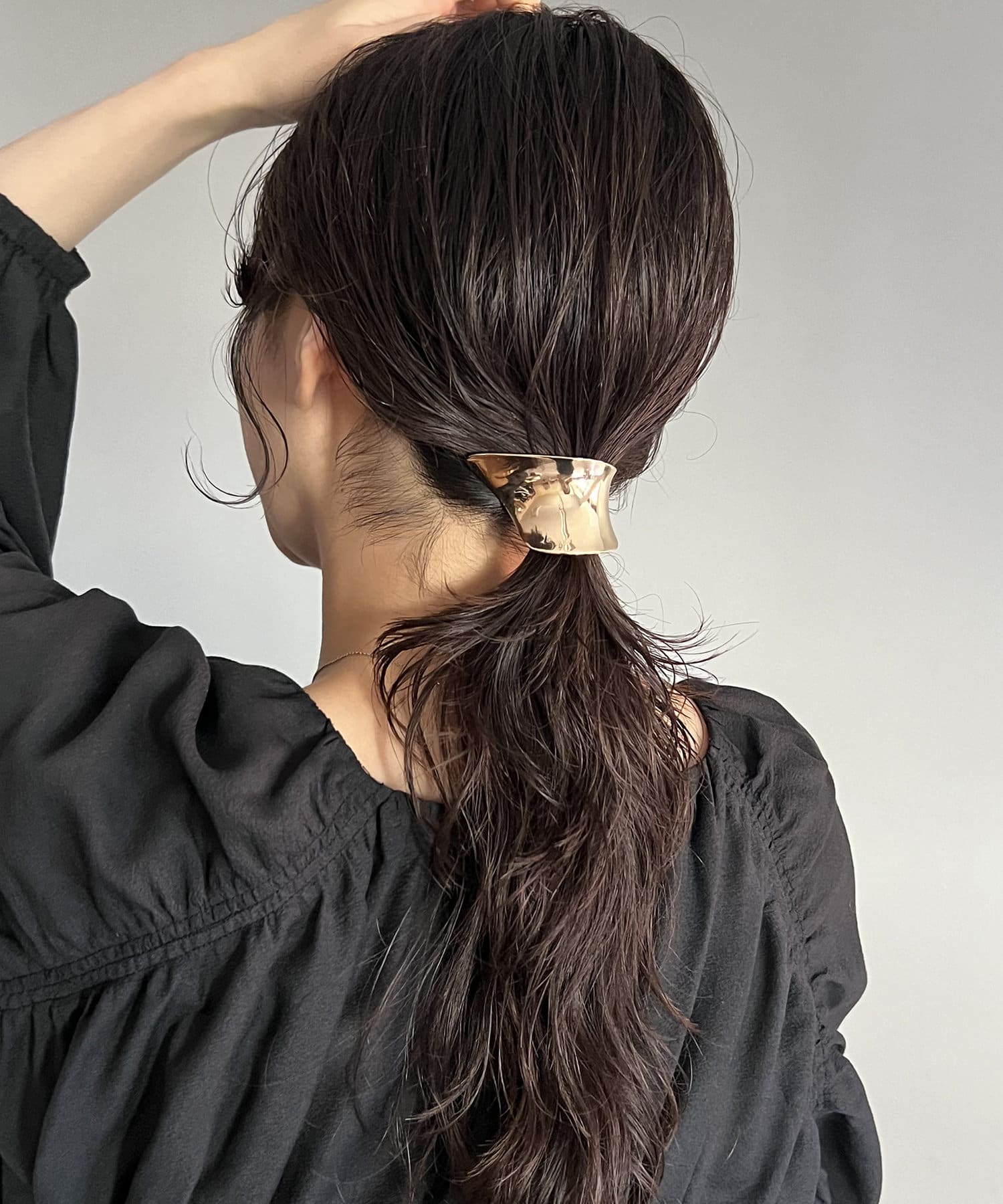 ヘアゴムで髪を結び、そのゴムにフックを引っ掛けるだけで決まるヘアカフ。