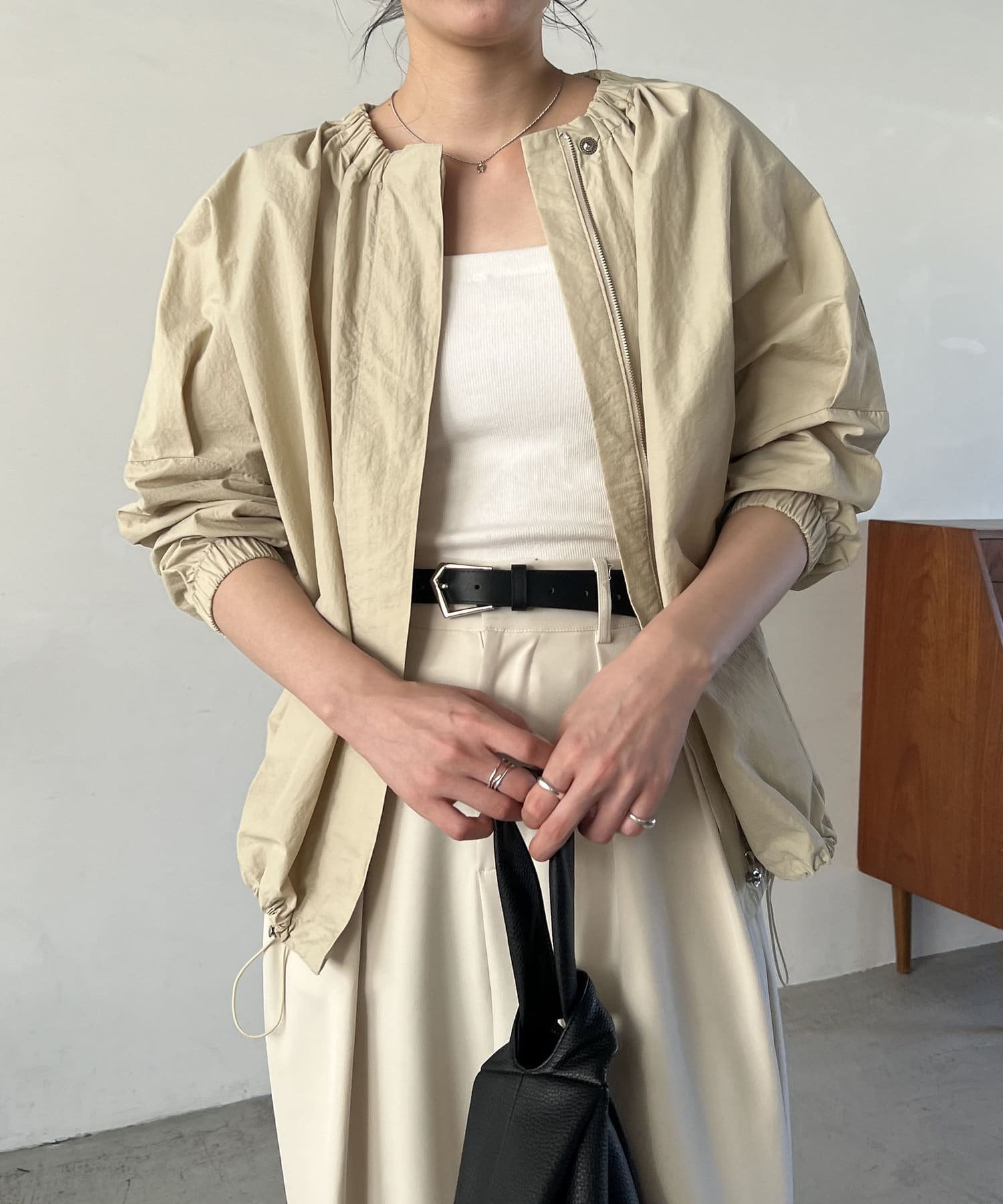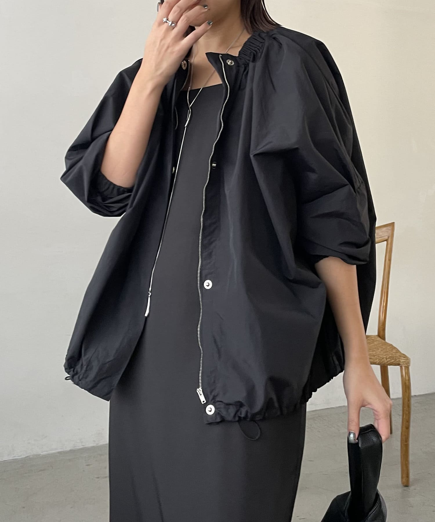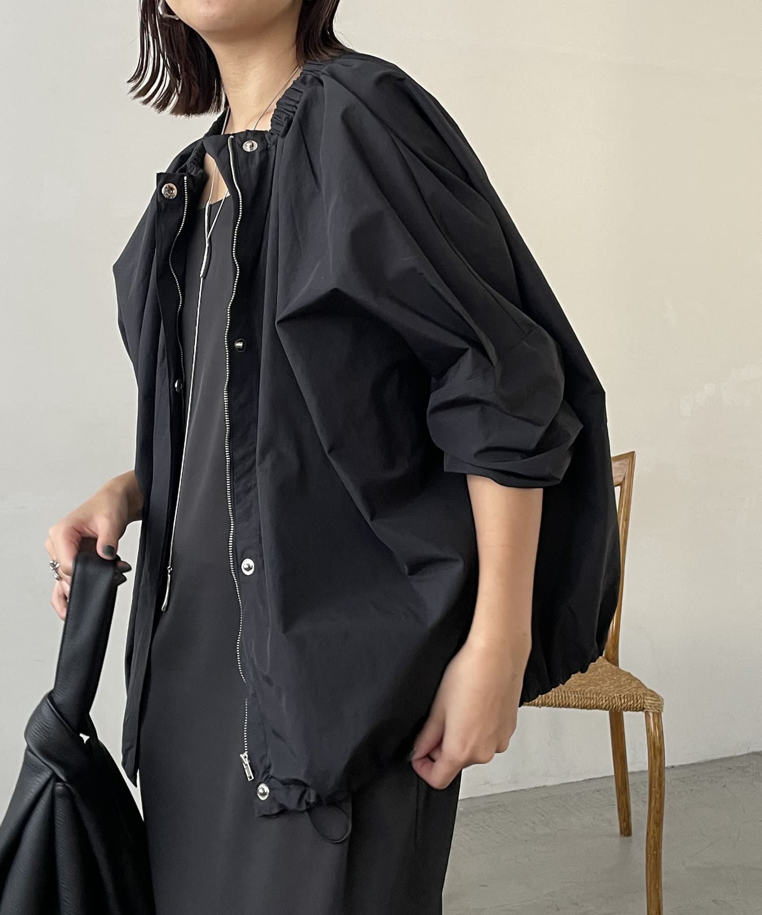 ネック部分のギャザーがポイントのナイロンブルゾン