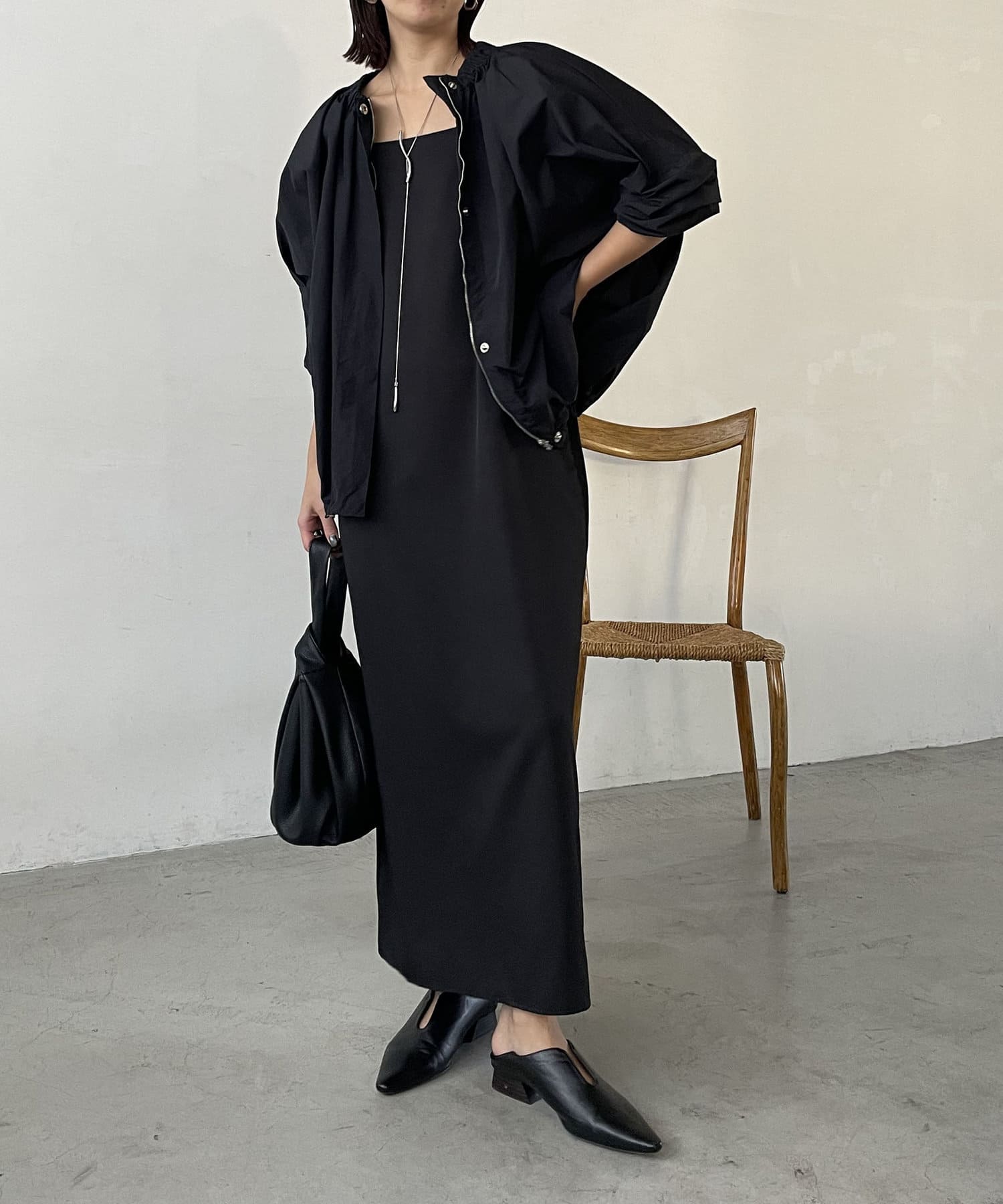 ・ネックのギャザーが立体的なシルエットに