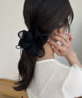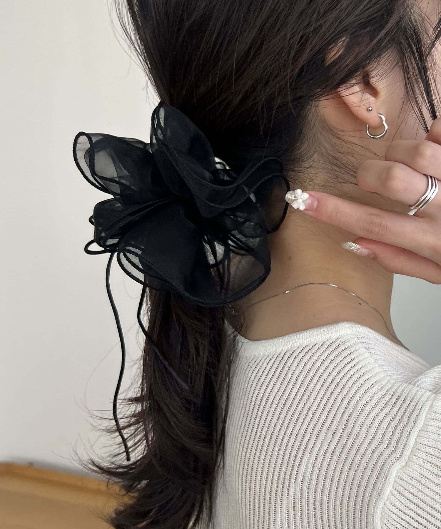チュール生地でボリューミーに仕上げたシュシュに華奢なリボンがアクセントになったデザイン。