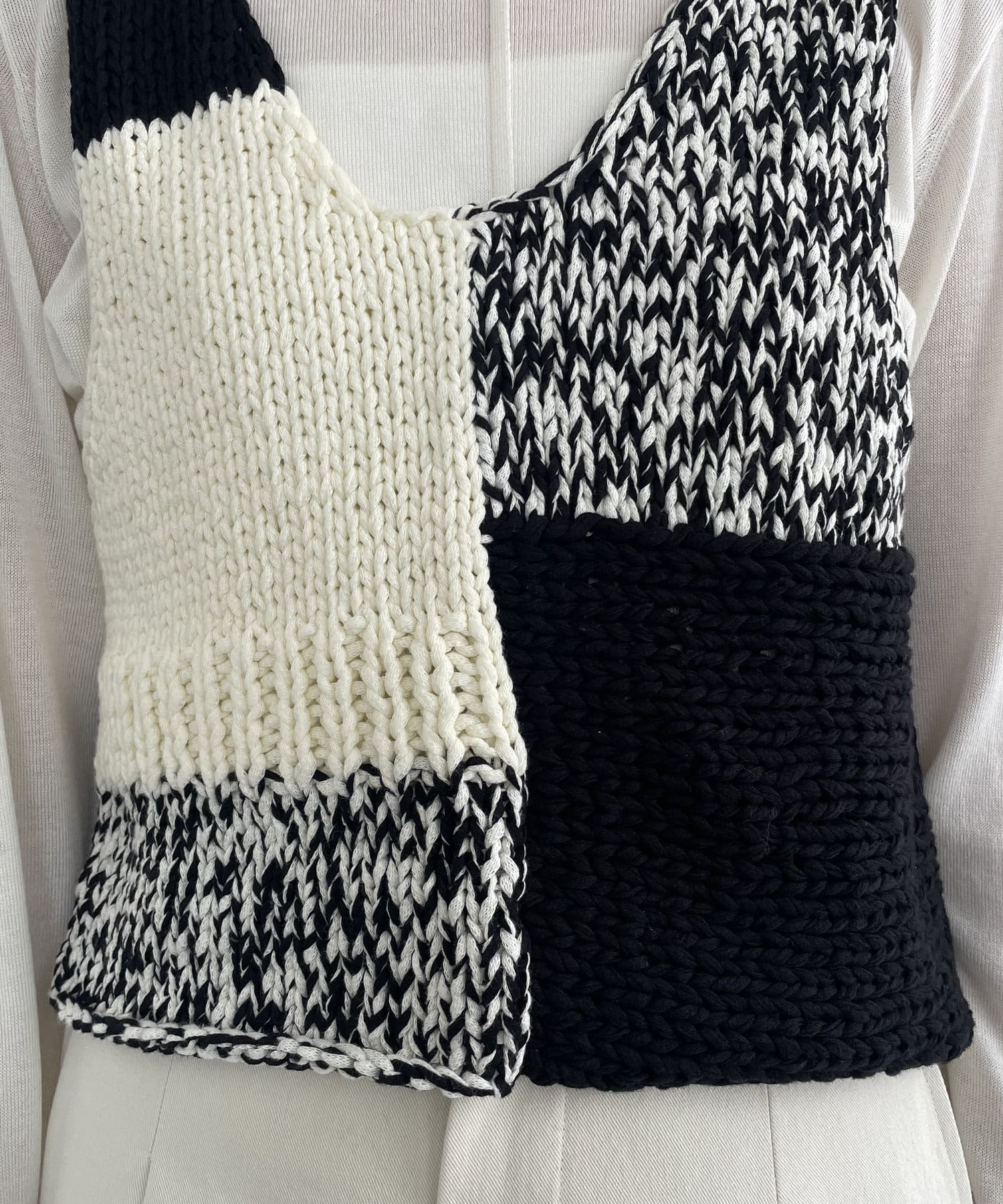 2色の糸と編み地をミックスさせた手編みのパッチワークビスチェ