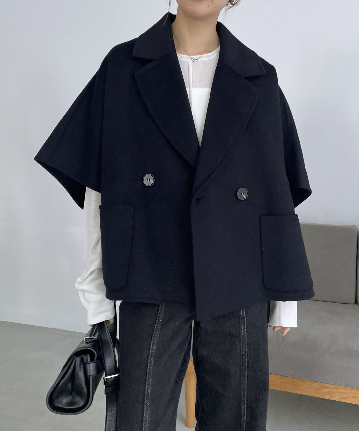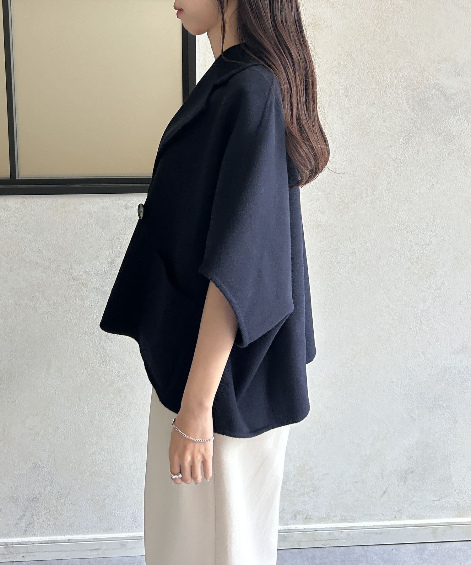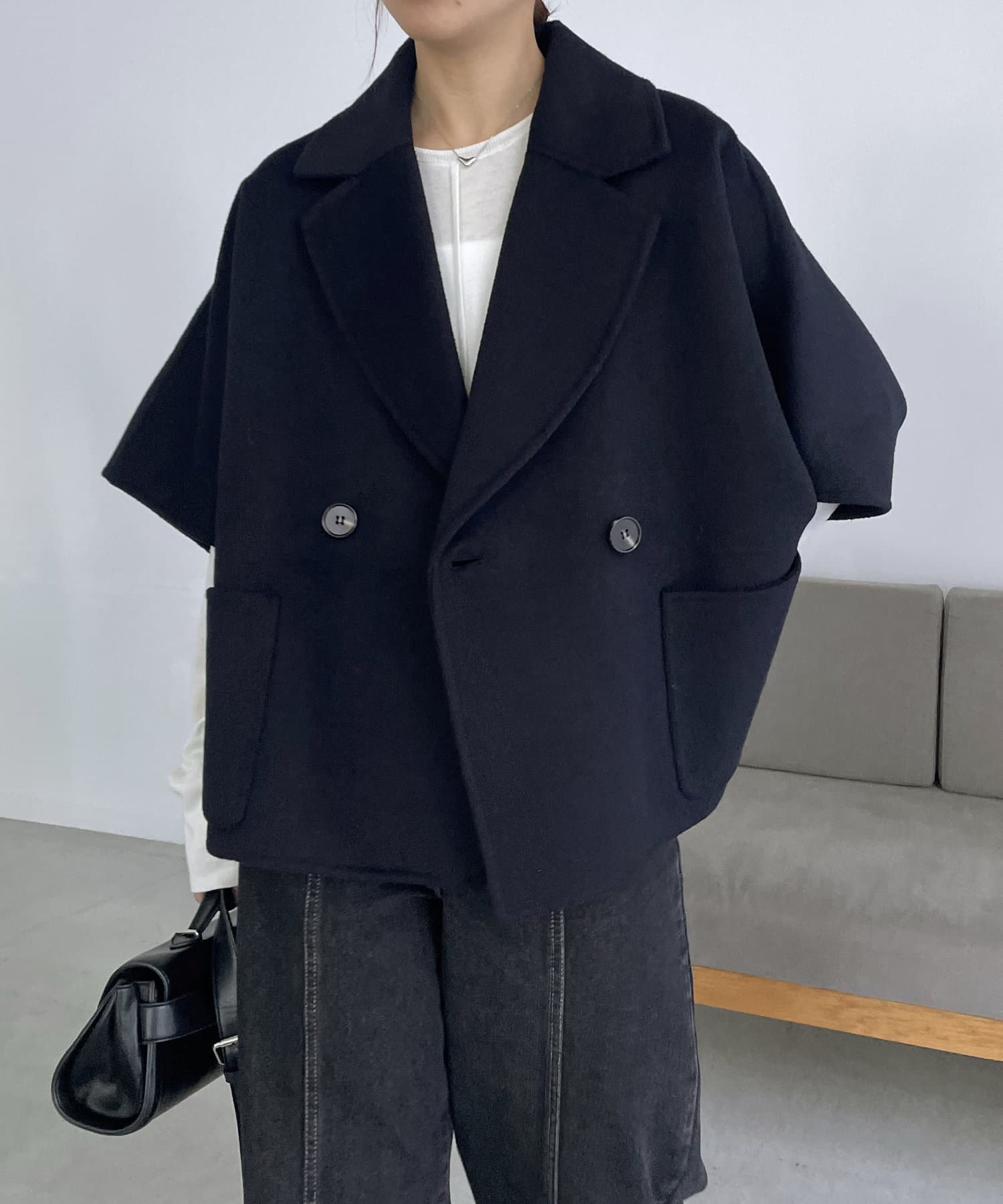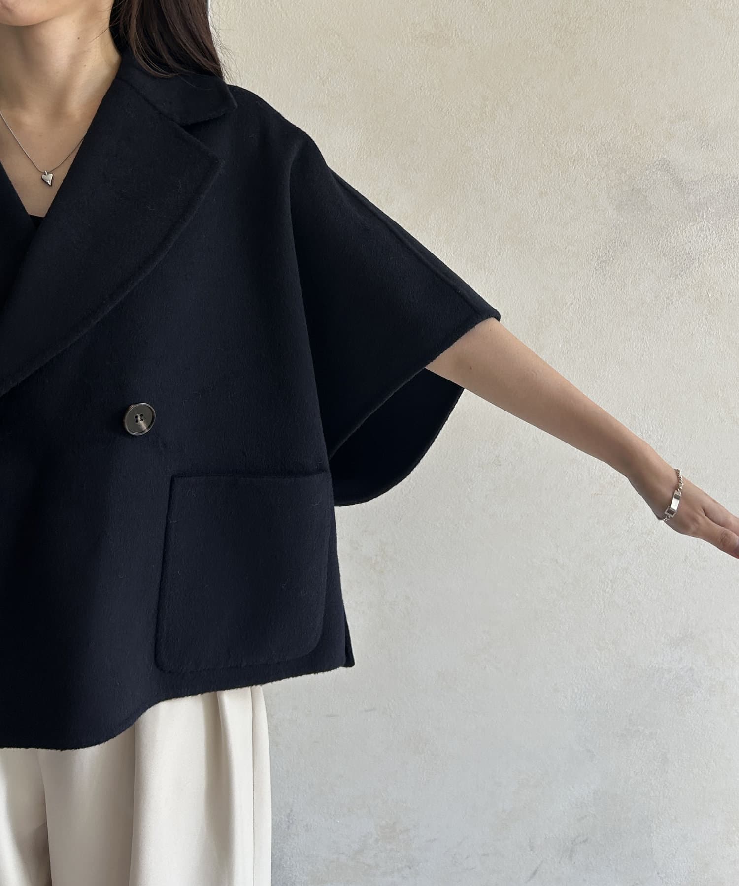 ダブルフェイス生地を使用したケープ型ジャケット