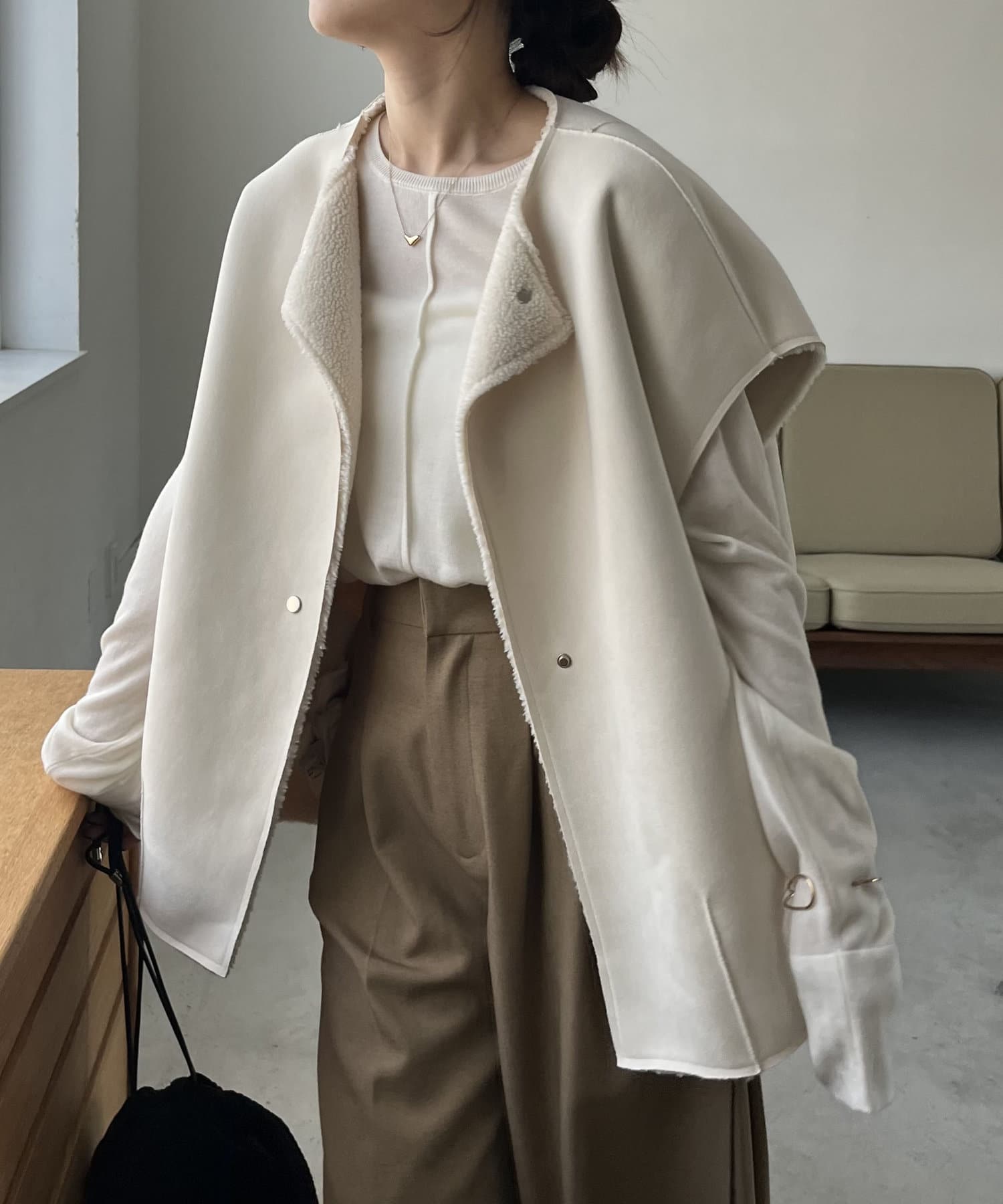 ボアファーとスウェード両面で着られるリバーシブルのムートンジレ