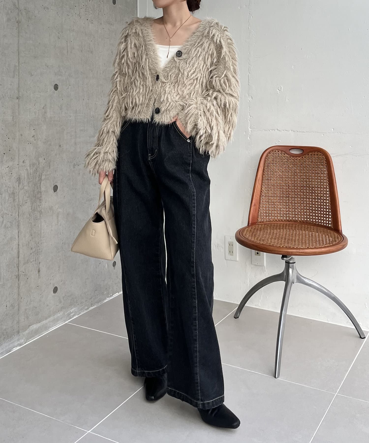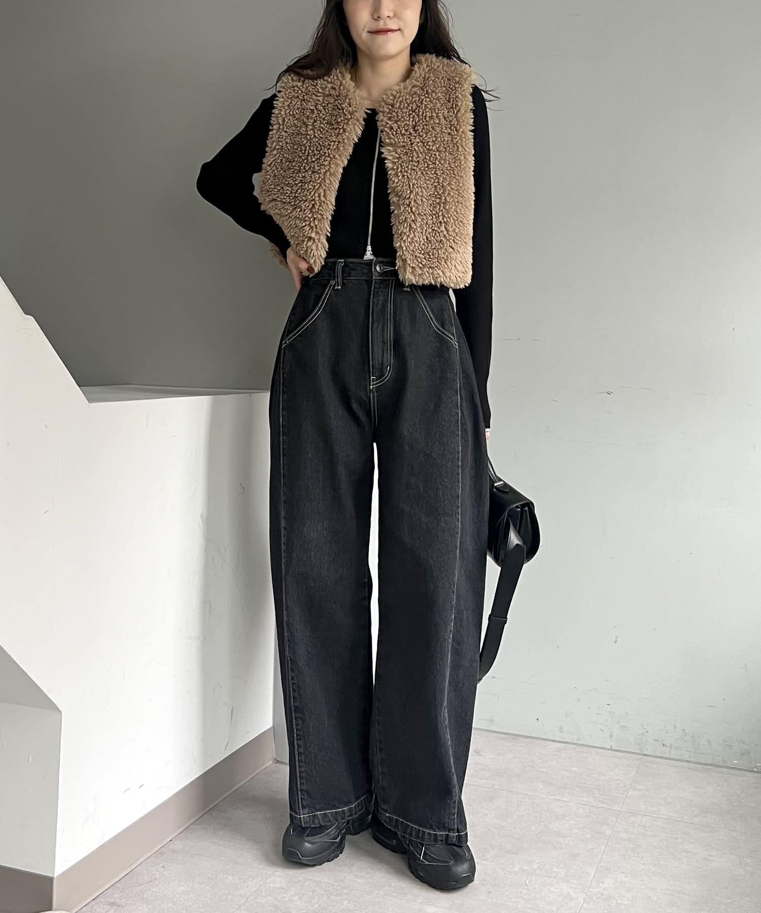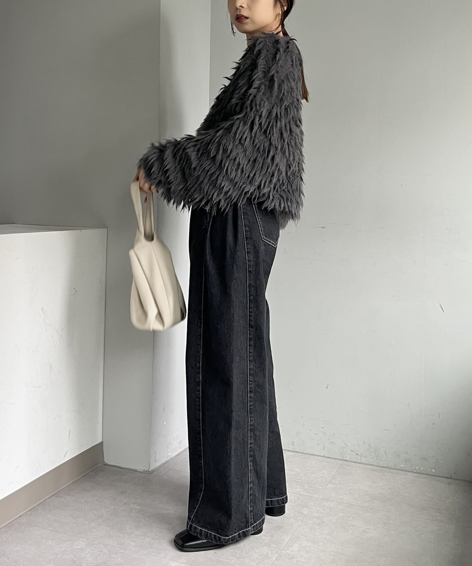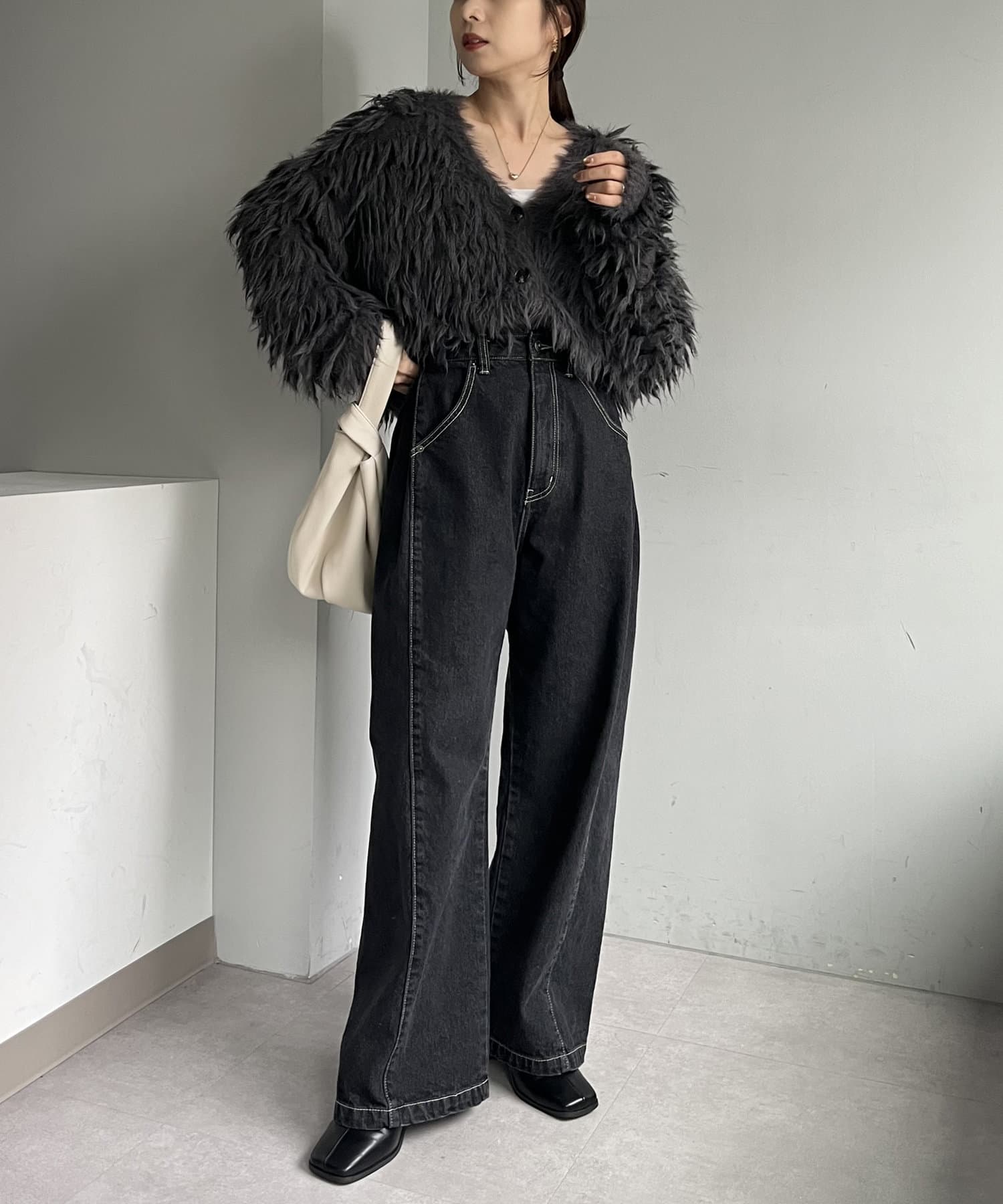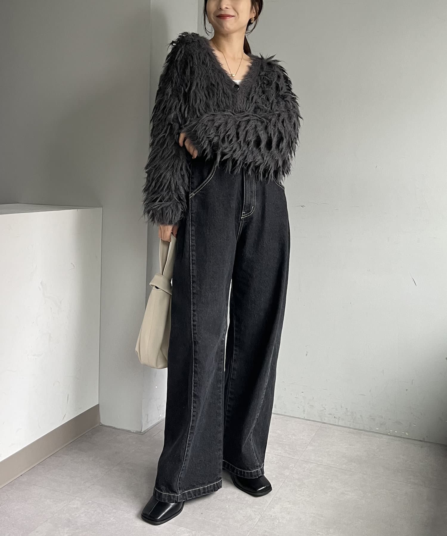 ・2WAYジップニット、カーリーファーベストを合わせたきれいめカジュアルなスタイリングもおすすめ