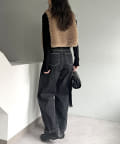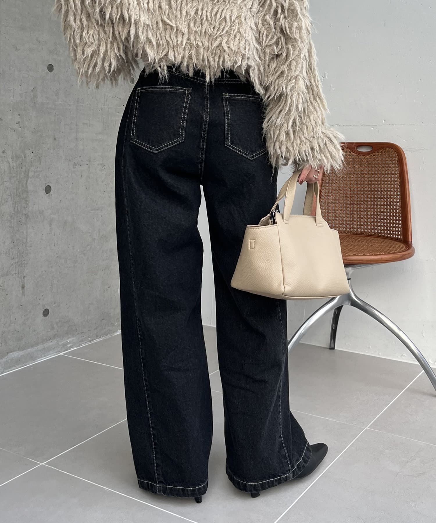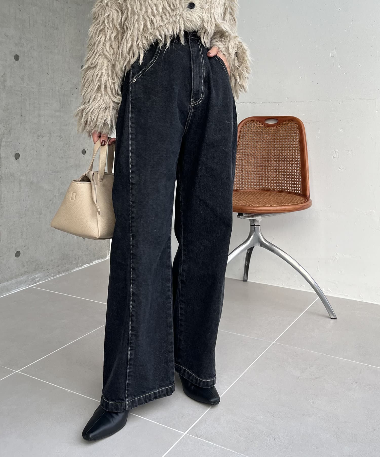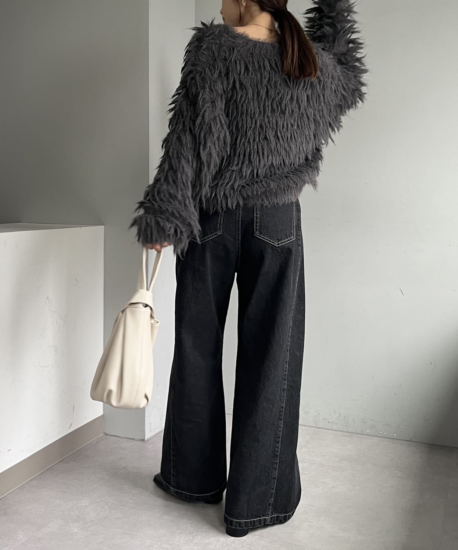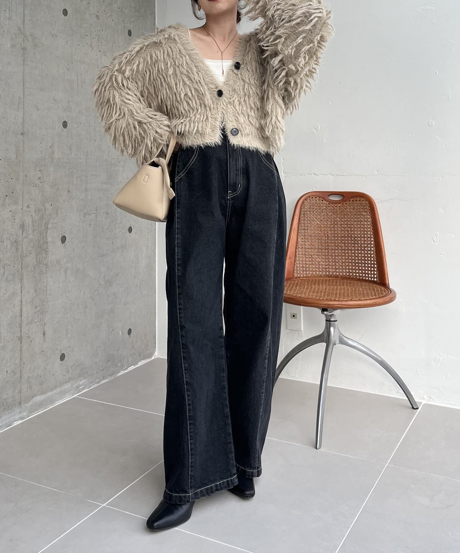 ・2WAYジップニット、カーリーファーベストを合わせたきれいめカジュアルなスタイリングもおすすめ