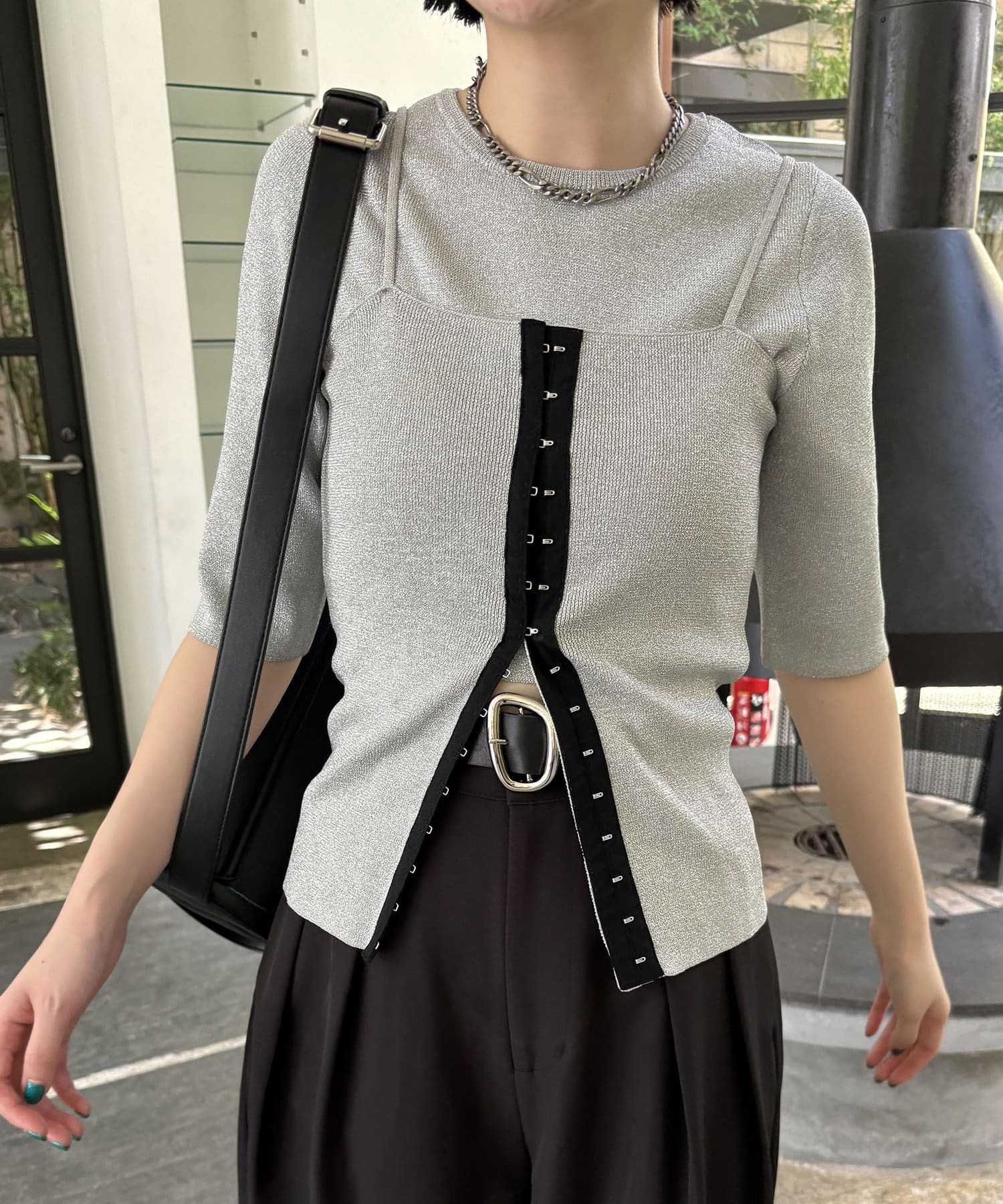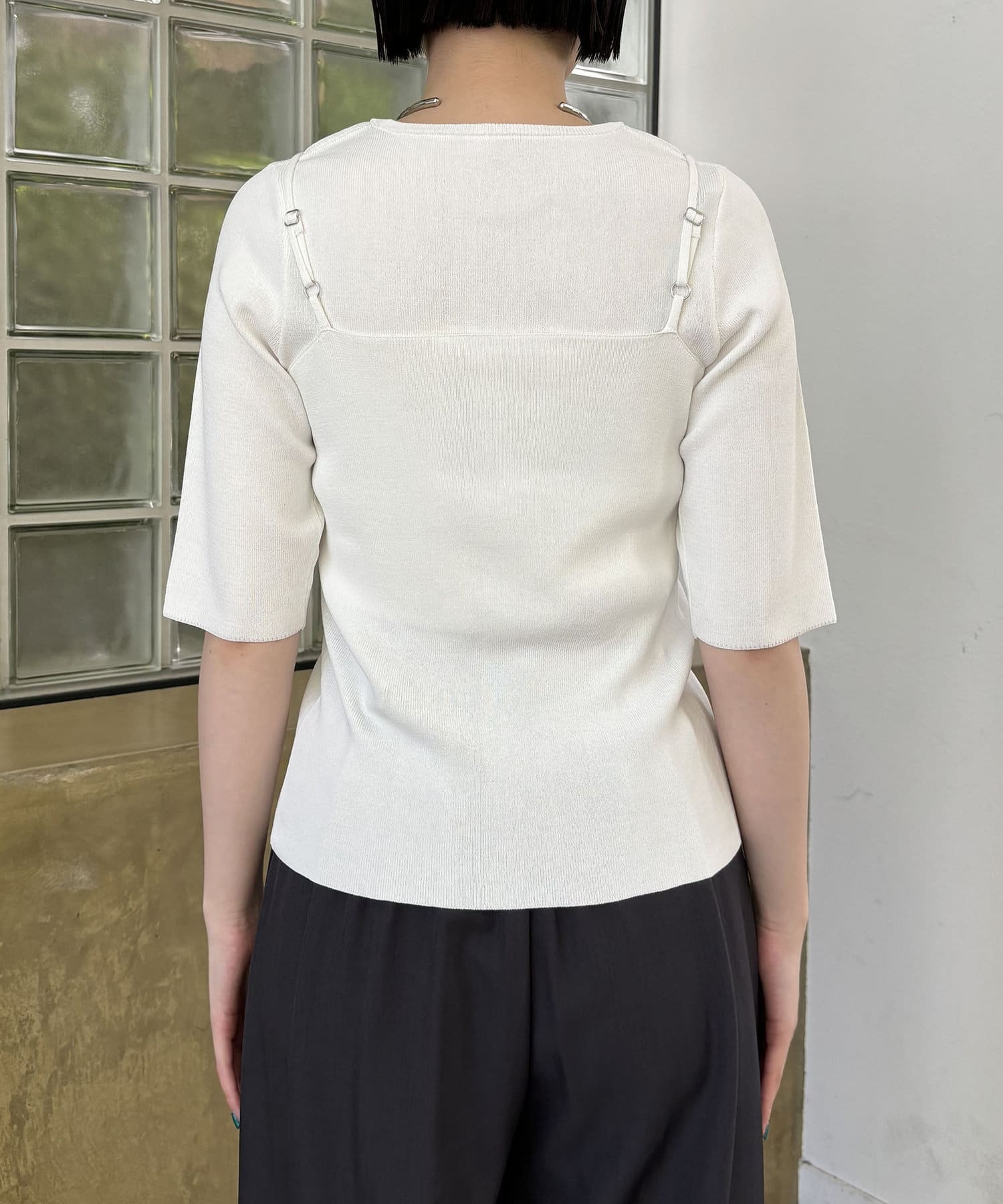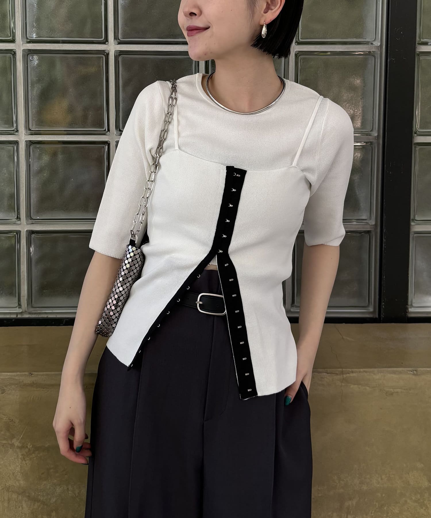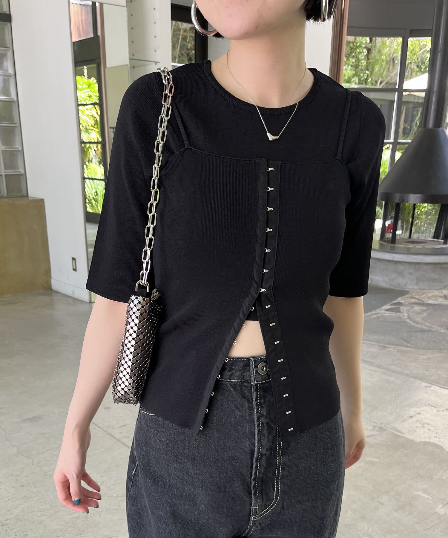 ・トレンドライクな短丈トップスと前開きキャミのレイヤードニット