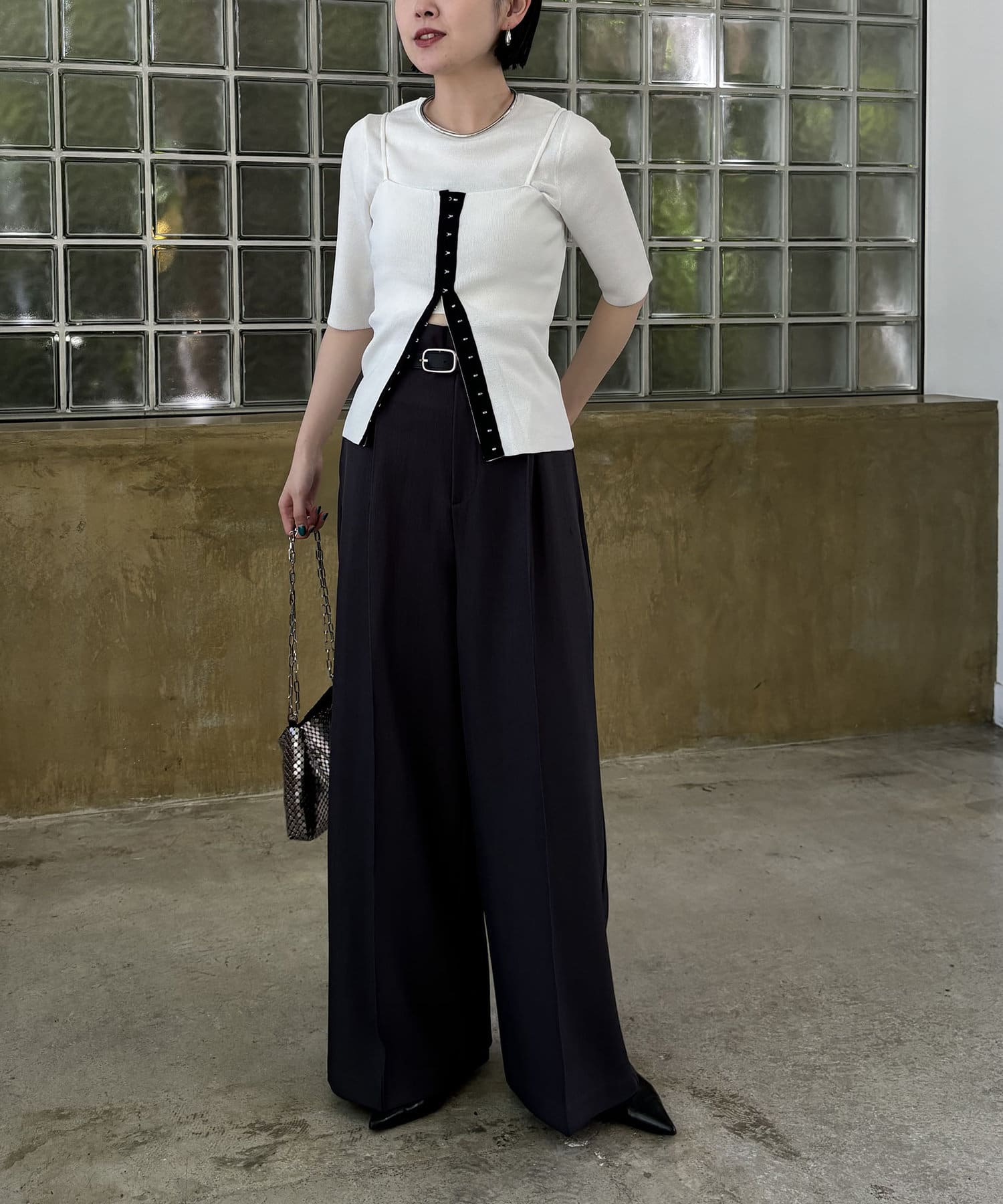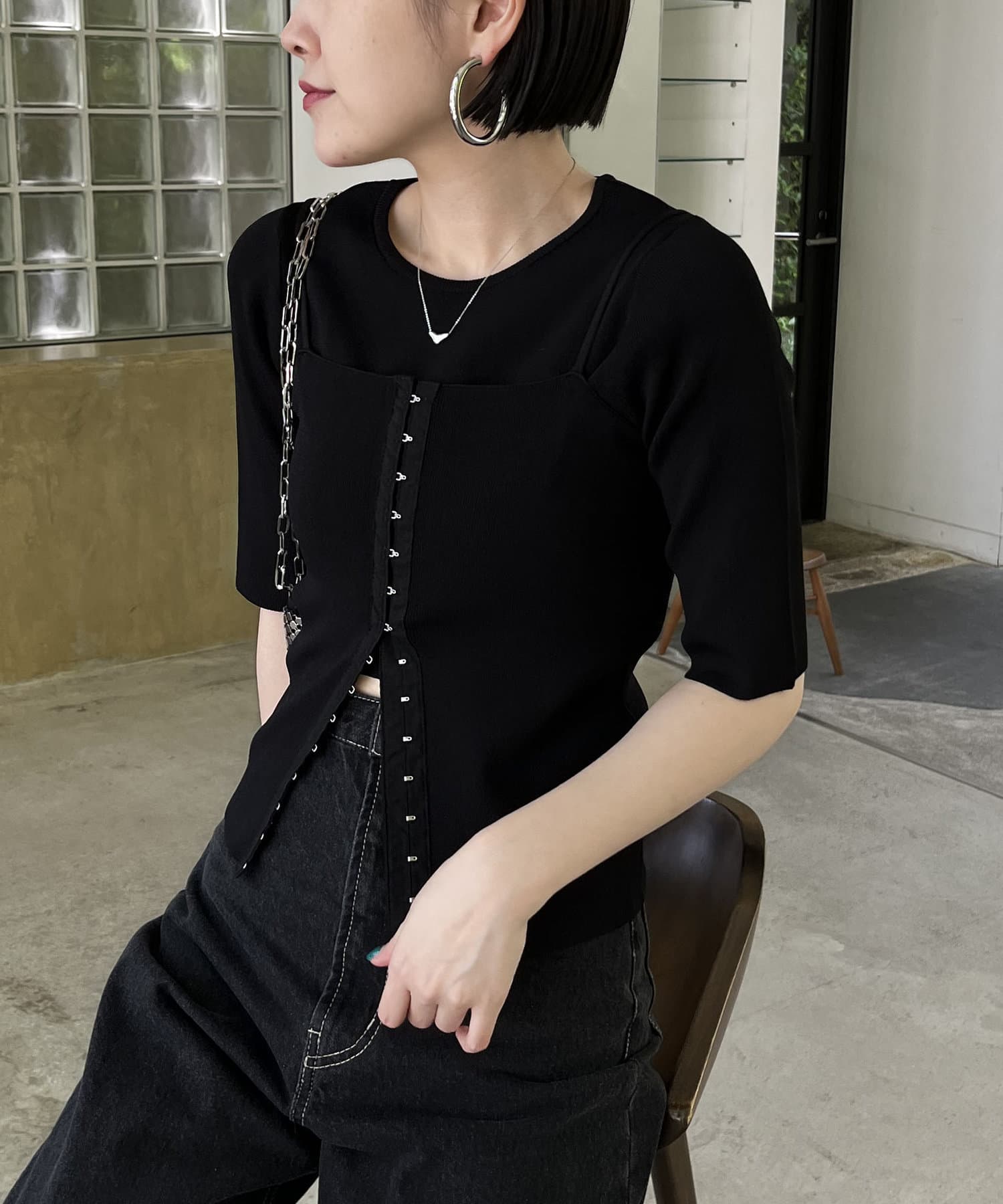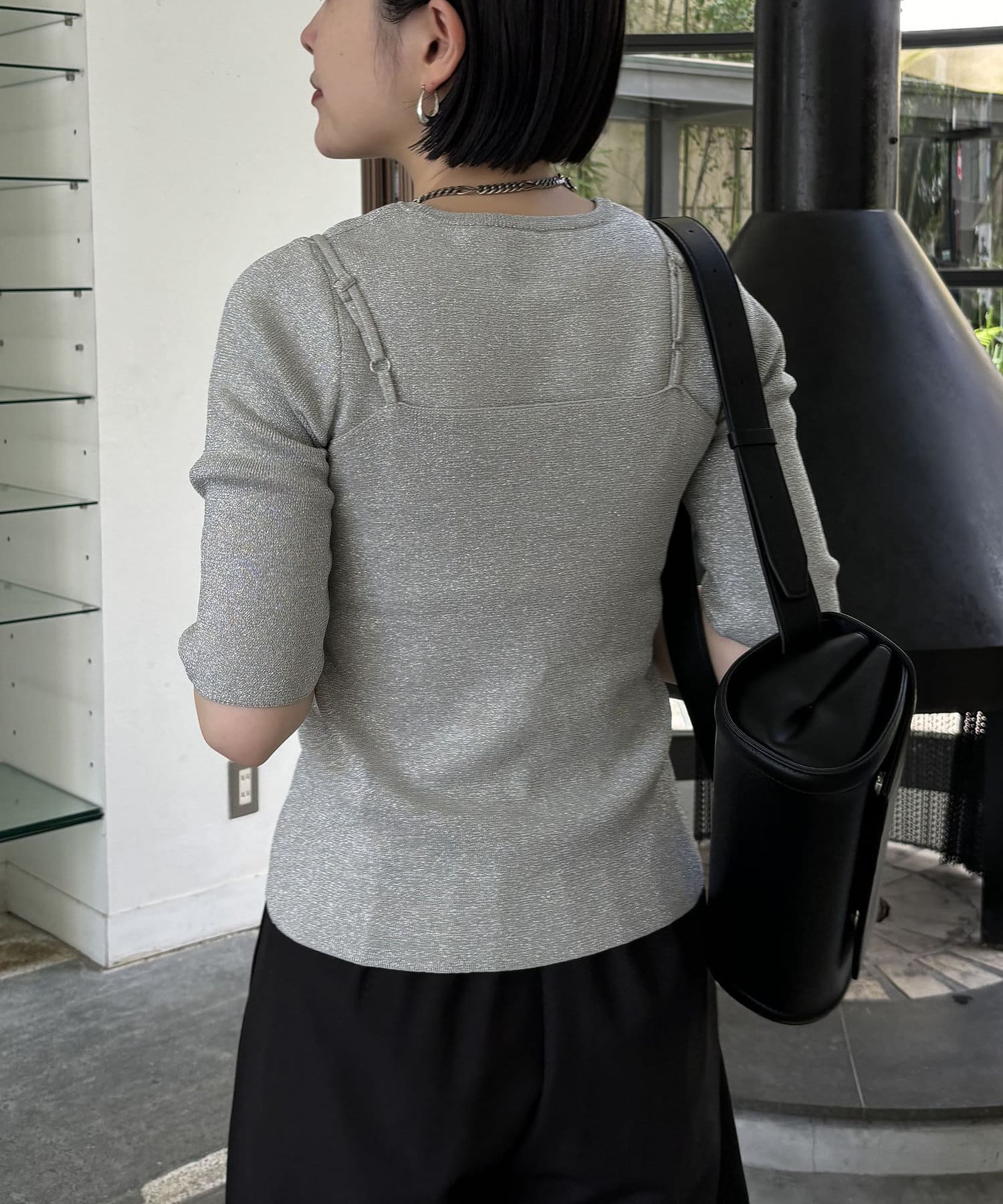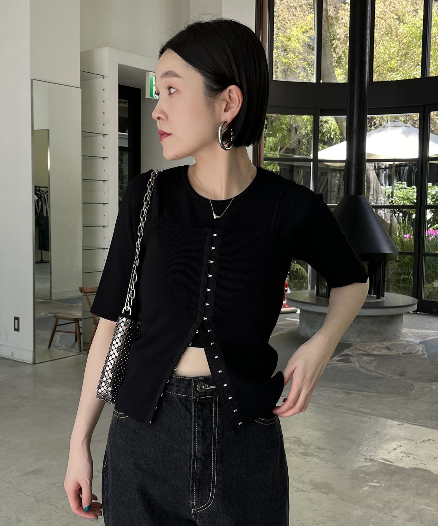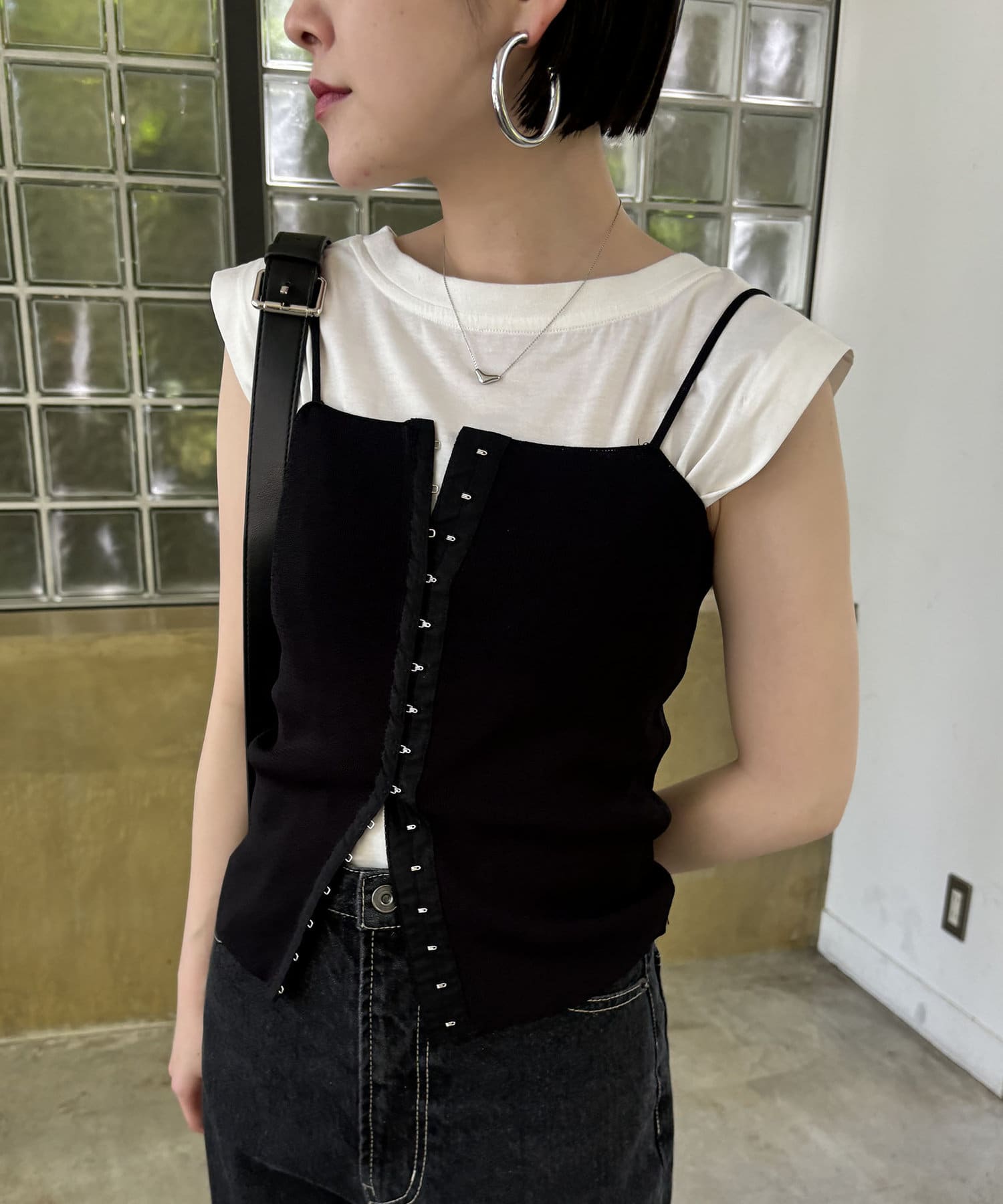 ・トレンドライクな短丈トップスと前開きキャミのレイヤードニット